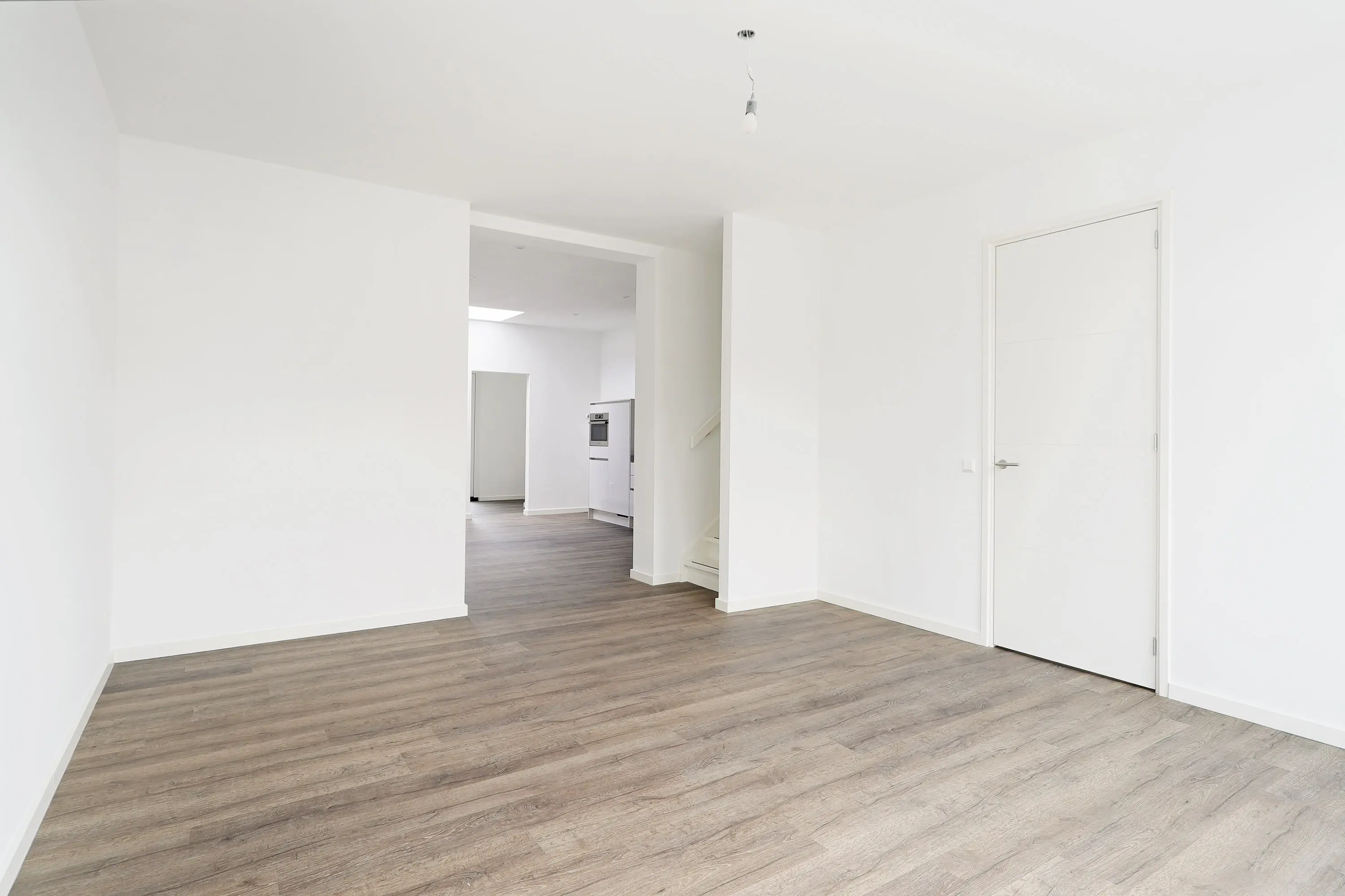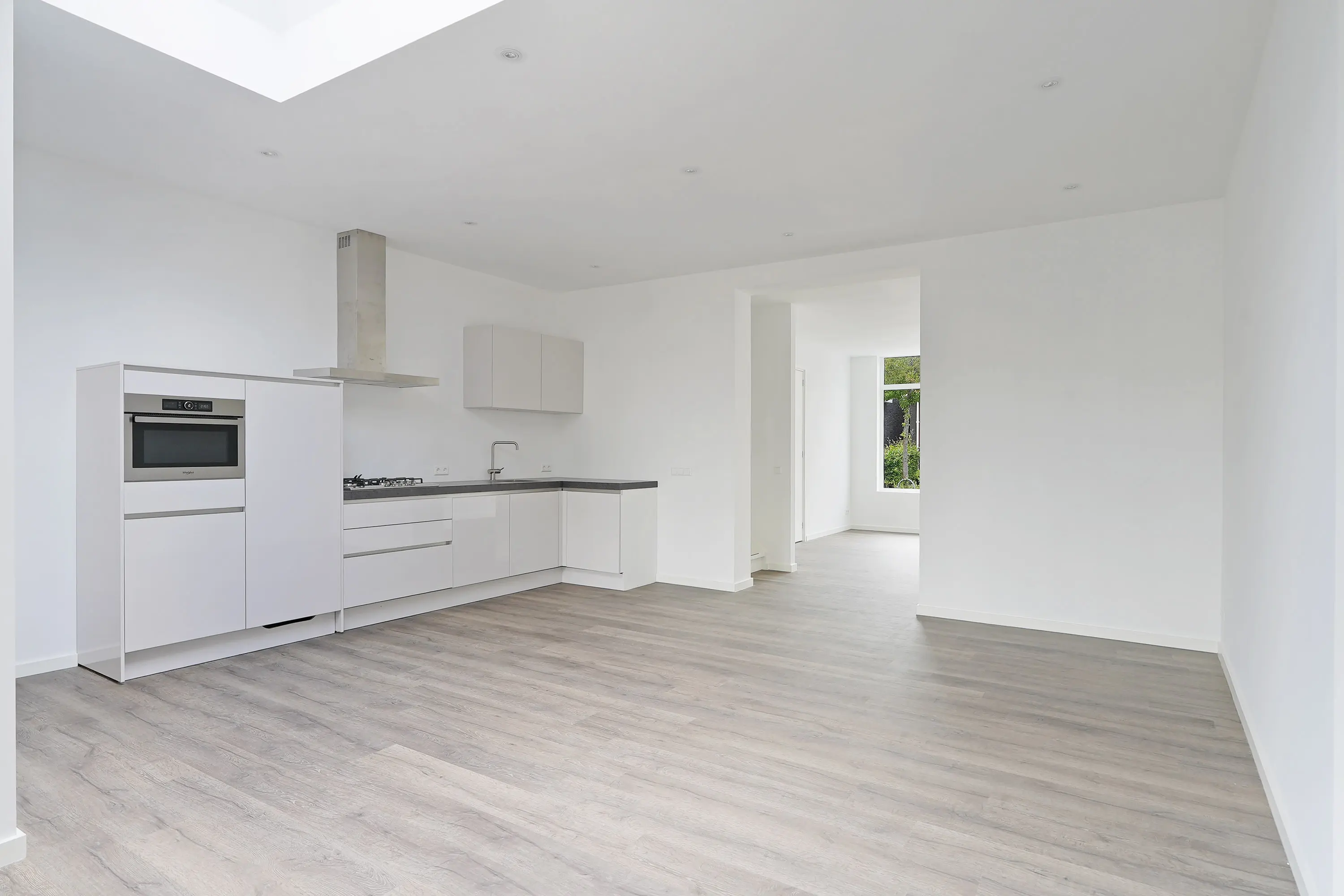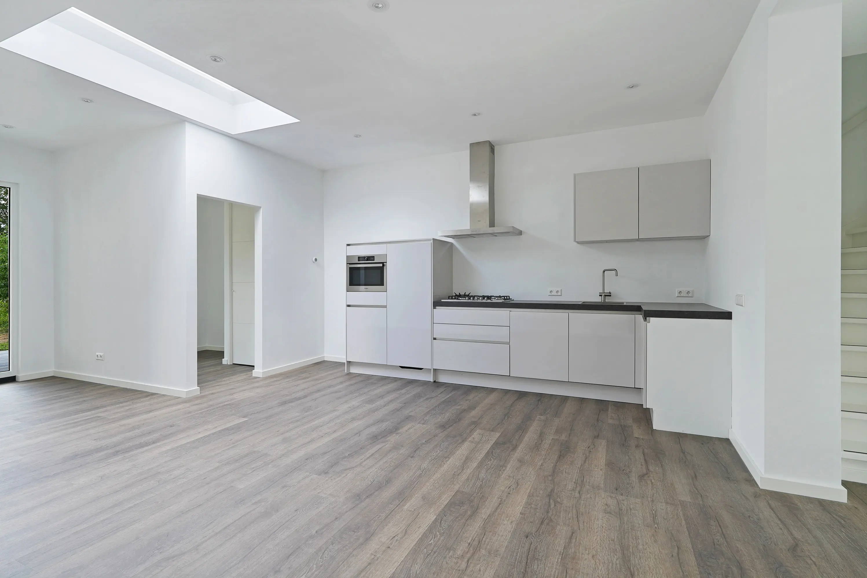 Hal met nieuwe meterkast, luxe en modern toilet, lichte woonkamer met trap naar de 1e verdieping, luxe en moderne, open woonkeuken met uitgebreide inbouwapparatuur en dubbele tuindeur en tenslotte een praktische bijkeuken met tuindeur en opstelling nieuwe c.v.-ketel.