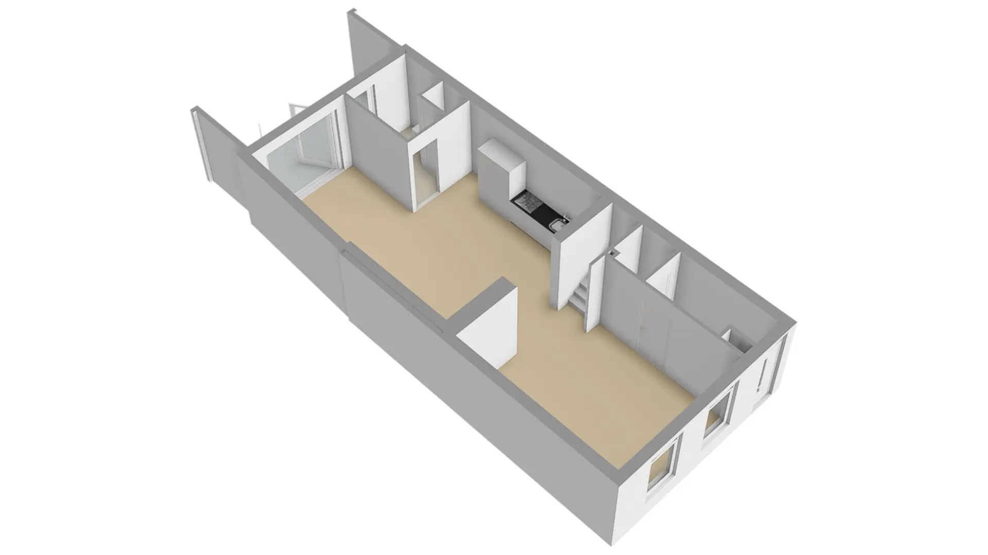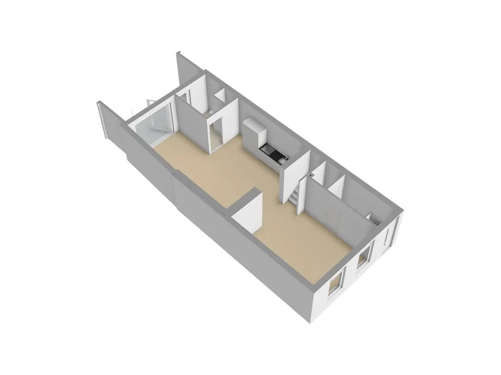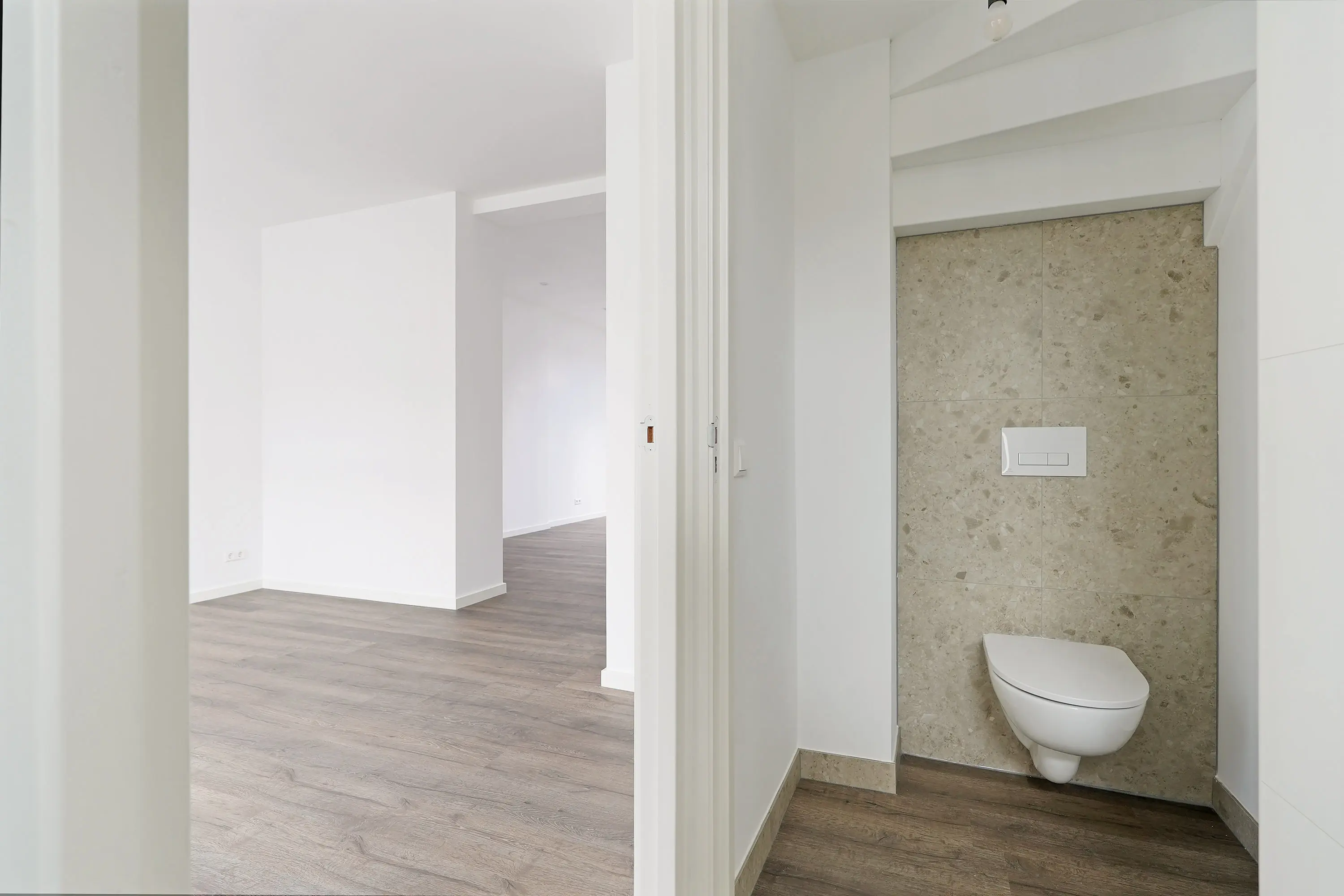 Hal met nieuwe meterkast, luxe en modern toilet, lichte woonkamer met trap naar de 1e verdieping, luxe en moderne, open woonkeuken met uitgebreide inbouwapparatuur en dubbele tuindeur en tenslotte een praktische bijkeuken met tuindeur en opstelling nieuwe c.v.-ketel.