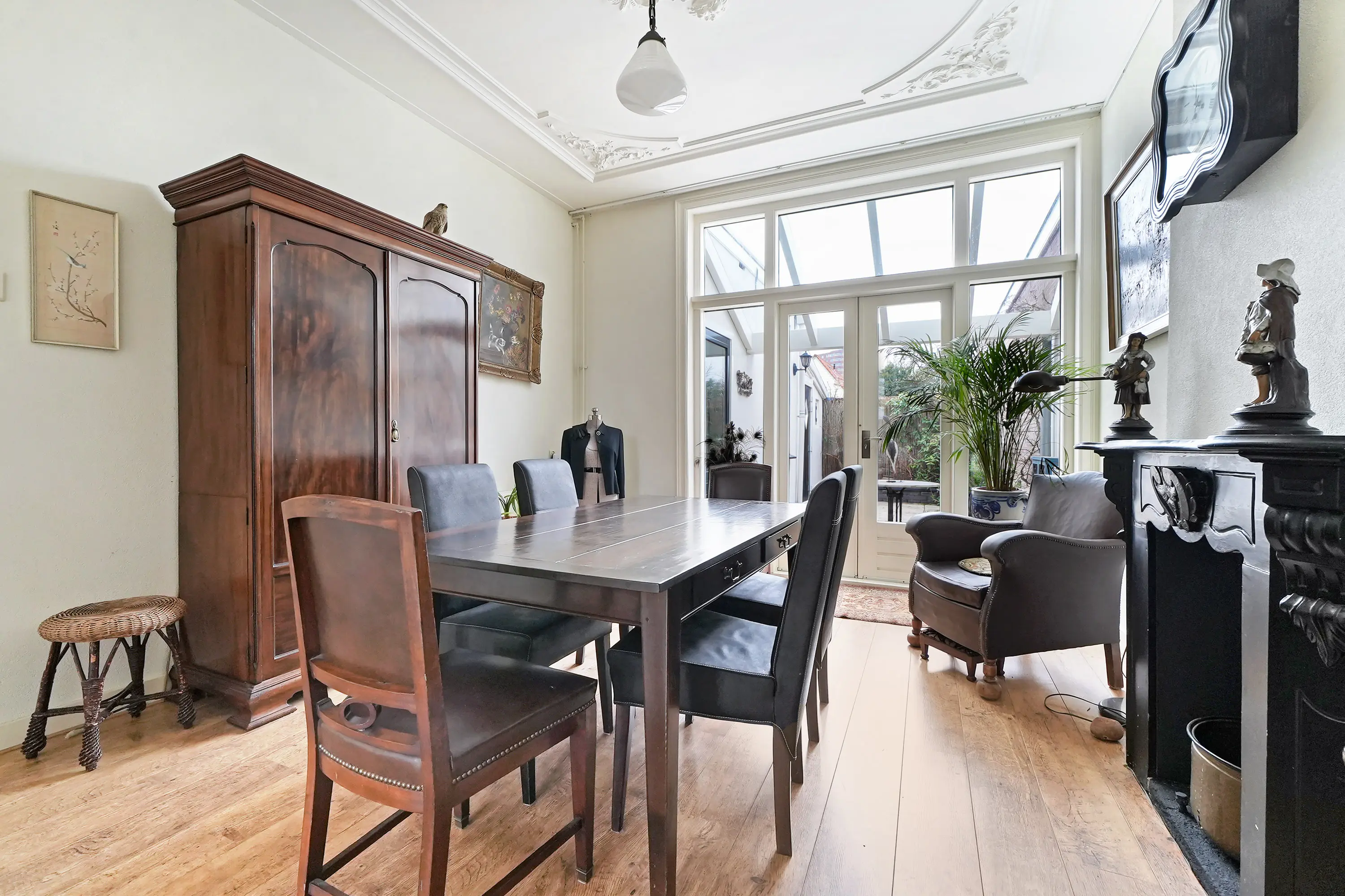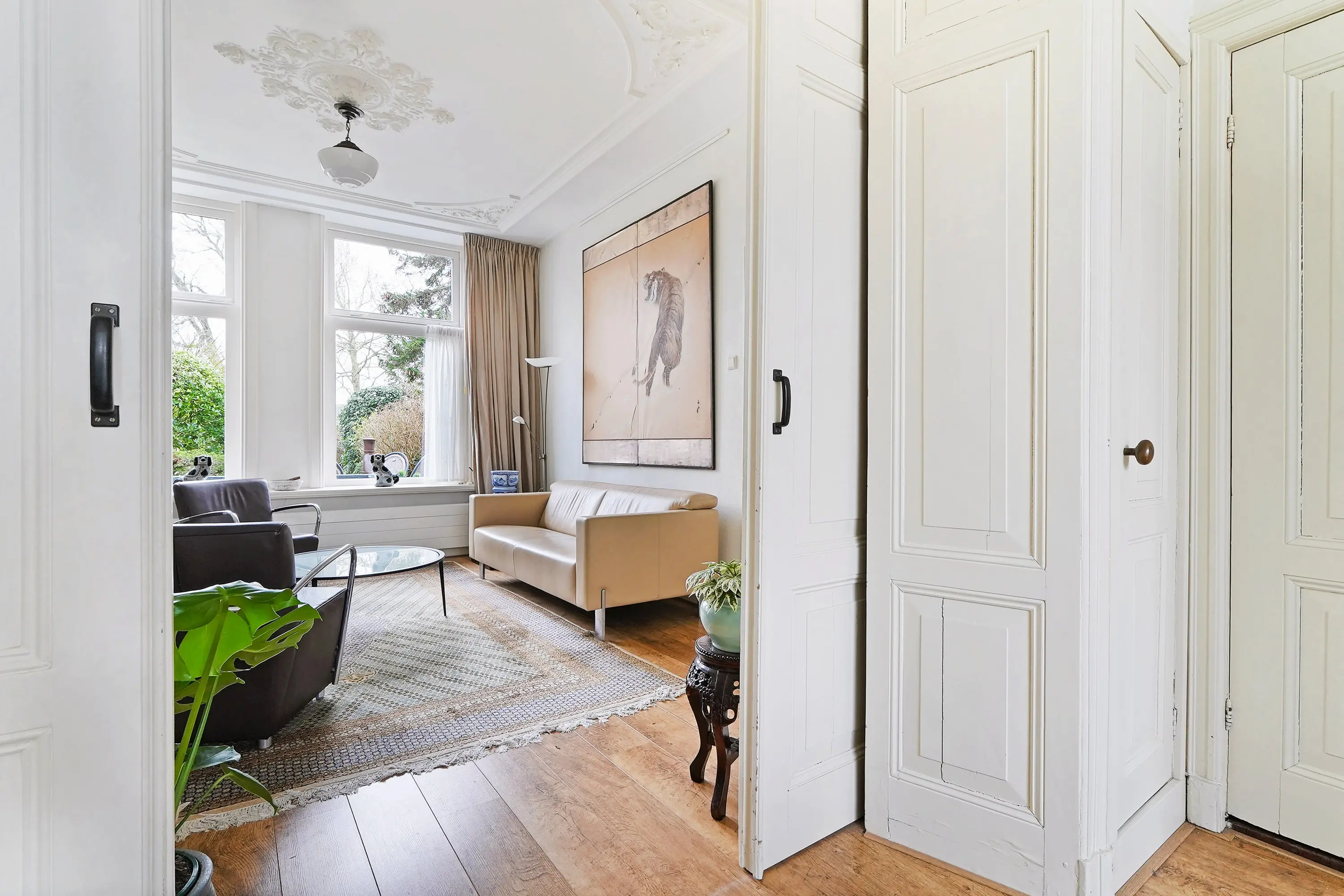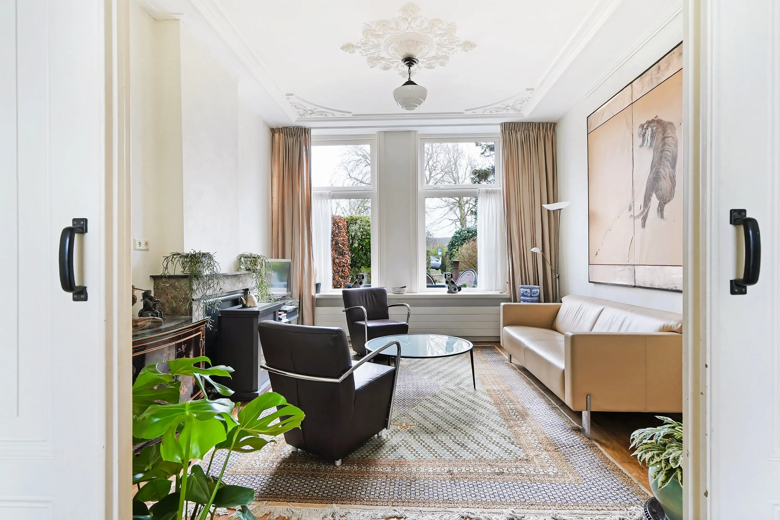 Entree in de riante hal met vernieuwde meterkast, trapopgang naar de eerste verdieping en doorgang naar de uiterst sfeervolle woonkamer. Bij binnenkomst in de voorkamer ervaart u direct de kwaliteit in combinatie met de authentieke charme. De voorkamer met natuurstenen schouw is licht en royaal van opzet, met een prachtig uitzicht op de diepe voortuin. Het hoge plafond met sierwerk verkeert in perfecte staat. Via de doorgang met de fraaie en-suite deuren bereikt u de achterkamer, waar zich de eethoek bevindt met dubbele openslaande deuren naar de tuin.