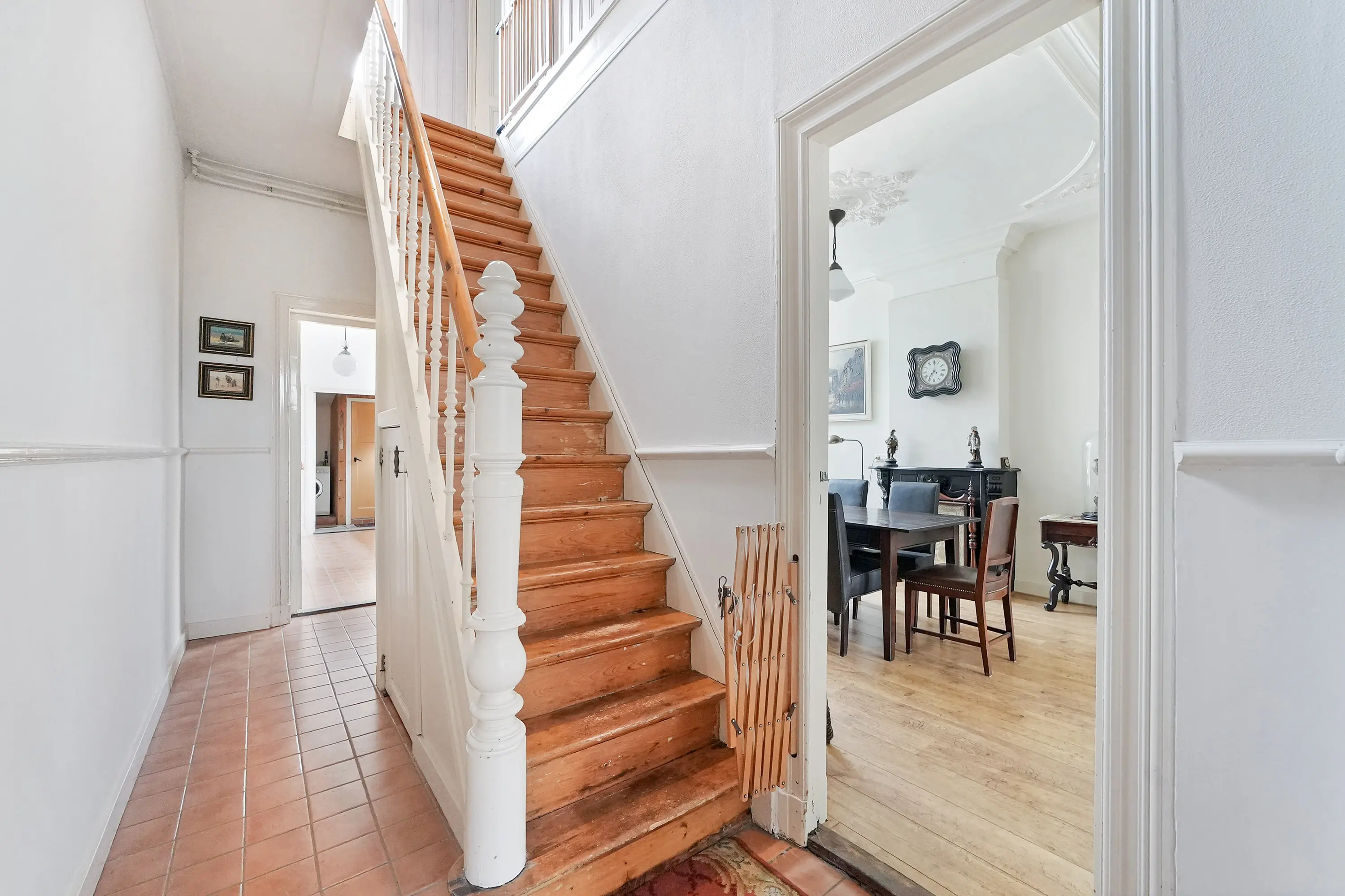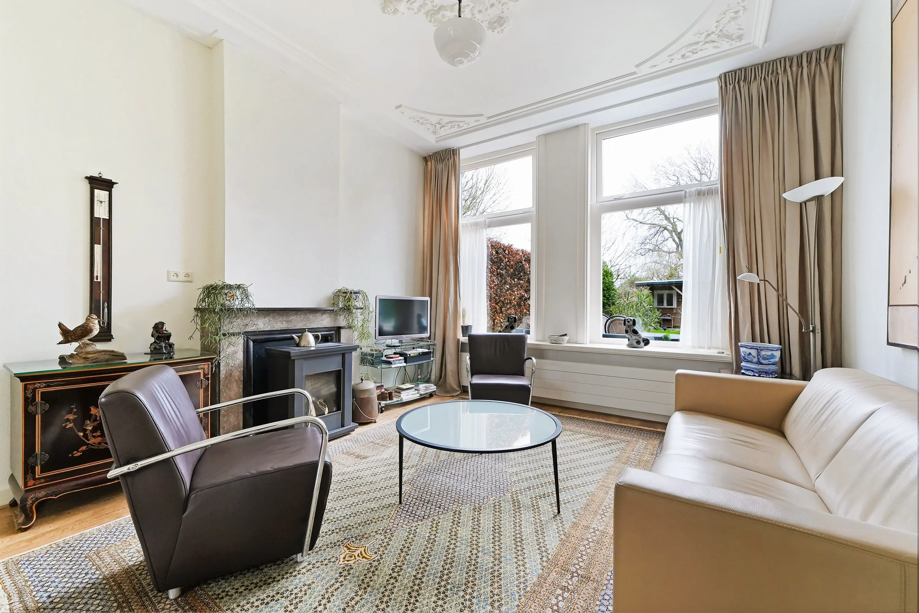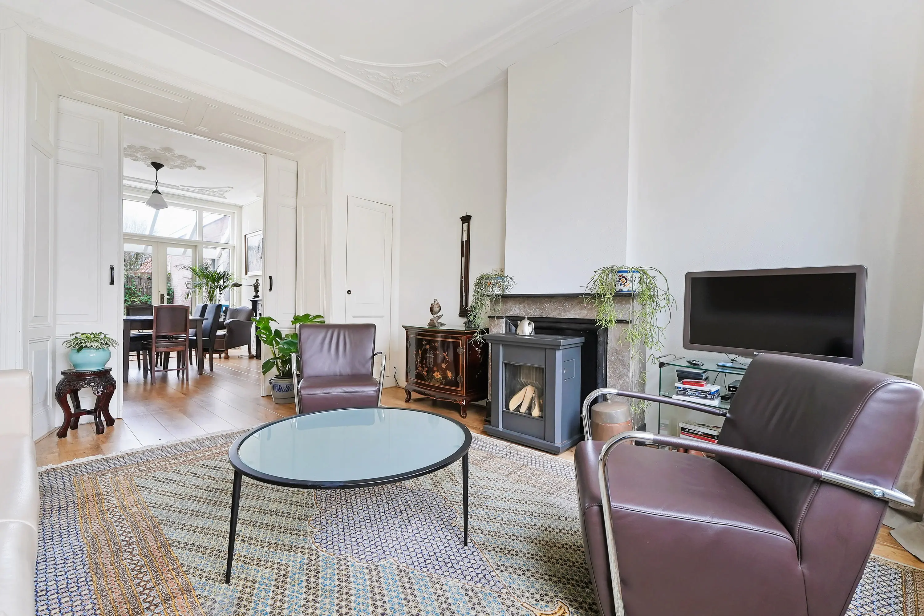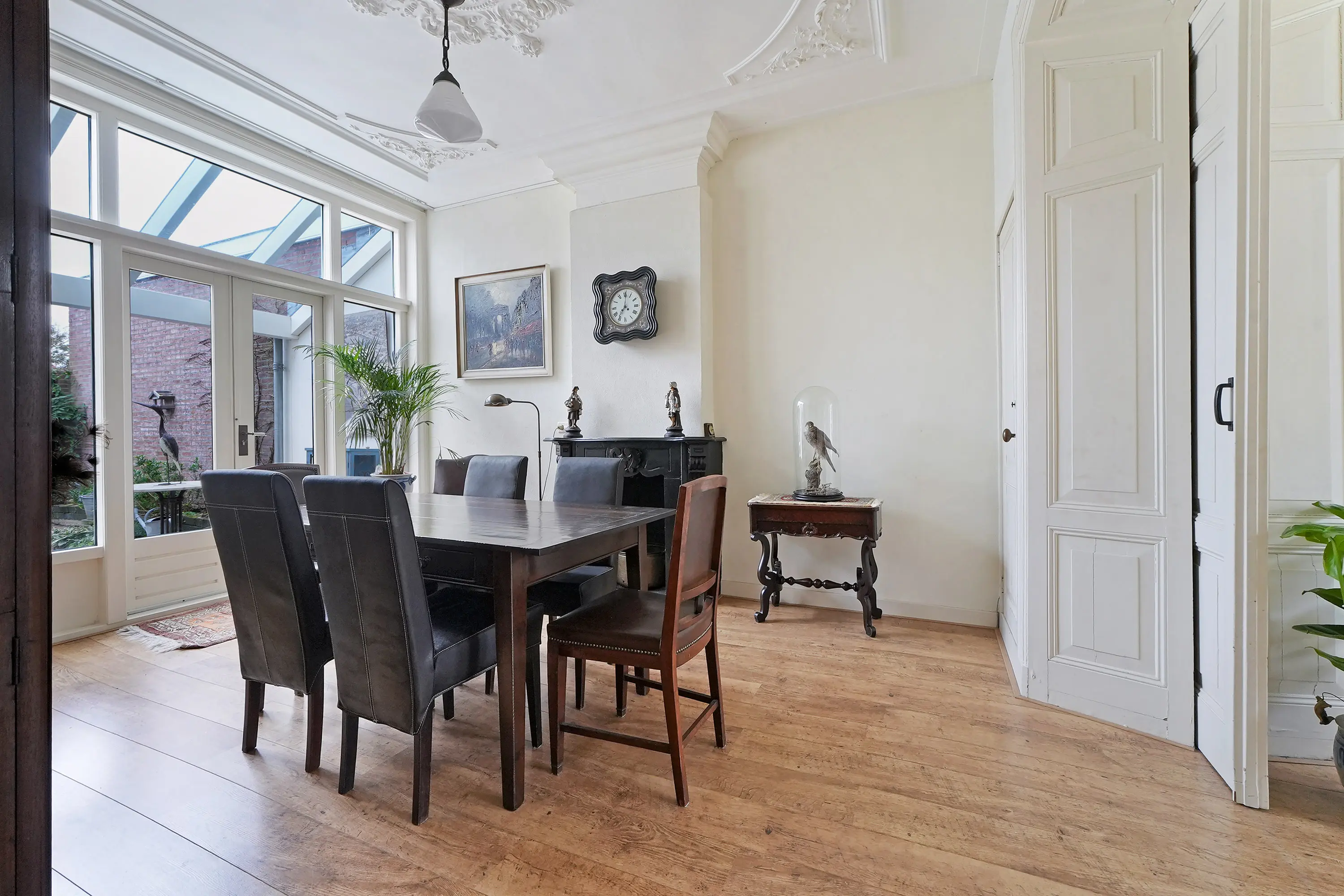 Entree in de riante hal met vernieuwde meterkast, trapopgang naar de eerste verdieping en doorgang naar de uiterst sfeervolle woonkamer. Bij binnenkomst in de voorkamer ervaart u direct de kwaliteit in combinatie met de authentieke charme. De voorkamer met natuurstenen schouw is licht en royaal van opzet, met een prachtig uitzicht op de diepe voortuin. Het hoge plafond met sierwerk verkeert in perfecte staat. Via de doorgang met de fraaie en-suite deuren bereikt u de achterkamer, waar zich de eethoek bevindt met dubbele openslaande deuren naar de tuin.