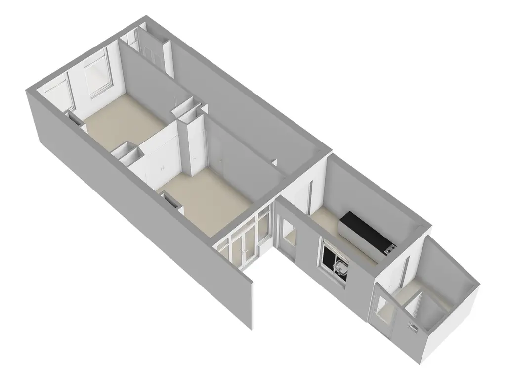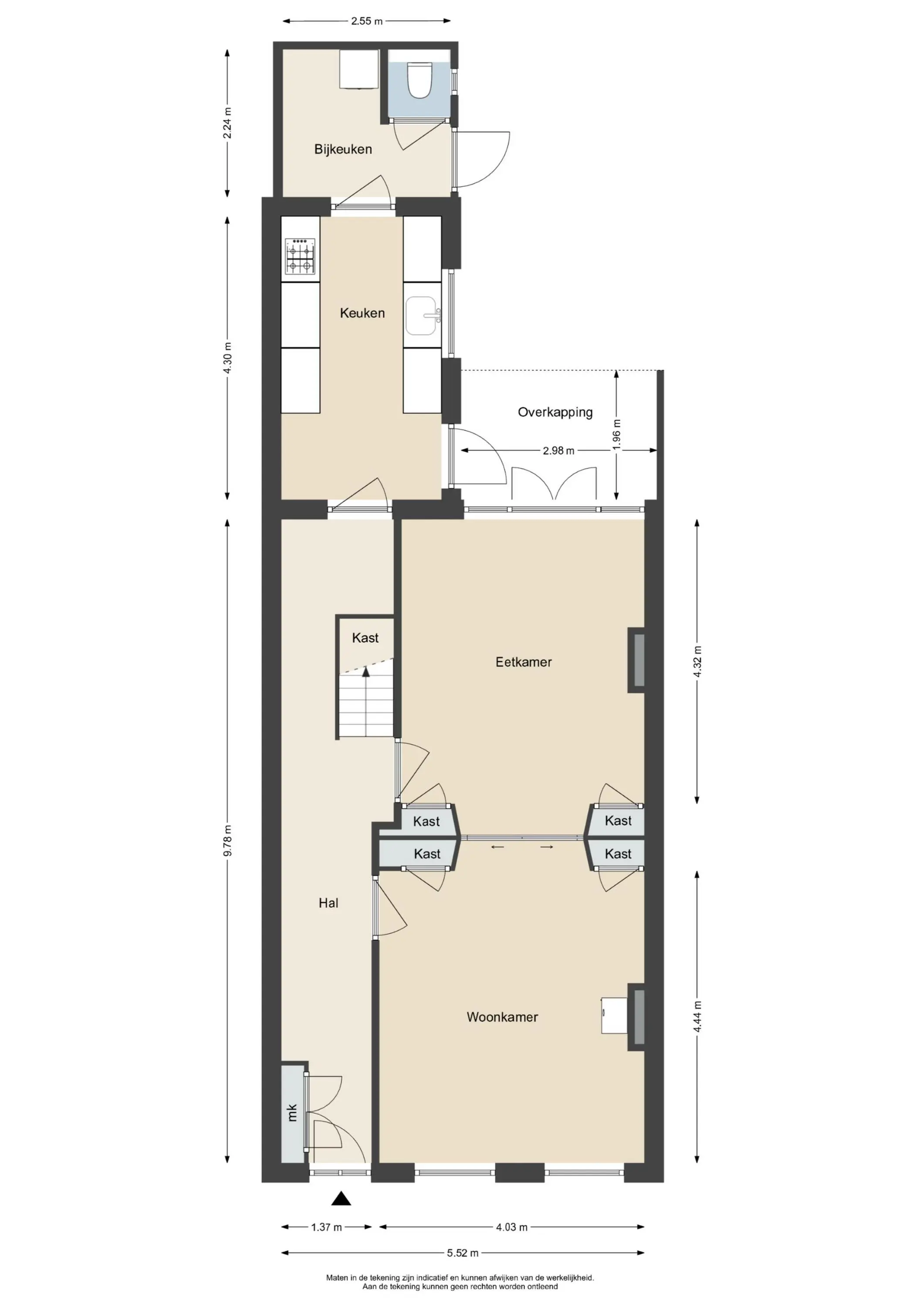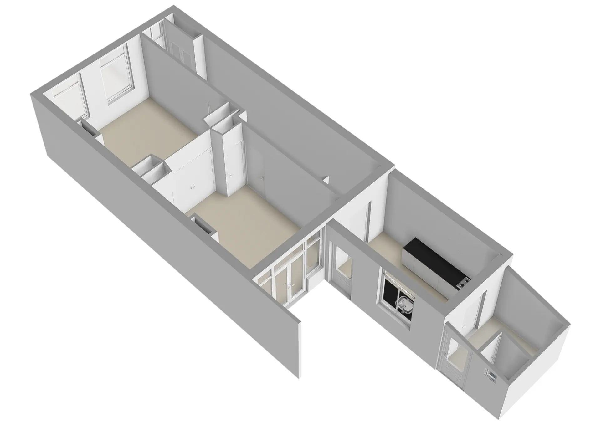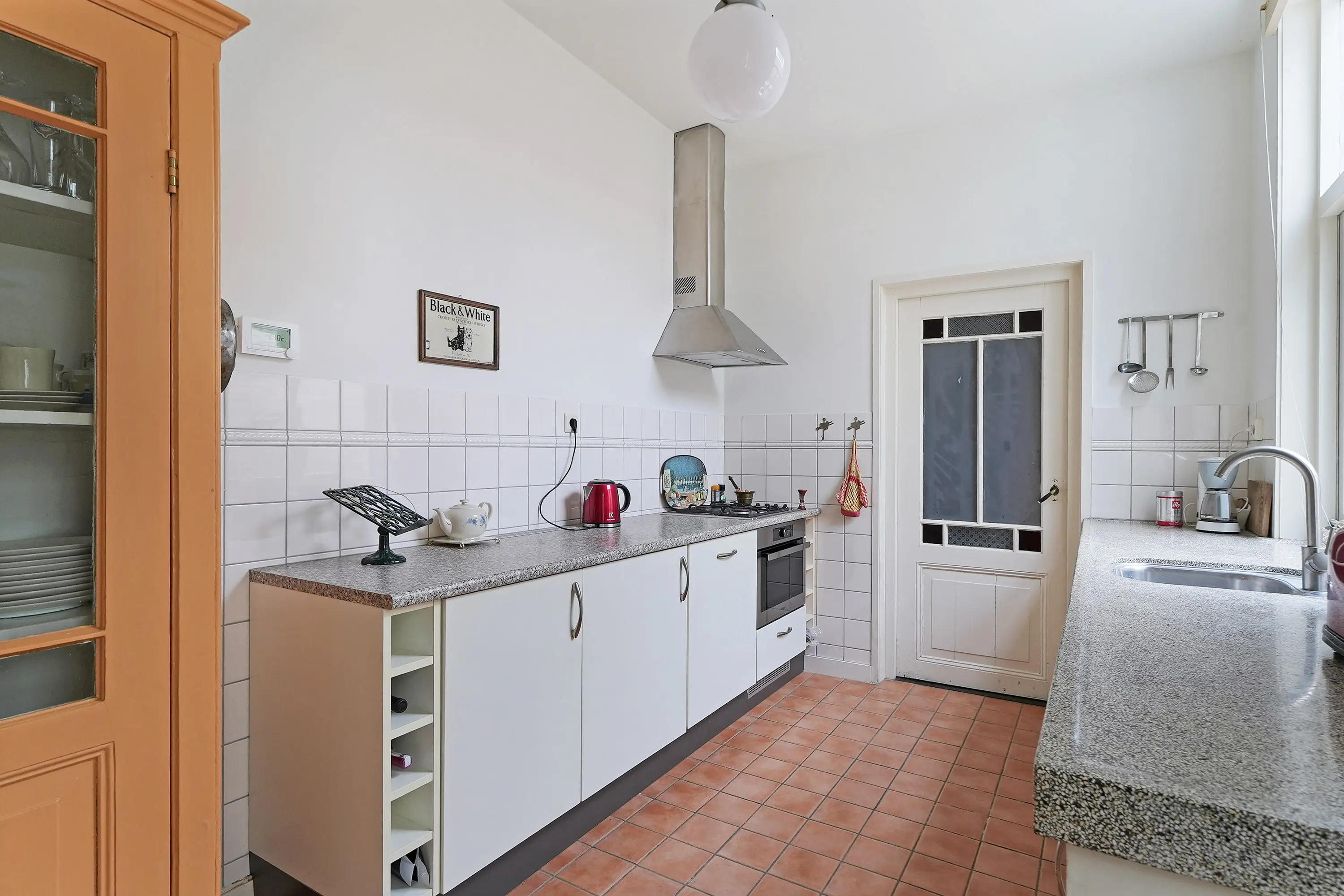 De keuken, eveneens bereikbaar vanuit de hal, ligt aan de tuinzijde. Hier treft u een charmante keukenuitrusting in parallelopstelling met granito werkblad en lichte kastfronten. Aansluitend bevindt zich de bijkeuken met toilet en wasmachine-opstelling. Ook vanuit de keuken en bijkeuken is de achtertuin bereikbaar.