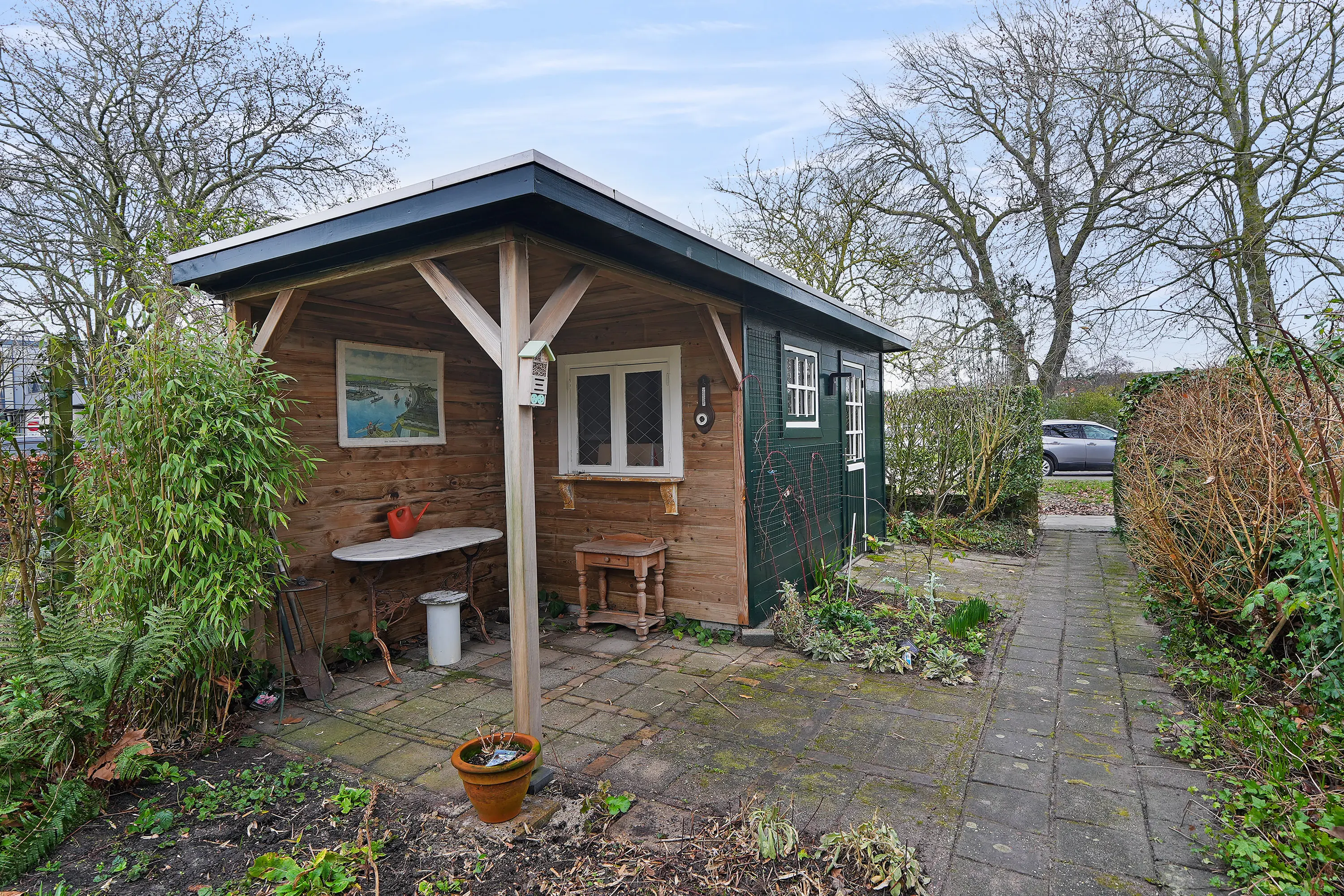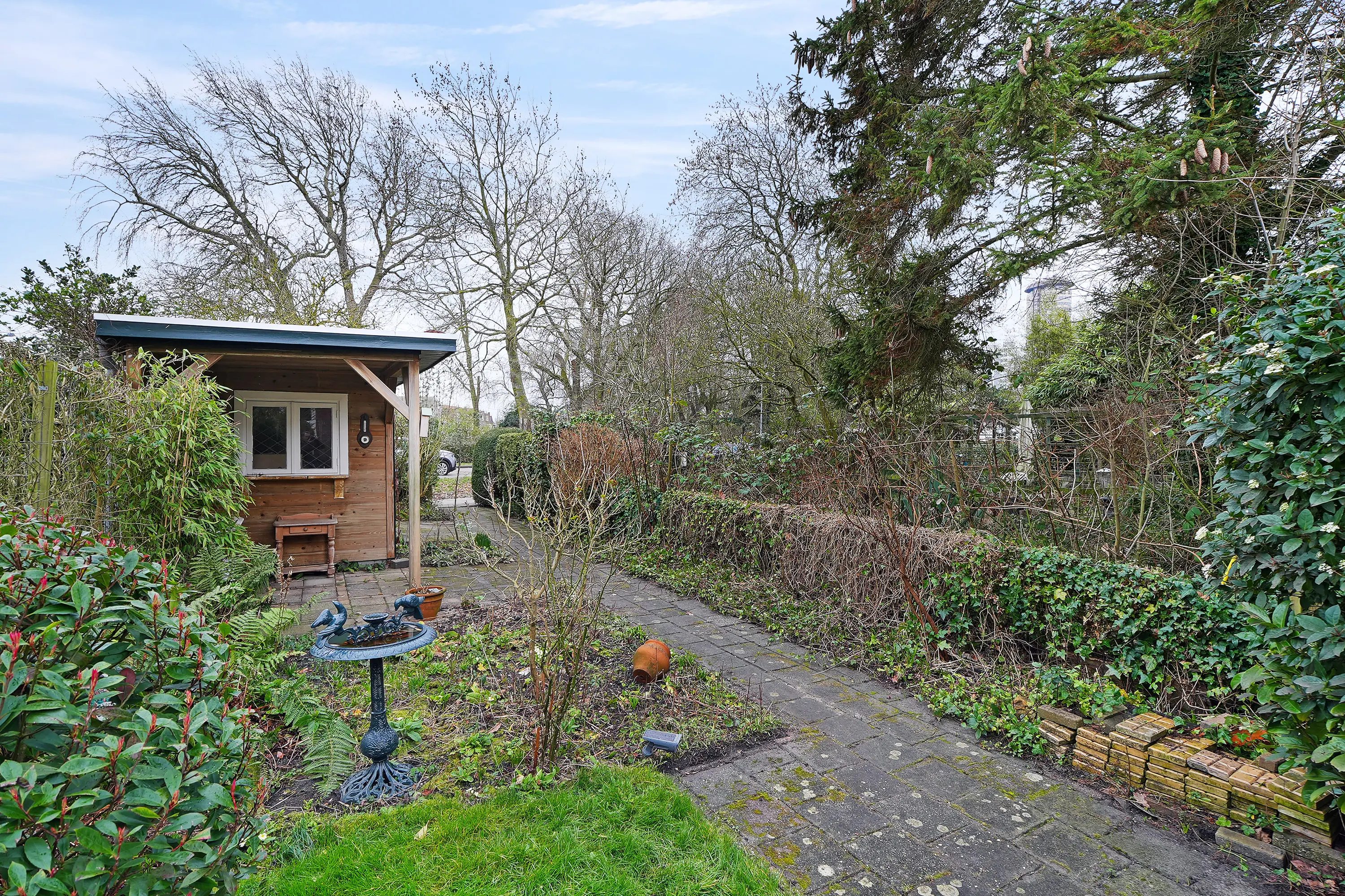 De zonnige, besloten achtertuin is gebruiksklaar en biedt een grote mate van privacy. Direct achter de woning bevindt zich een glazen overstek waaronder u heerlijk kunt zitten. Indien gewenst kunt u hier op relatief eenvoudige wijze een tuinkamer realiseren. De bijzonder diepe voortuin één van de unieke kenmerken van deze woning, biedt een prachtige tuinbeleving om volop van te genieten. De houten tuinberging, is recent vernieuwd en is ideaal voor het opbergen van uw spullen en bijvoorbeeld de fiets.