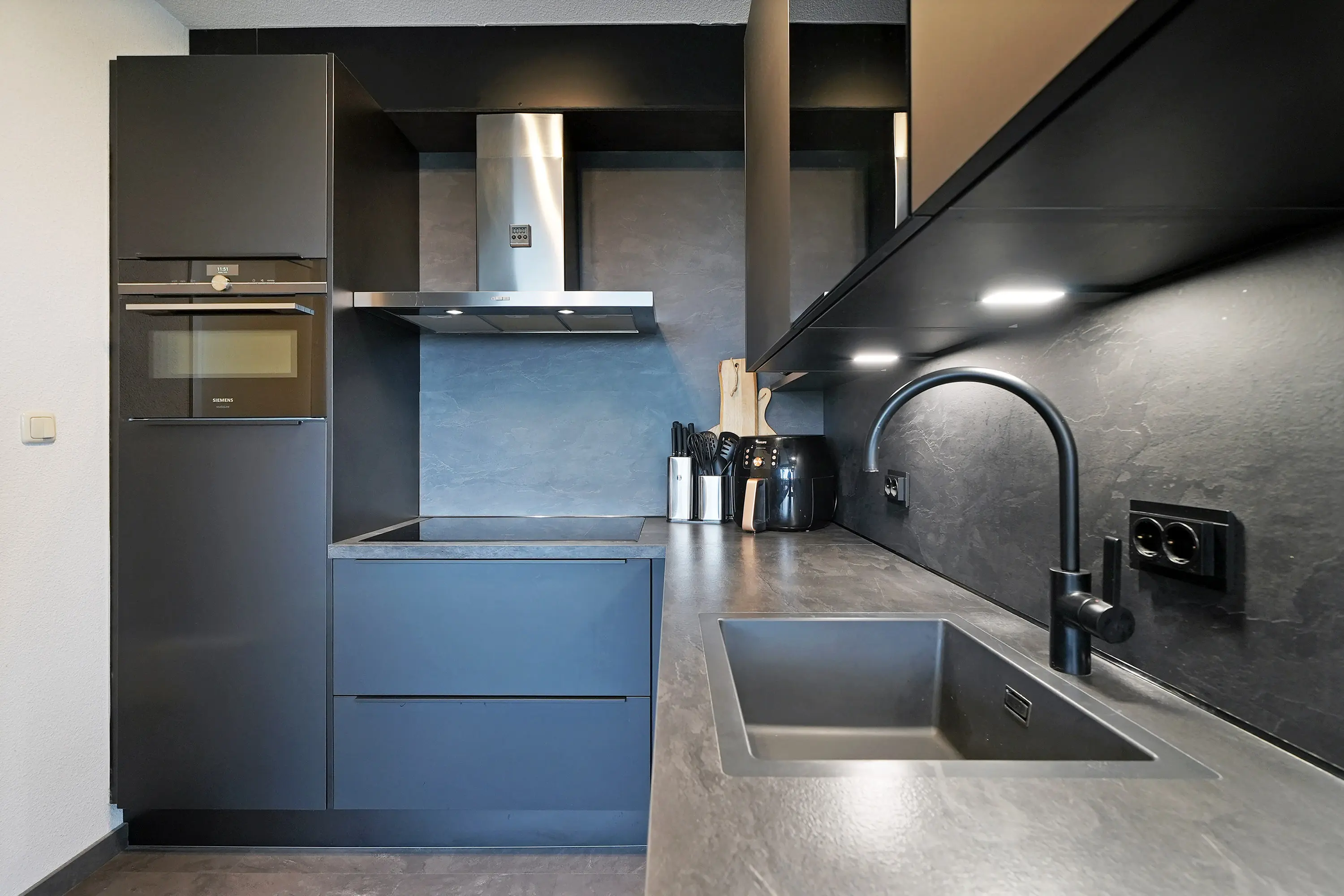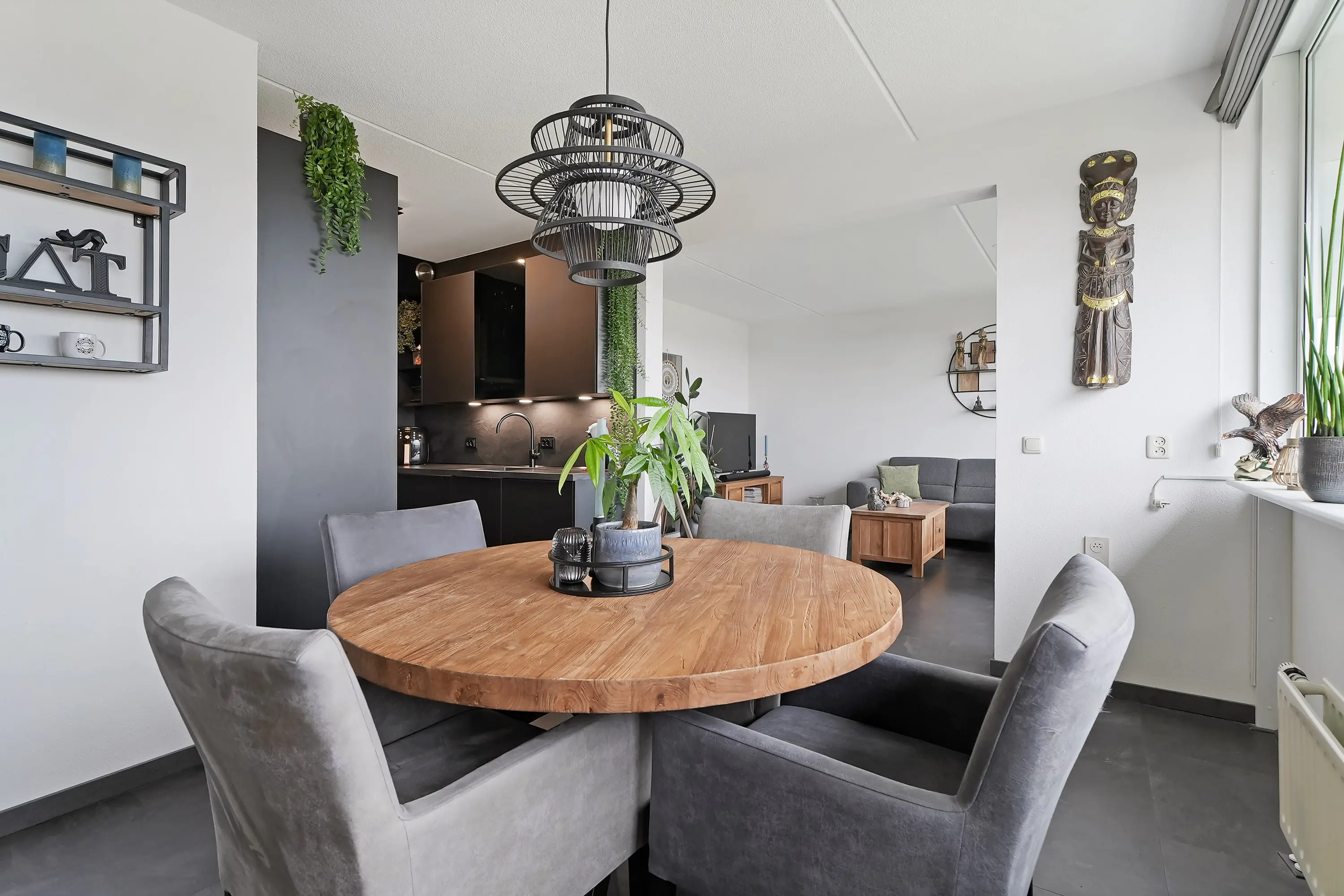 Entree in de hal met meterkast, vanwaar u toegang heeft tot alle vertrekken in het appartement. Bij binnenkomst in de woonkamer ervaart u direct een fenomenaal uitzicht met het groene park voor het complex. De ruime en bovenal lichte woonkamer bevindt zich aan de achterzijde (zuidoostzijde) en biedt ruimte voor een riante zithoek en eethoek die in open verbinding staat met de vernieuwde keuken. De luxe keuken is uitgevoerd in een hoekopstelling met zwarte kastfronten en een donker antraciet werkblad en voorzien van de gewenste inbouwapparatuur als o.a. een inductiekookplaat, afzuigkap, combi-oven, vaatwasser en koelkast. Aansluitend aan de keuken treft u de bijkeuken, waar u de wasmachine kunt plaatsen. Via de woonkamer bereikt u het balkon, gelegen op het zuidoosten.