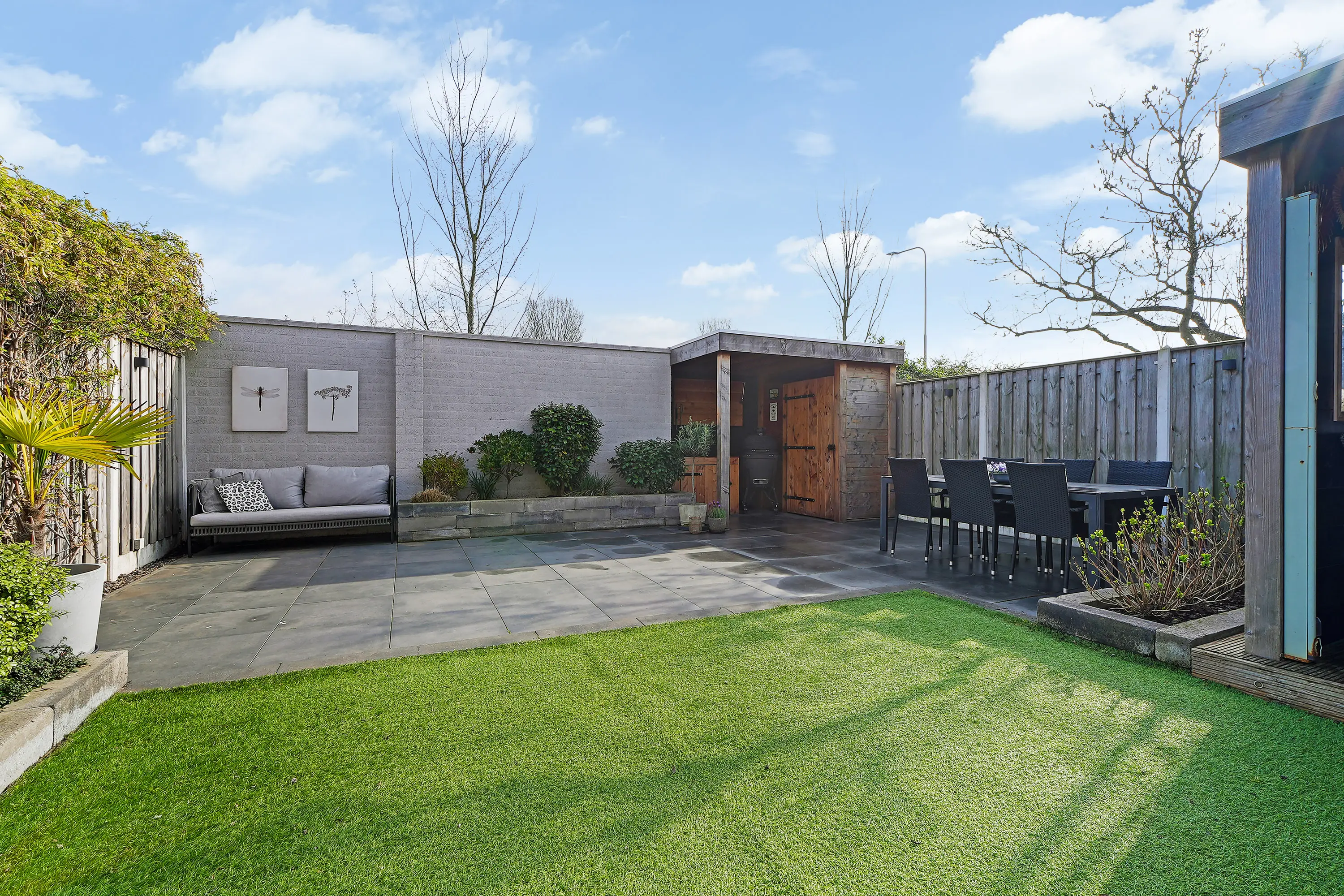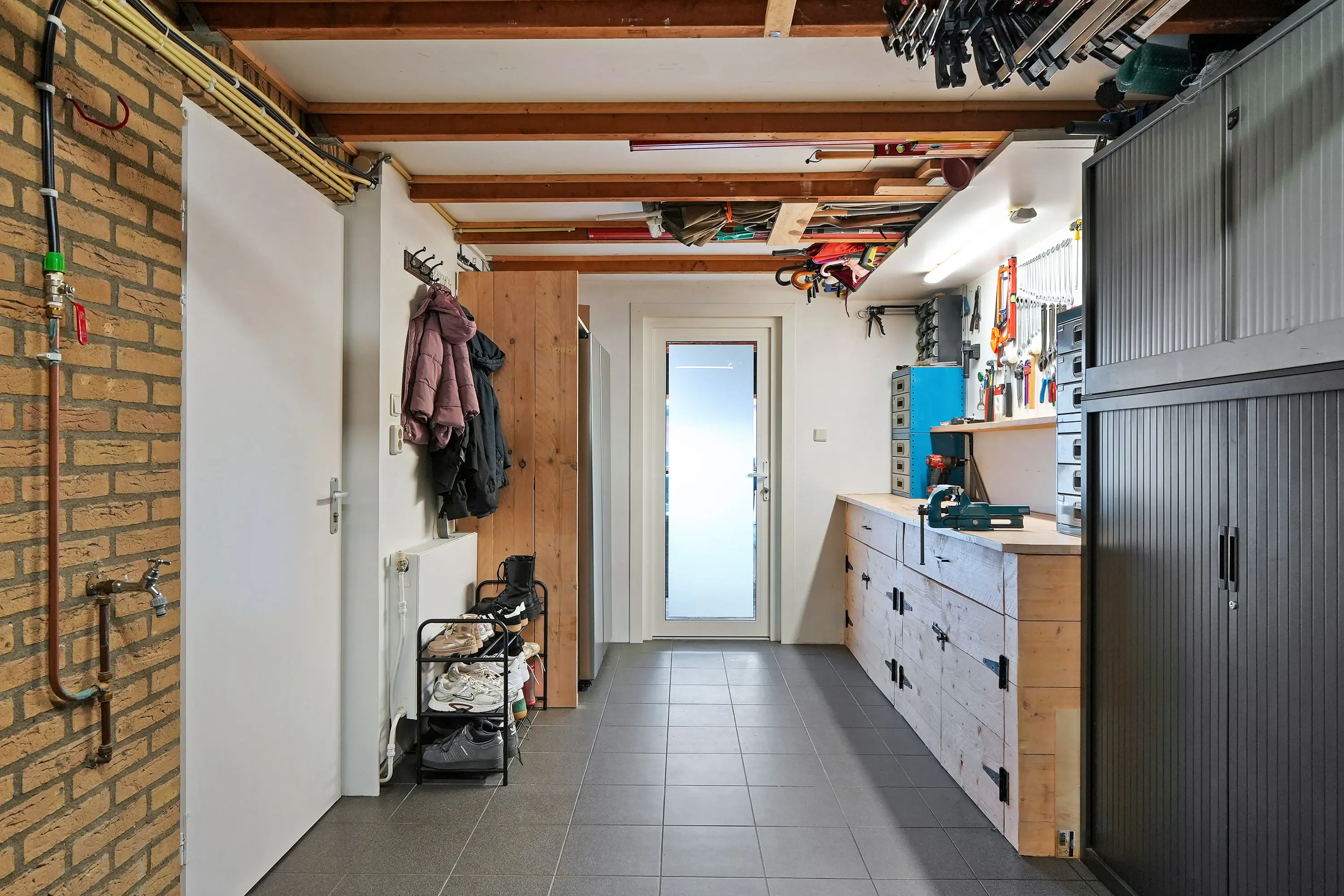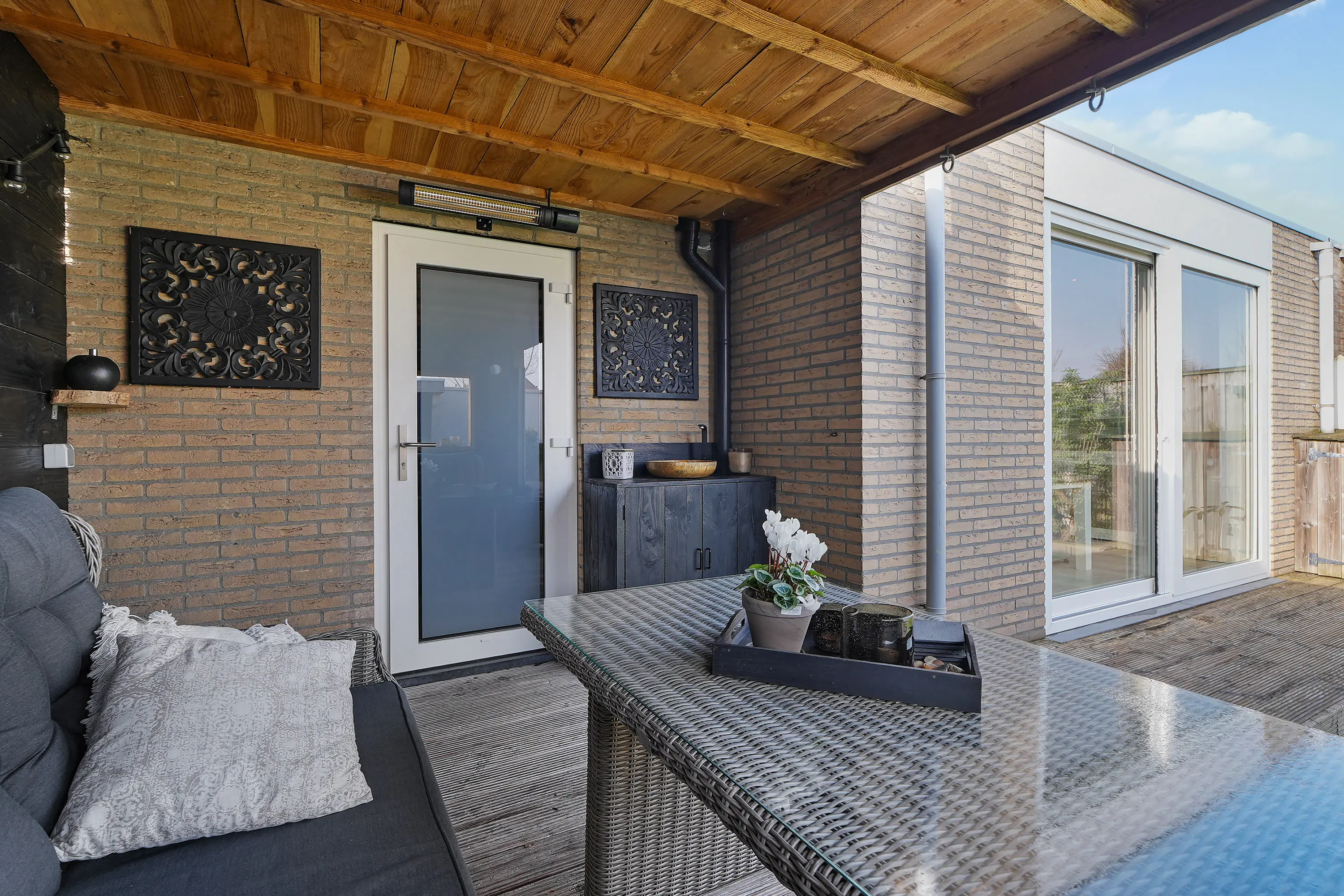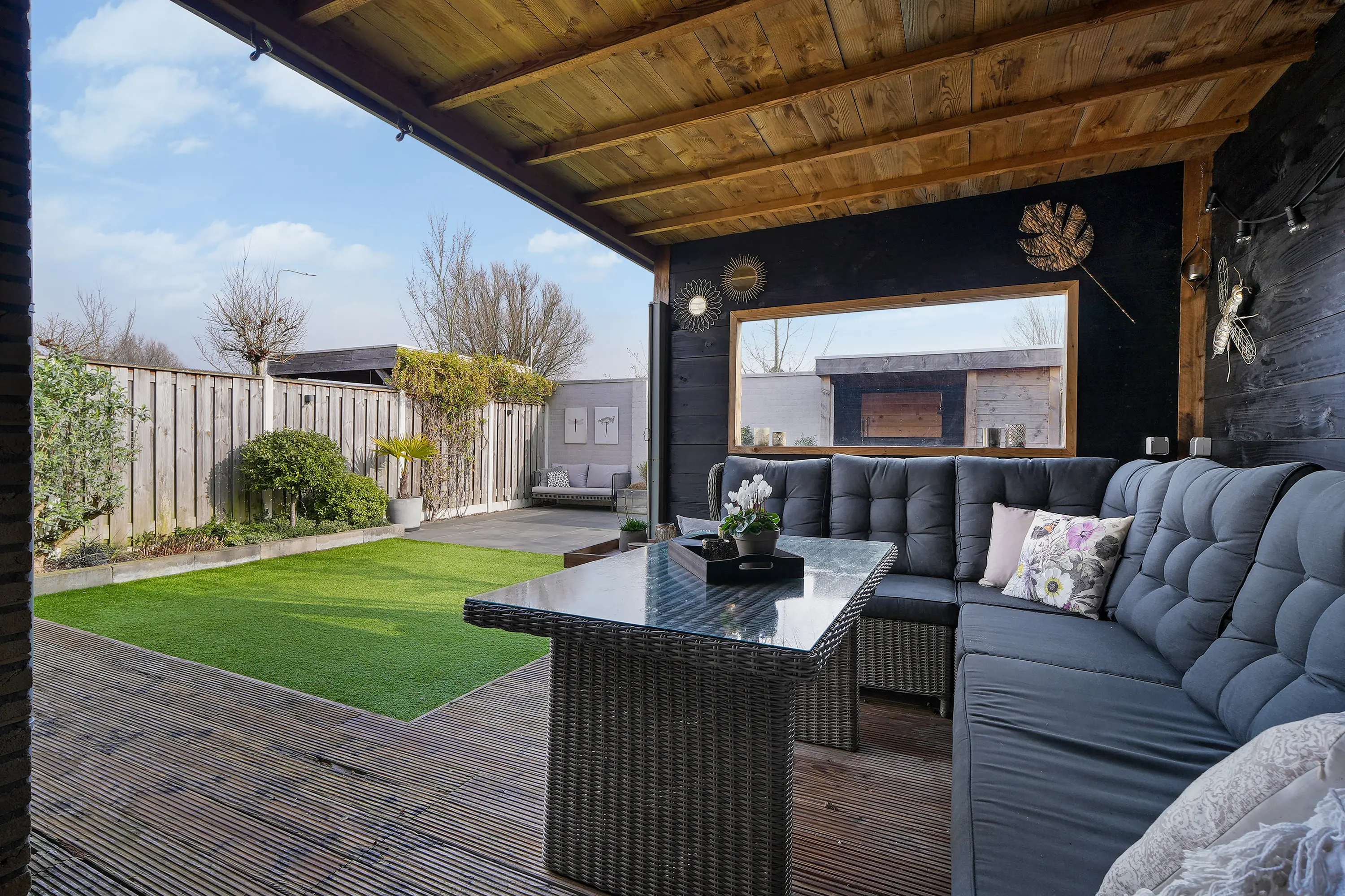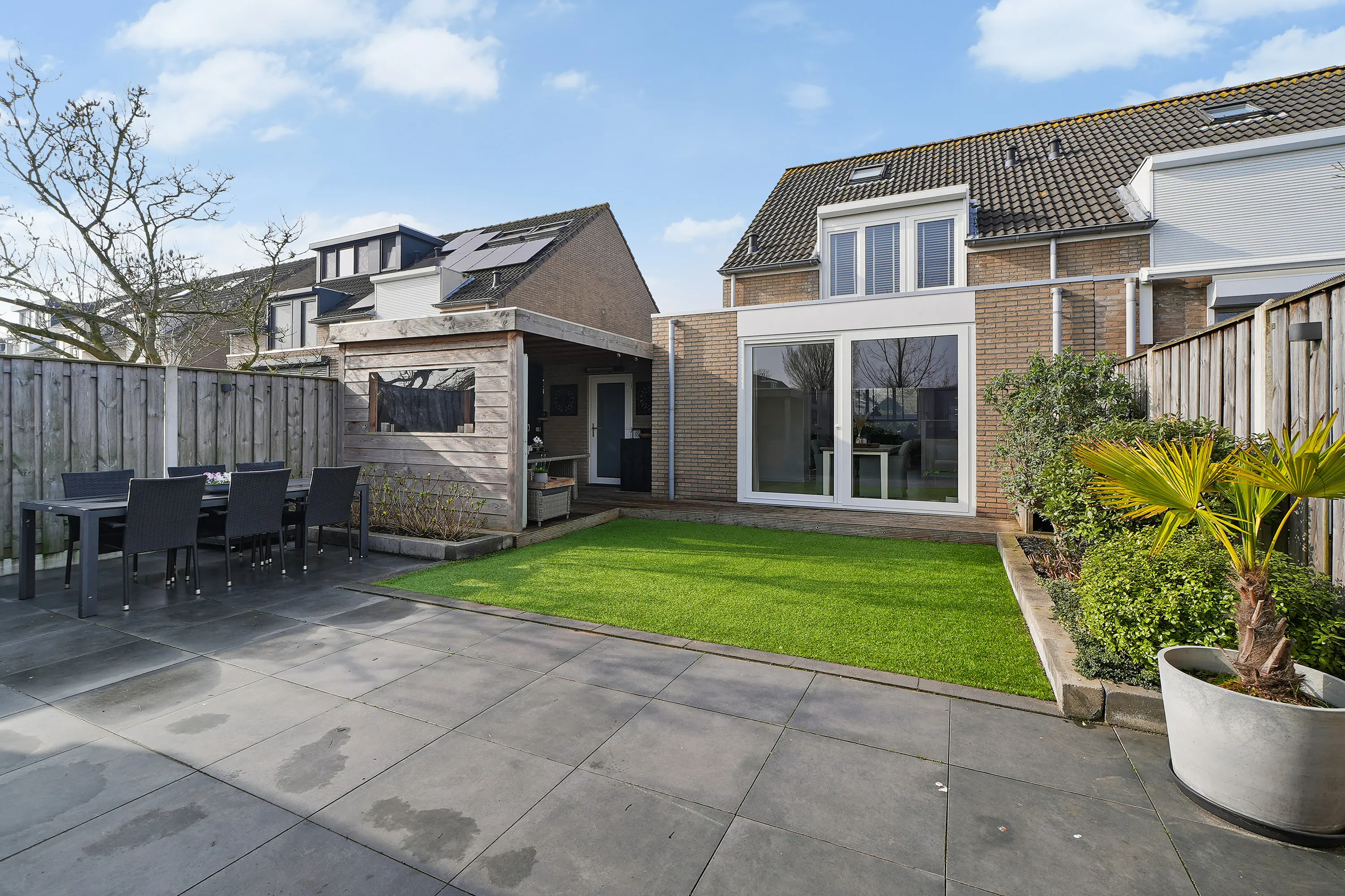 De achtertuin is een heerlijke plek om te ontspannen en is met zorg aangelegd. Door de gunstige ligging kunt u hier vrijwel de hele dag van de zon genieten. De veranda met vlonderterras biedt een sfeervolle, beschutte zitplek waar u het hele jaar door prettig kunt vertoeven. De combinatie van een fraaie groenborder, onderhoudsvriendelijke tegels en de directe toegang vanuit zowel de woonkamer als de garage maakt de tuin tot een waardevolle verlenging van de leefruimte.
