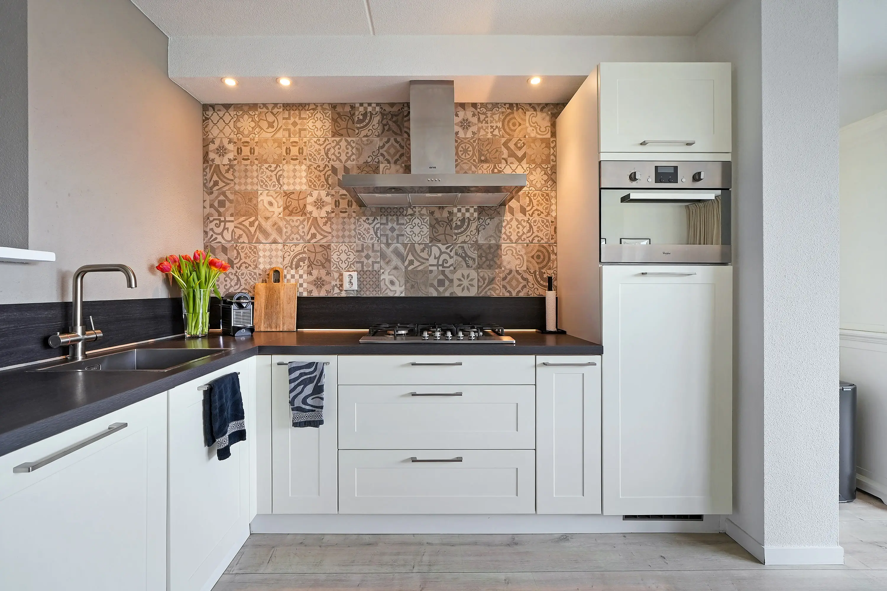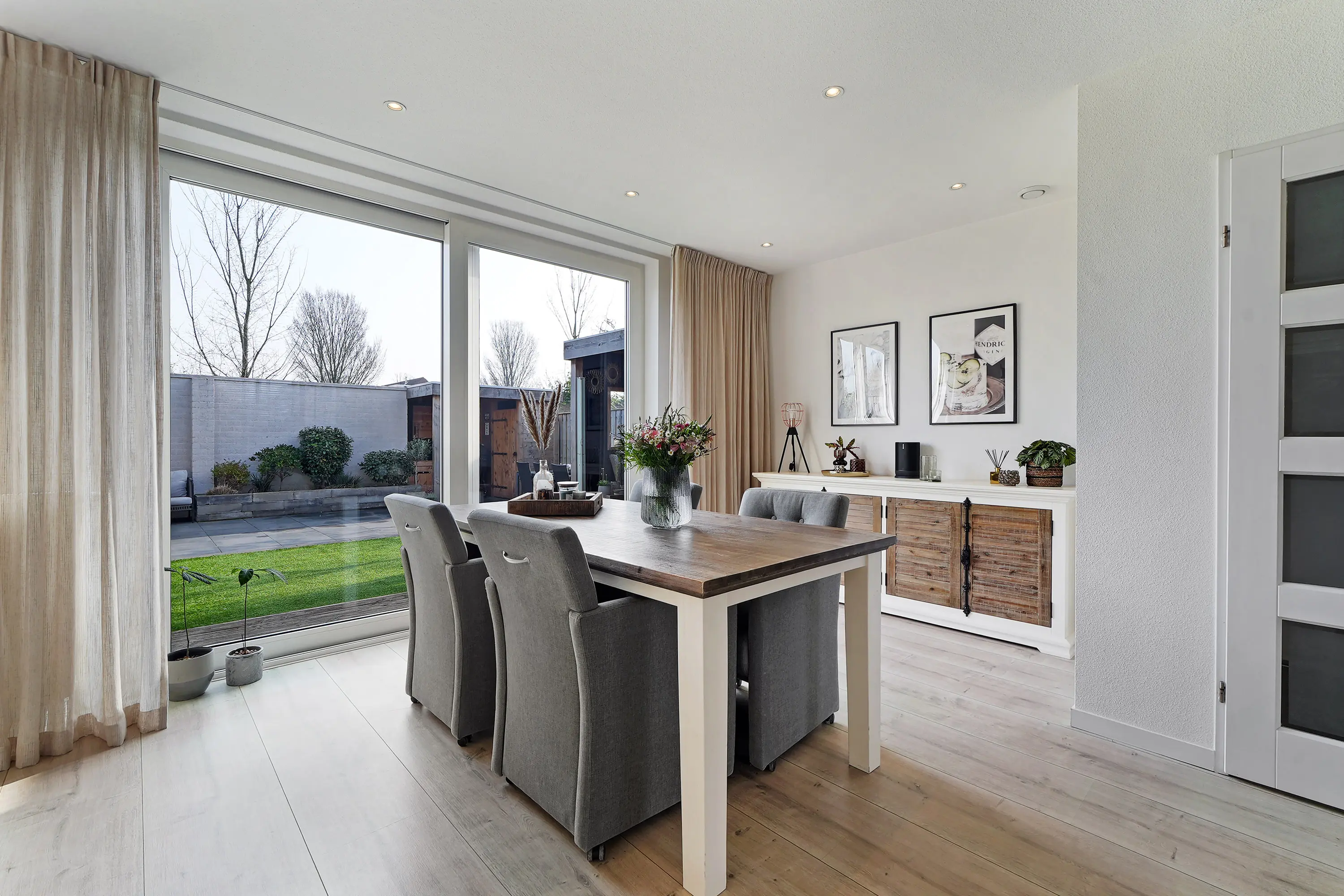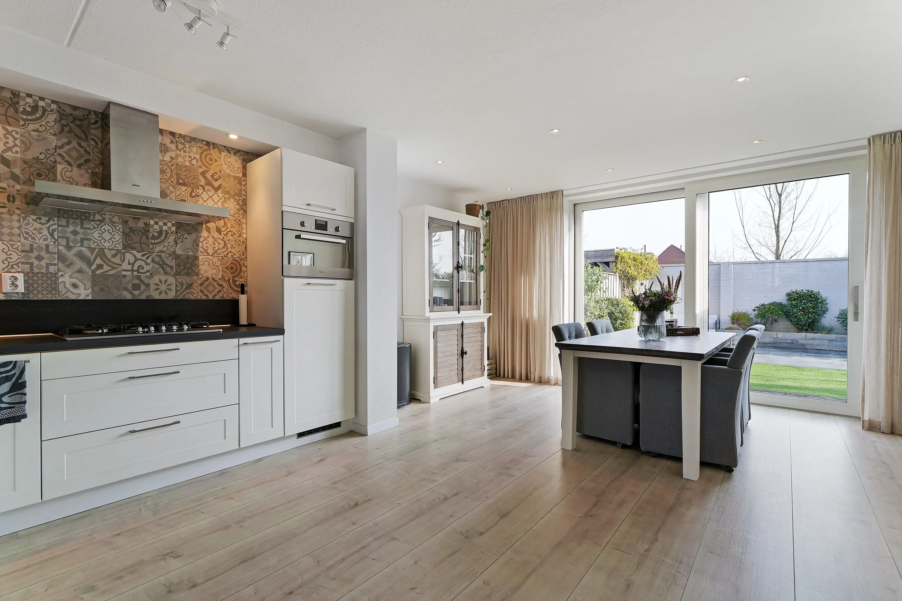 Bij binnenkomst valt direct de verzorgde afwerking op. De hal met (vernieuwde) meterkast en trapopgang geeft toegang tot de woonkamer, waar de grote raampartij aan de voorzijde zorgt voor een prettige lichtinval. De open keuken is uitgevoerd in een ruime hoekopstelling en uitgerust met de gewenste inbouwapparatuur. Dankzij de drie meter diepe uitbouw over de volledige breedte van de woning is er een royale eetruimte ontstaan, perfect voor gezellige diners of lange avonden met familie en vrienden. De schuifpui aan de achterzijde zorgt voor een directe verbinding met de tuin, waardoor binnen en buiten op een natuurlijke manier in elkaar overlopen.