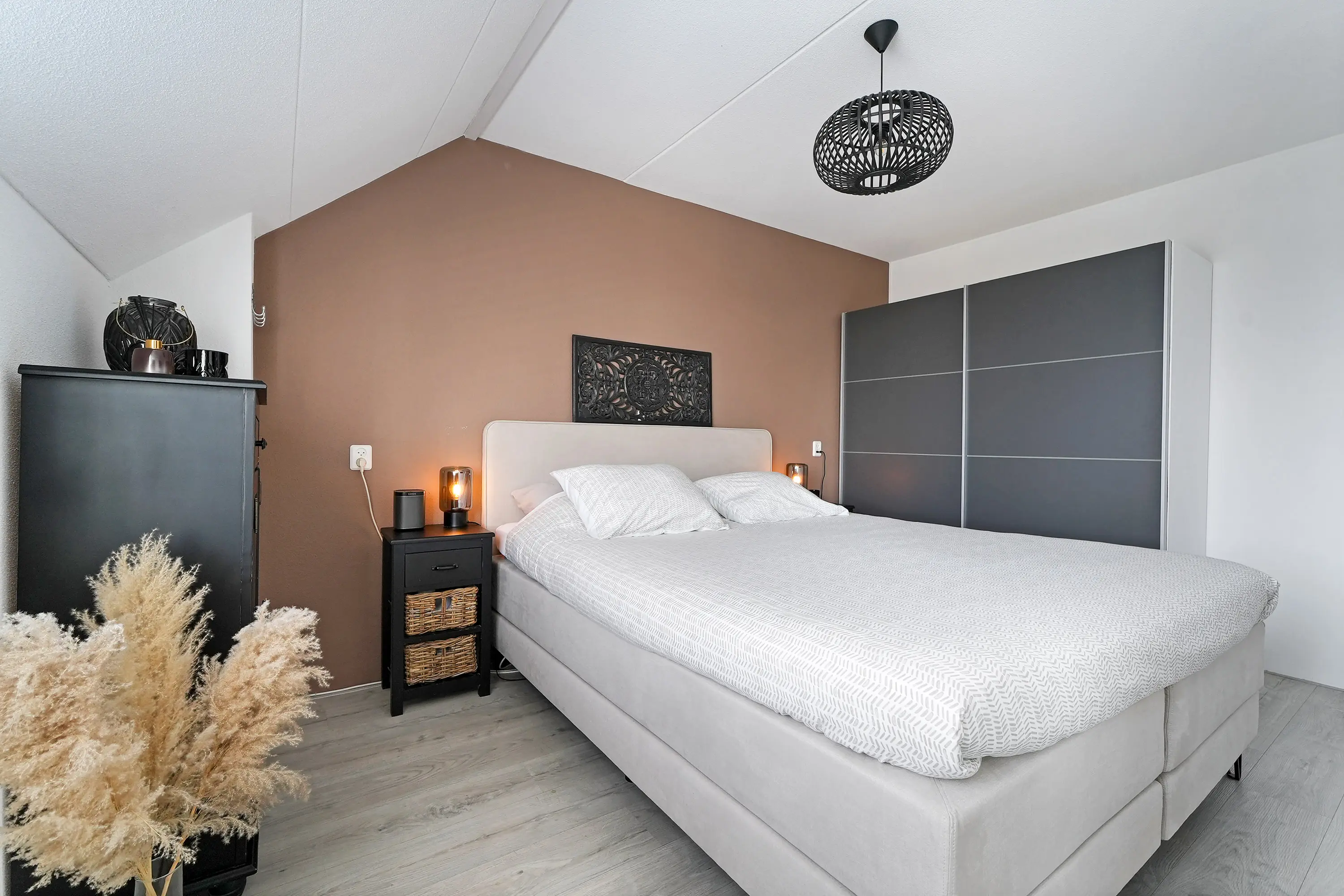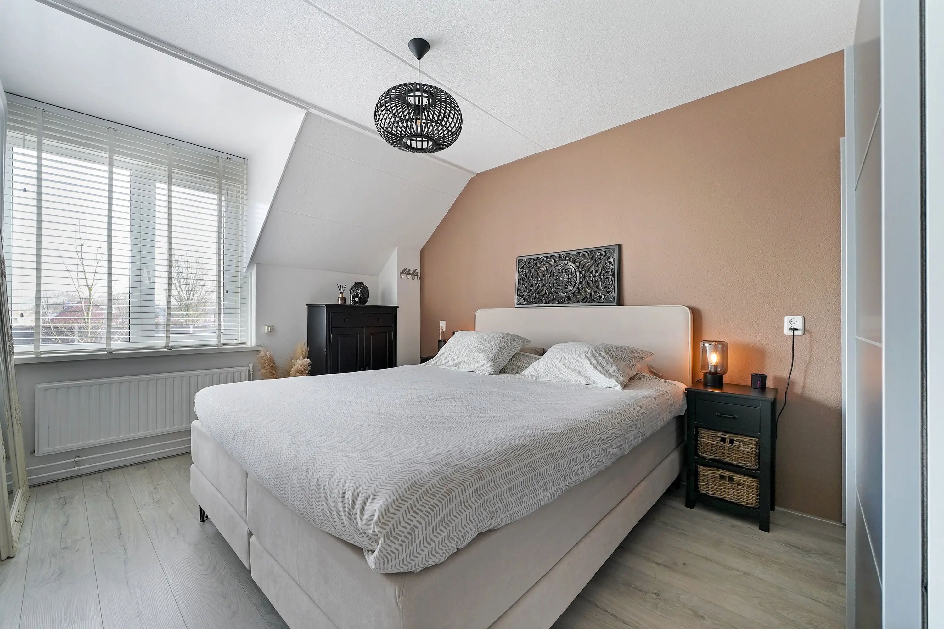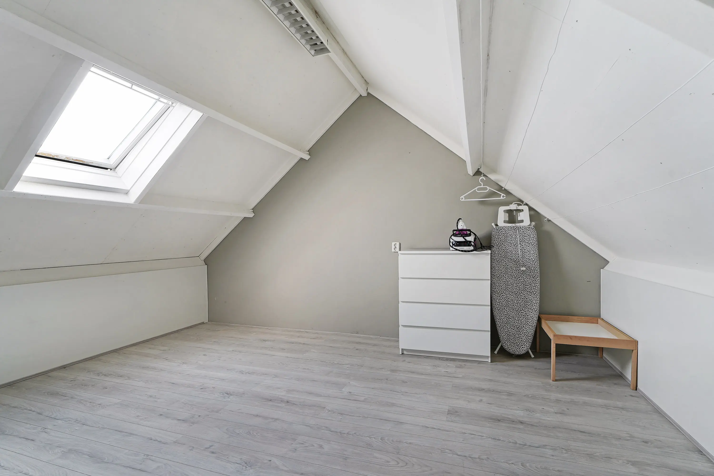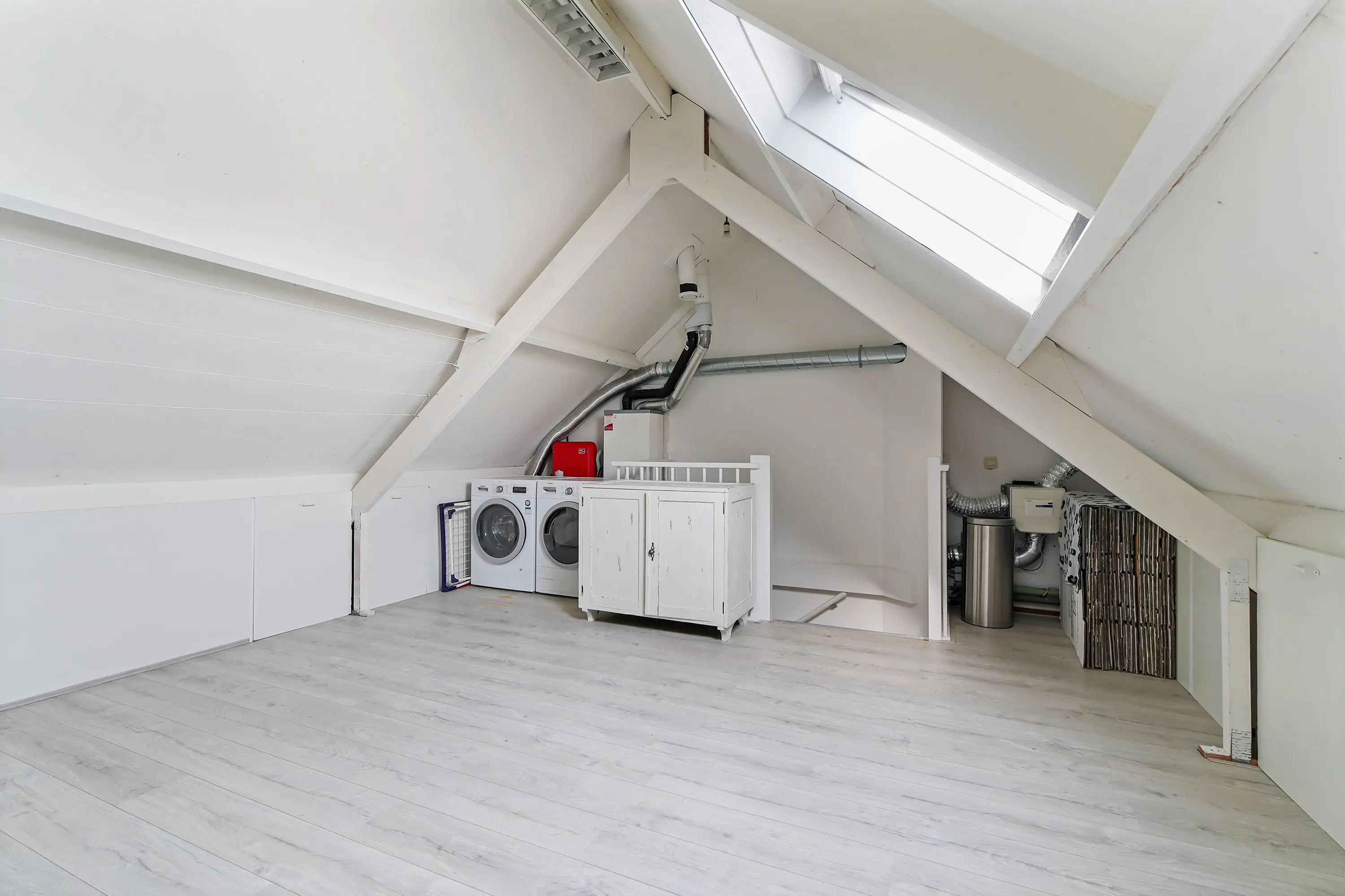 Deze verdieping biedt een vierde, ruime slaapkamer met een Velux dakraam, waardoor de ruimte aangenaam licht is. Achter de knieschotten is extra bergruimte aanwezig. Daarnaast vindt u hier de cv installatie, nieuwe mechanische ventilatie unit en aansluitingen voor de wasmachine en droger.
