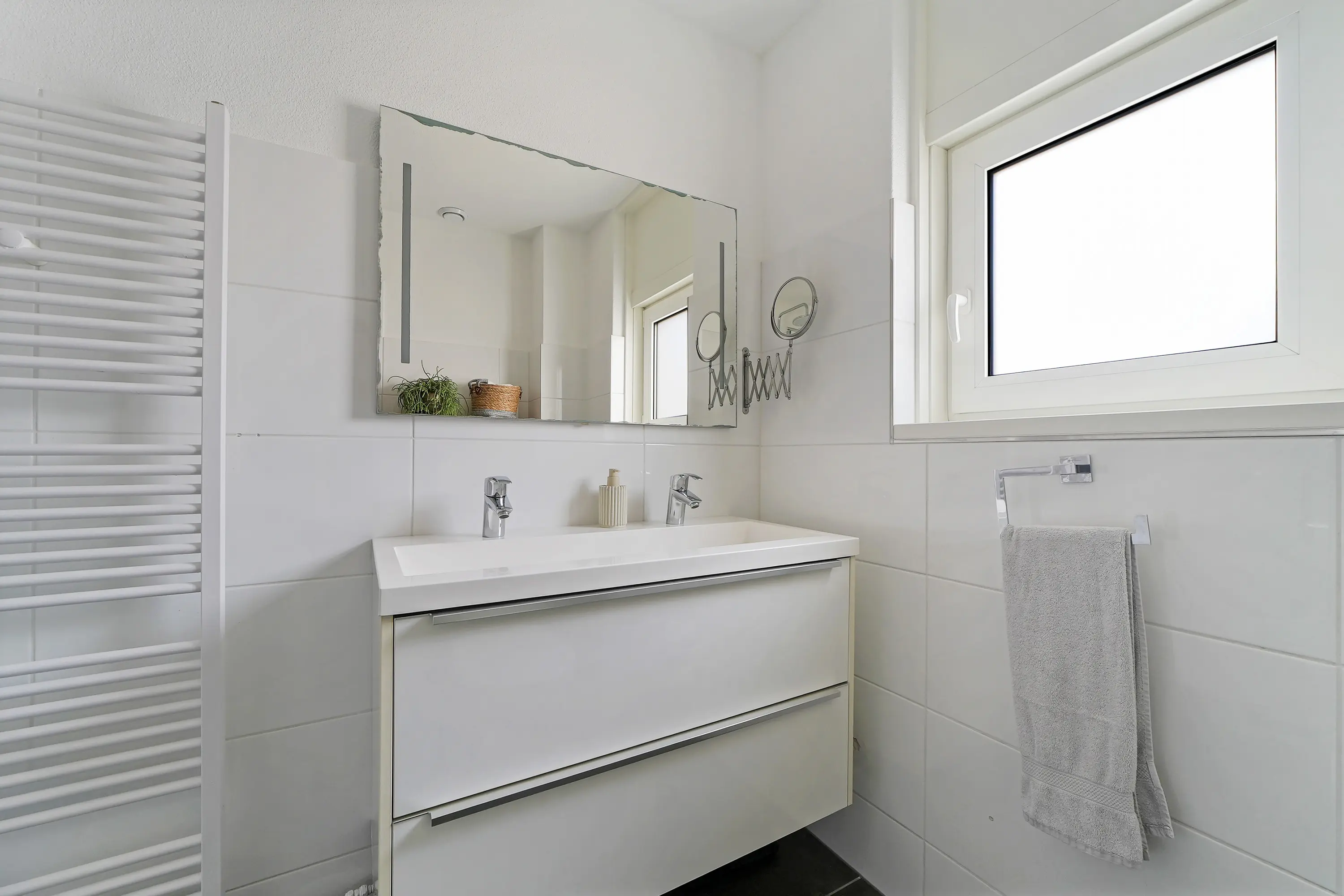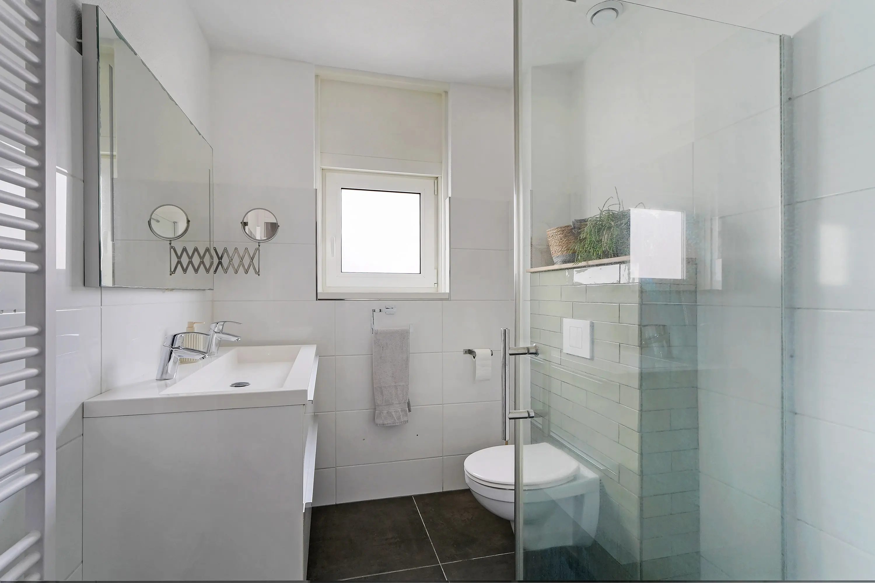 Op de eerste verdieping bevinden zich 3 ruime en keurig afgewerkte slaapkamers, waaronder de riante ouderslaapkamer aan de achterzijde. Ook de andere twee kamers zijn extra ruim dankzij de dakkapel en beschikken over rolluiken. De badkamer is modern uitgevoerd en beschikt over een inloopdouche met glazen wand en deur, een tweede toilet, een dubbele wastafel met meubel en een handdoekradiator.