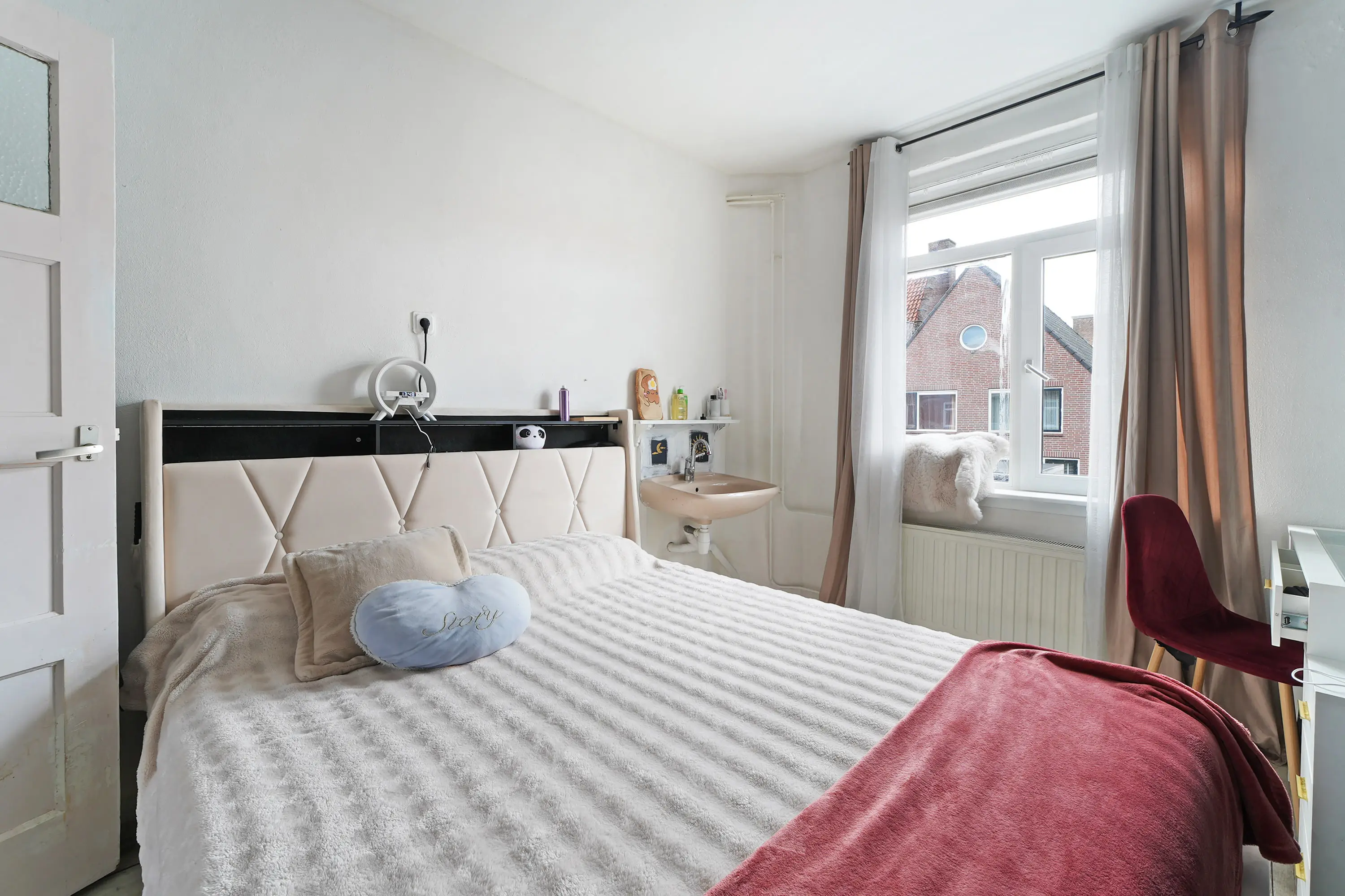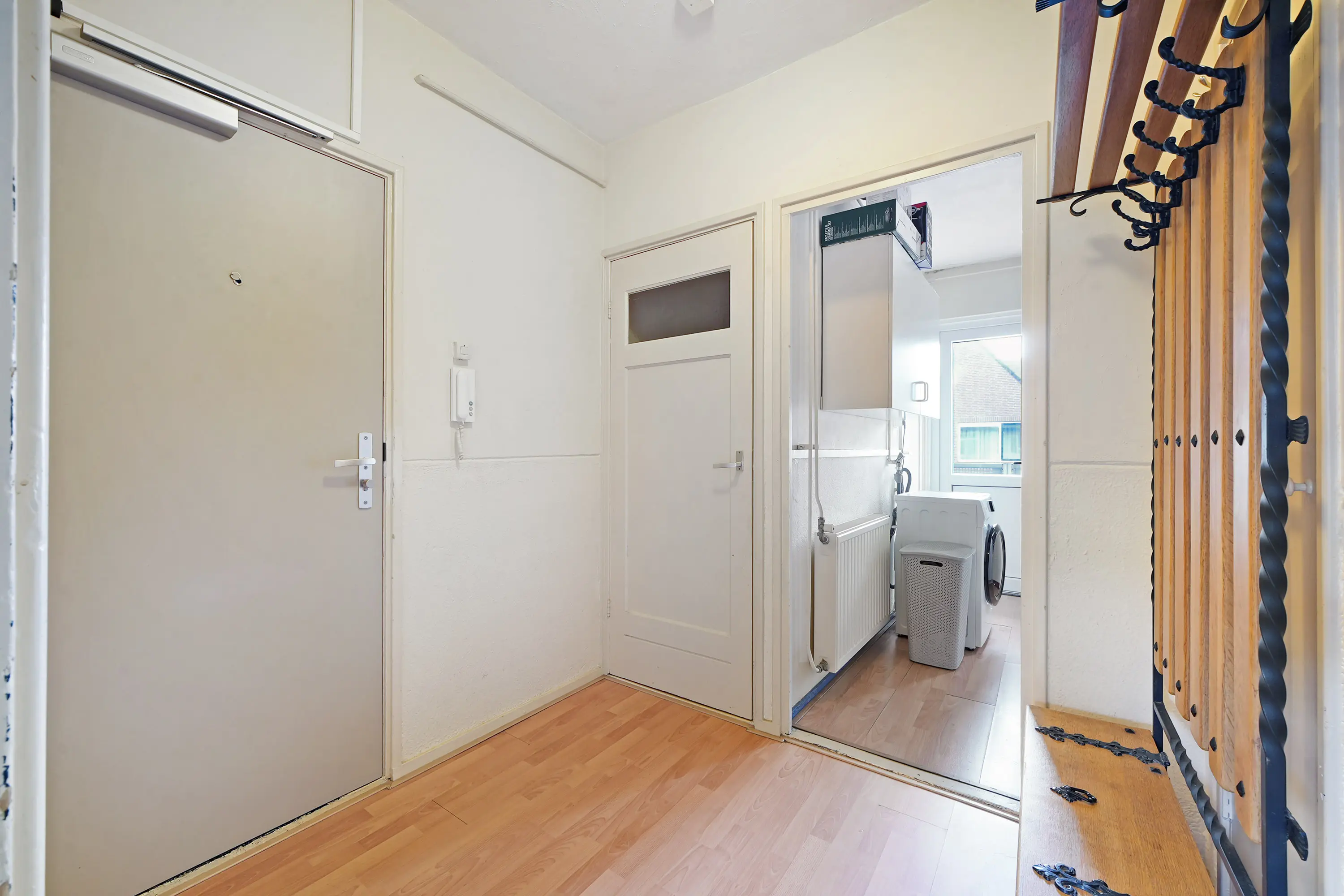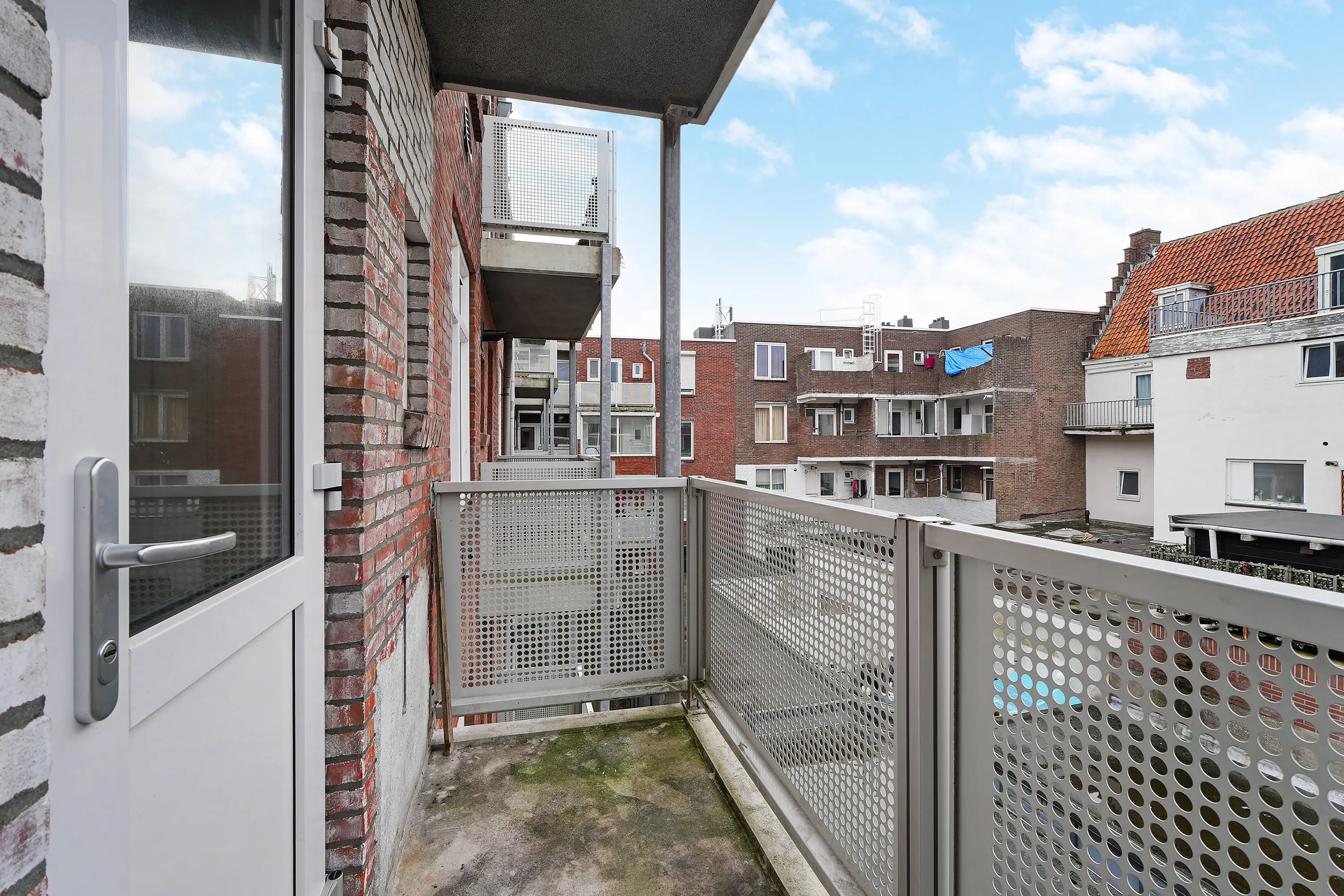 Entree in een afgesloten portiek met brievenbussen en trapopgang naar de appartementen. Daar treft u een ruime hal met toegang tot de 1e slaapkamer aan voorzijde, het toilet en een eenvoudige nette keuken met aansluitend een fijn balkon gelegen op het zuidwesten. Een eenvoudige doucheruimte is bereikbaar via de keuken. Verder een lichte woonkamer met toegang tot de achtergelegen 2e slaapkamer.