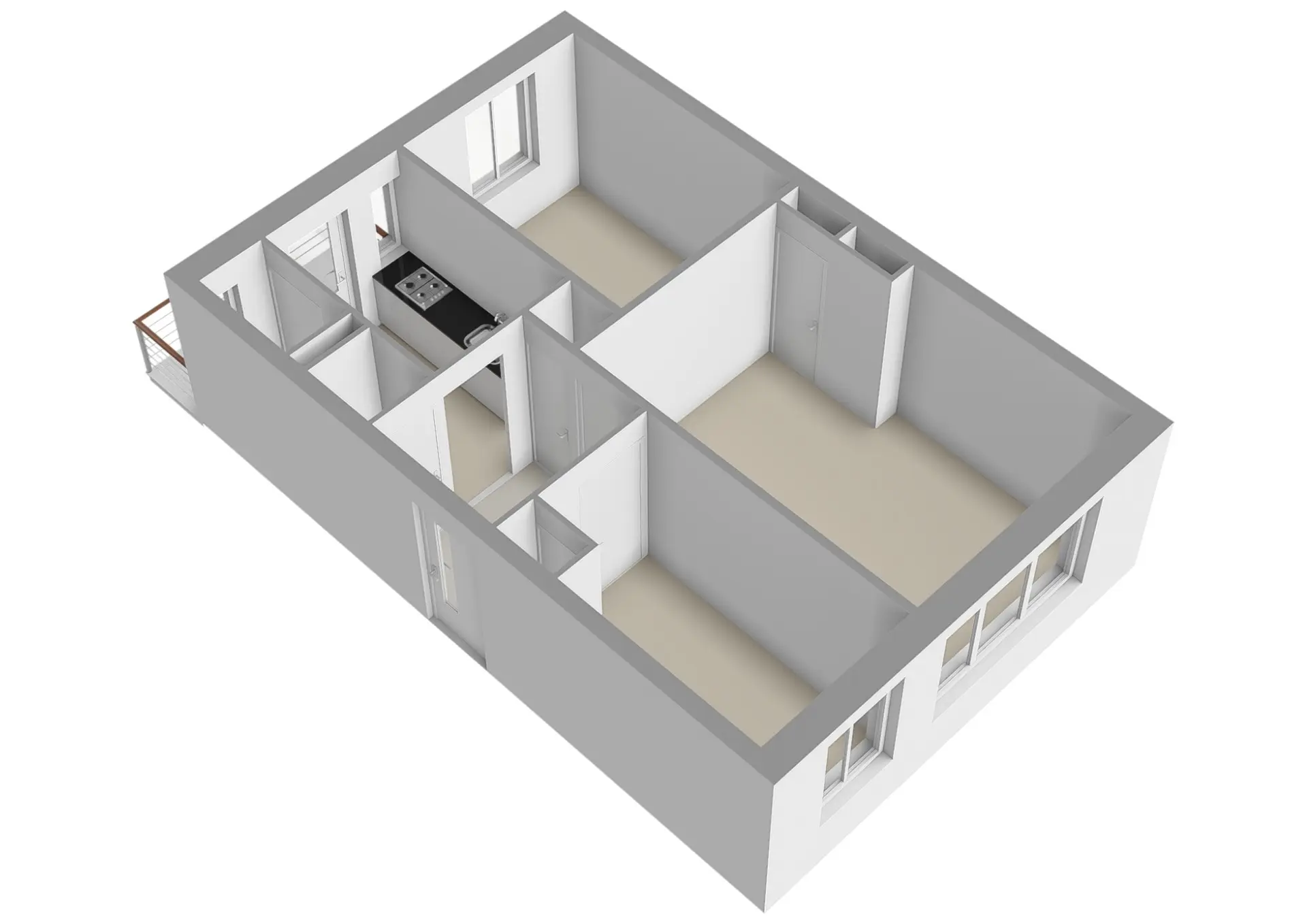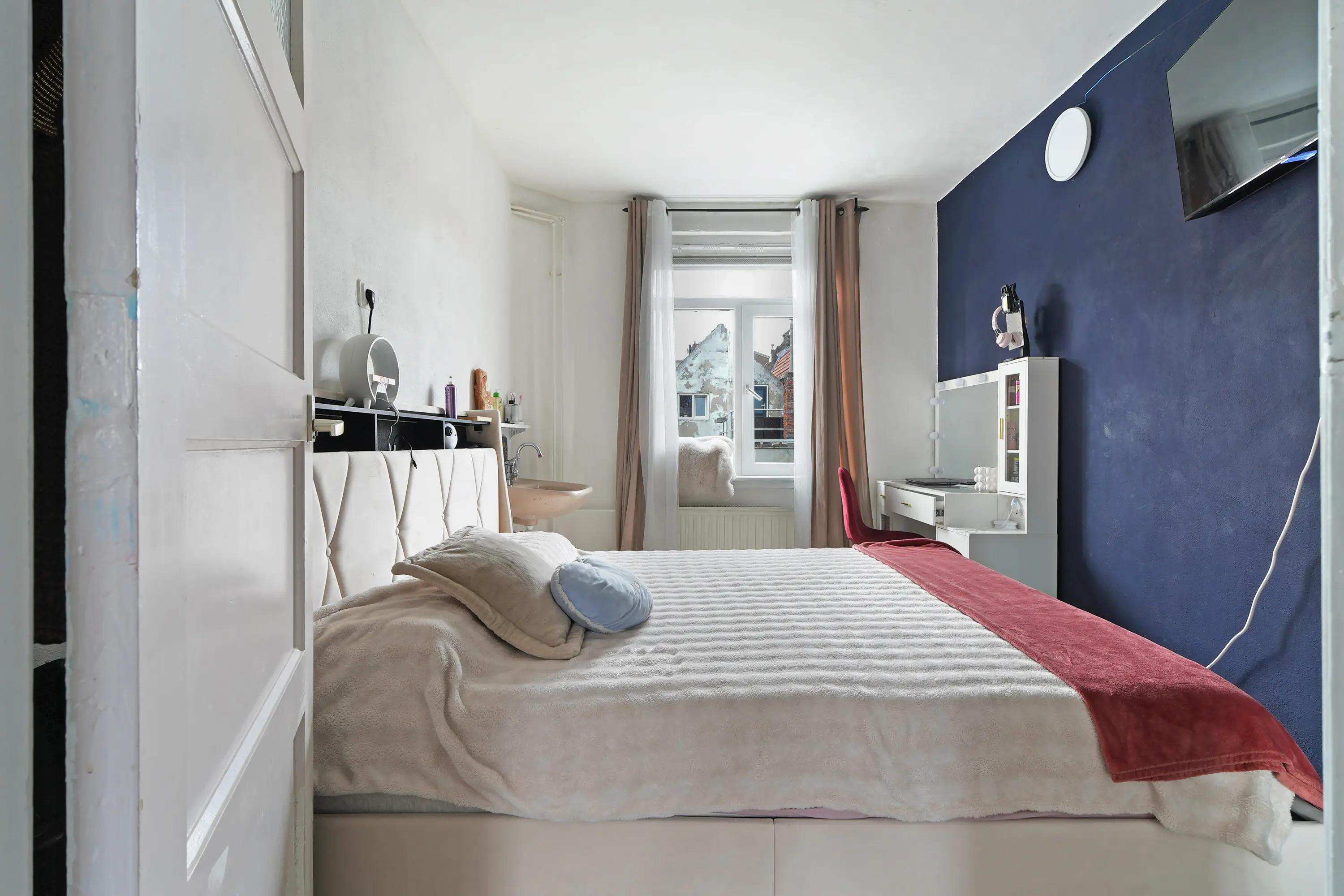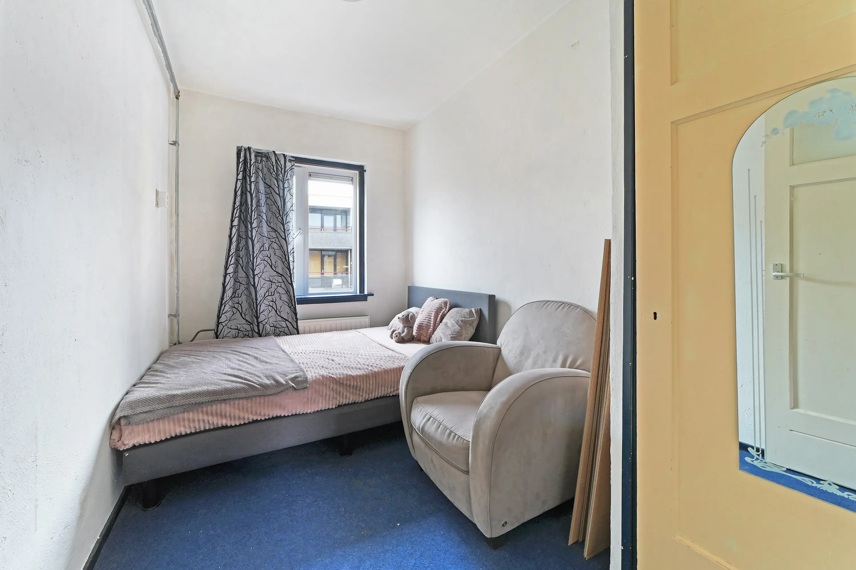 Entree in een afgesloten portiek met brievenbussen en trapopgang naar de appartementen. Daar treft u een ruime hal met toegang tot de 1e slaapkamer aan voorzijde, het toilet en een eenvoudige nette keuken met aansluitend een fijn balkon gelegen op het zuidwesten. Een eenvoudige doucheruimte is bereikbaar via de keuken. Verder een lichte woonkamer met toegang tot de achtergelegen 2e slaapkamer.
