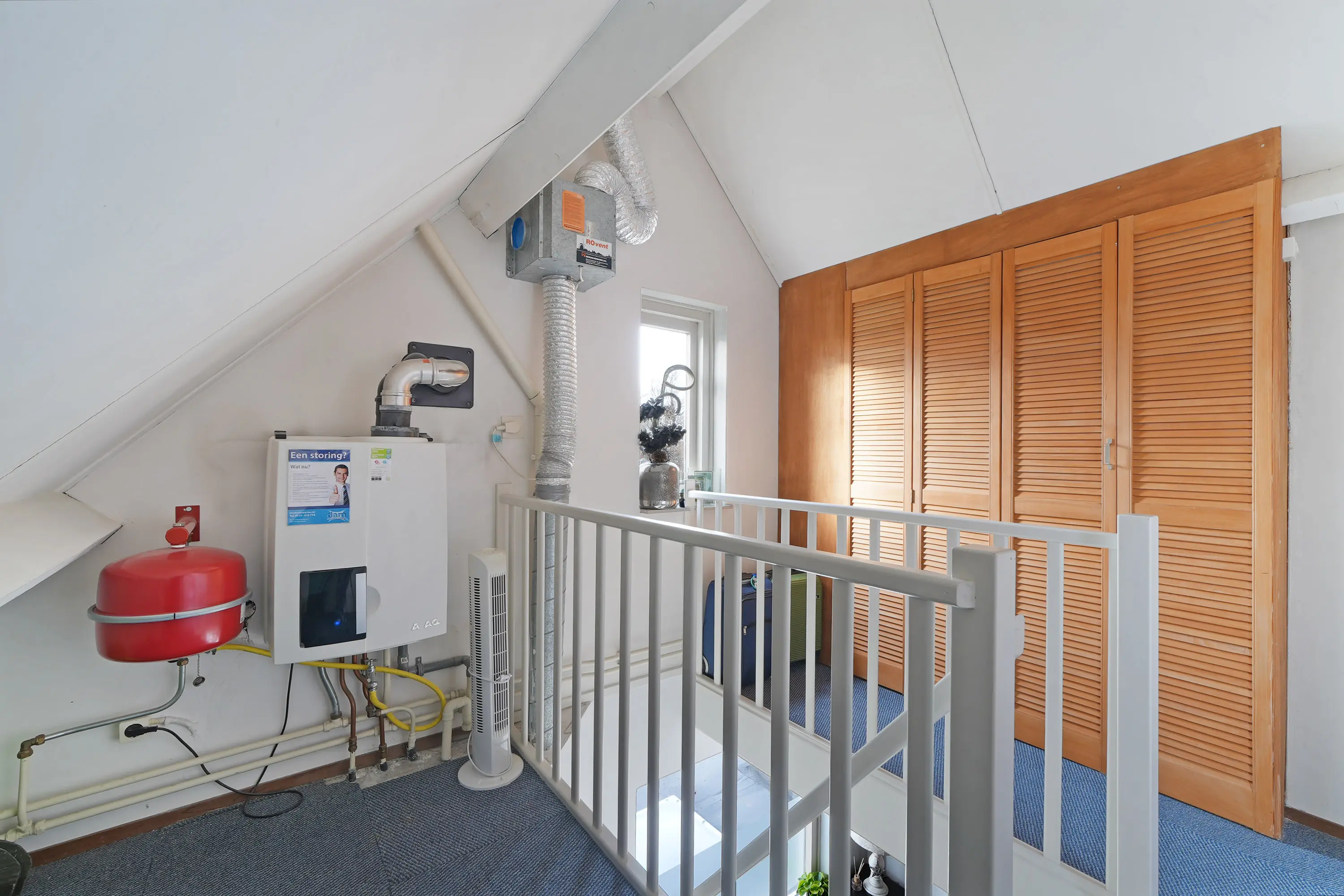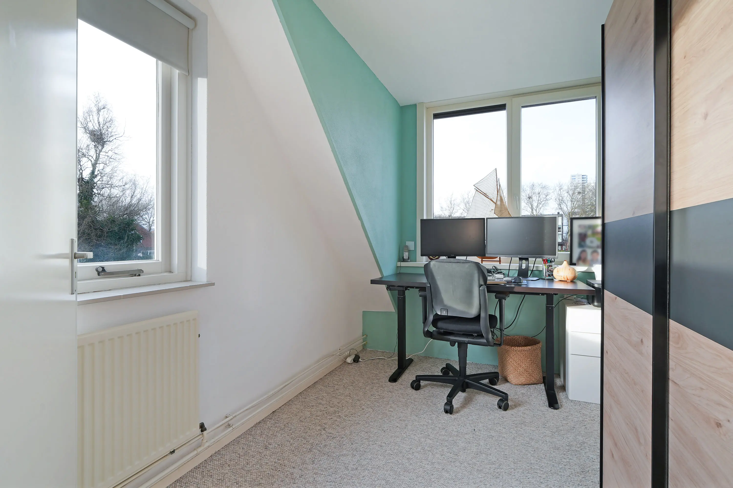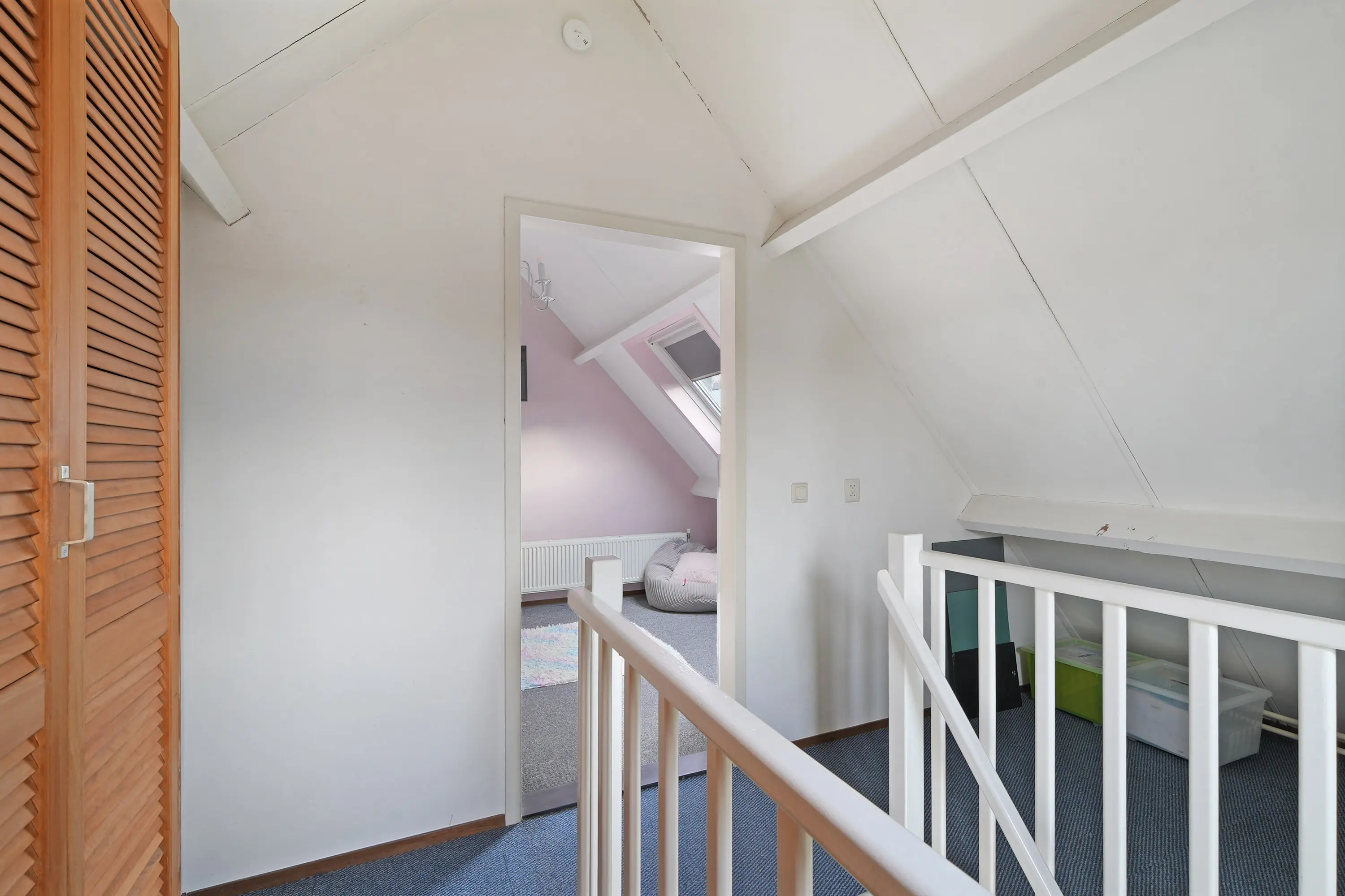 Overloop met opberg mogelijkheden en de vierde slaapkamer. Een mooie ruimte welke goed te gebruiken is als slaap,- werk of kantoorruimte.