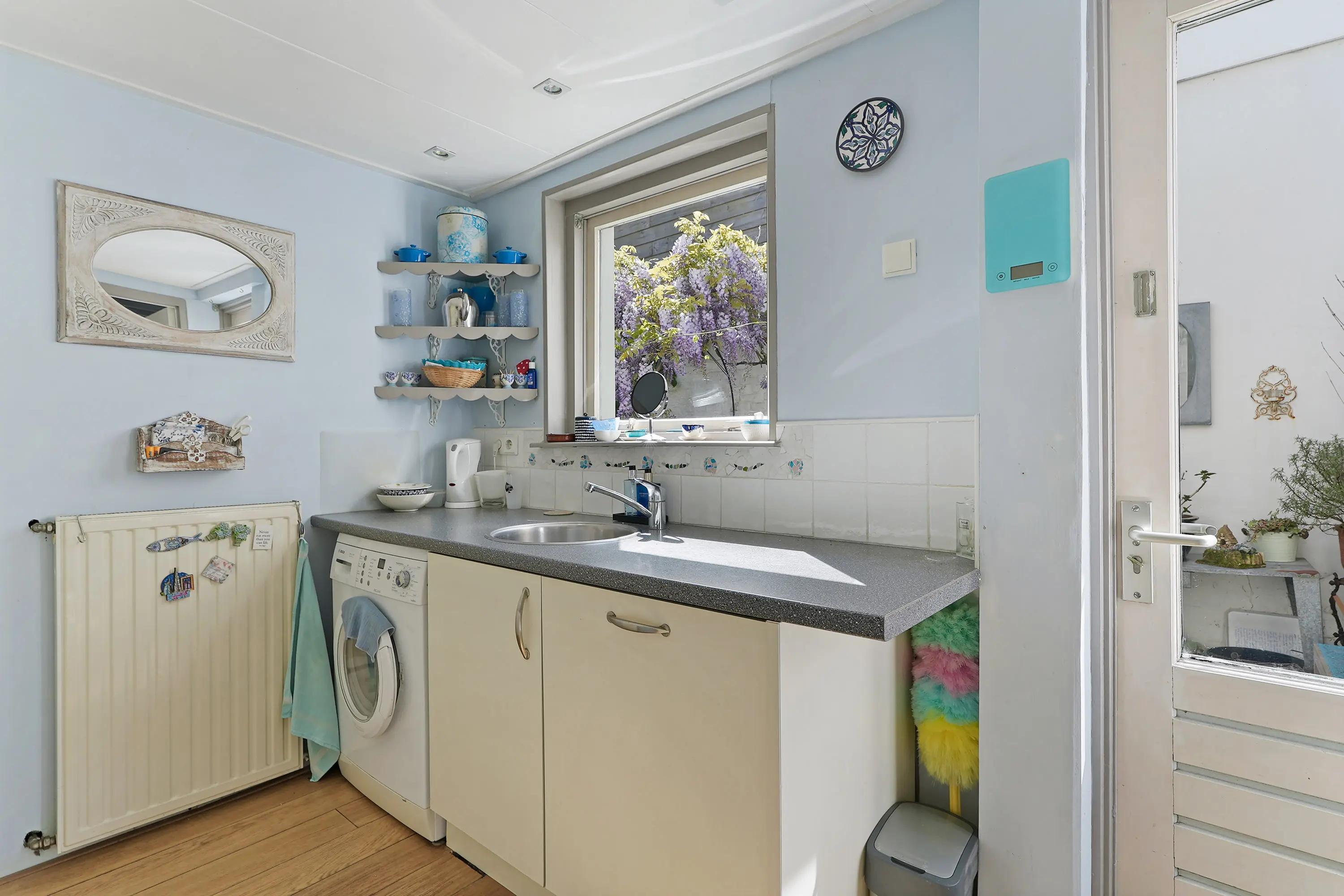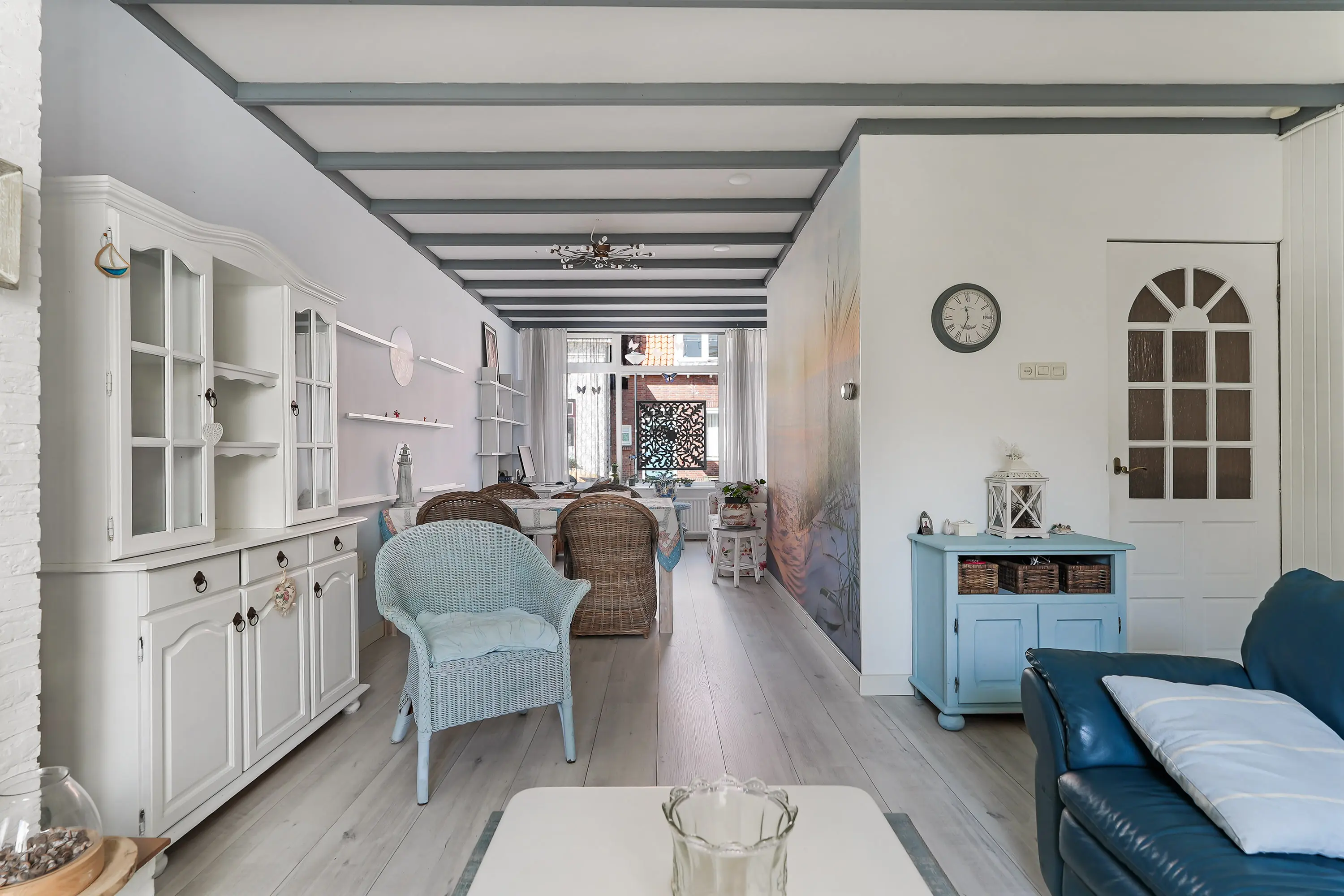 Entree in de hal met meterkast, toilet, trapopgang naar de eerste verdieping en toegang tot de woonkamer. De ruime woonkamer valt op door het balkenplafond en de grote raampartijen aan zowel de straat- als tuinzijde. In de aanbouw bevindt zich de keuken, uitgevoerd in parallelopstelling en voorzien van de aansluiting voor witgoed. Vanuit de keuken loopt u direct de tuin in.