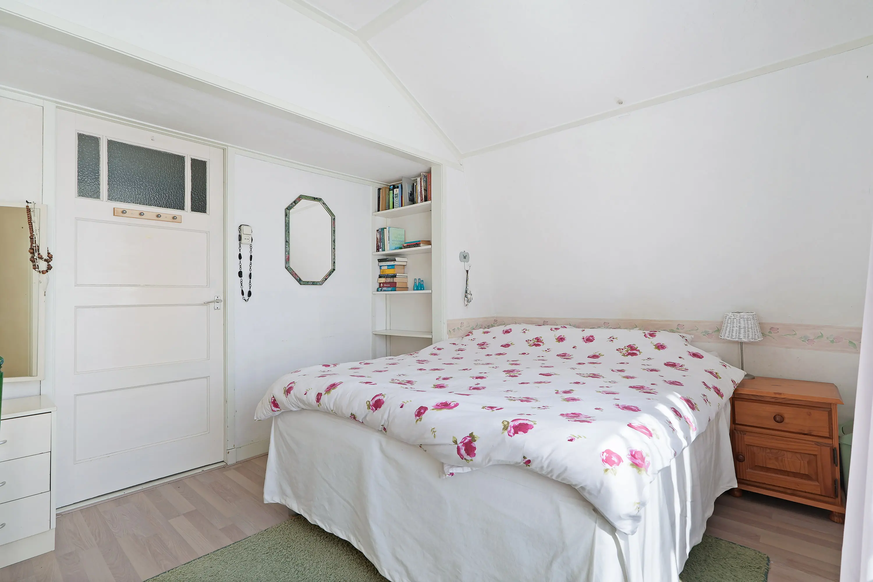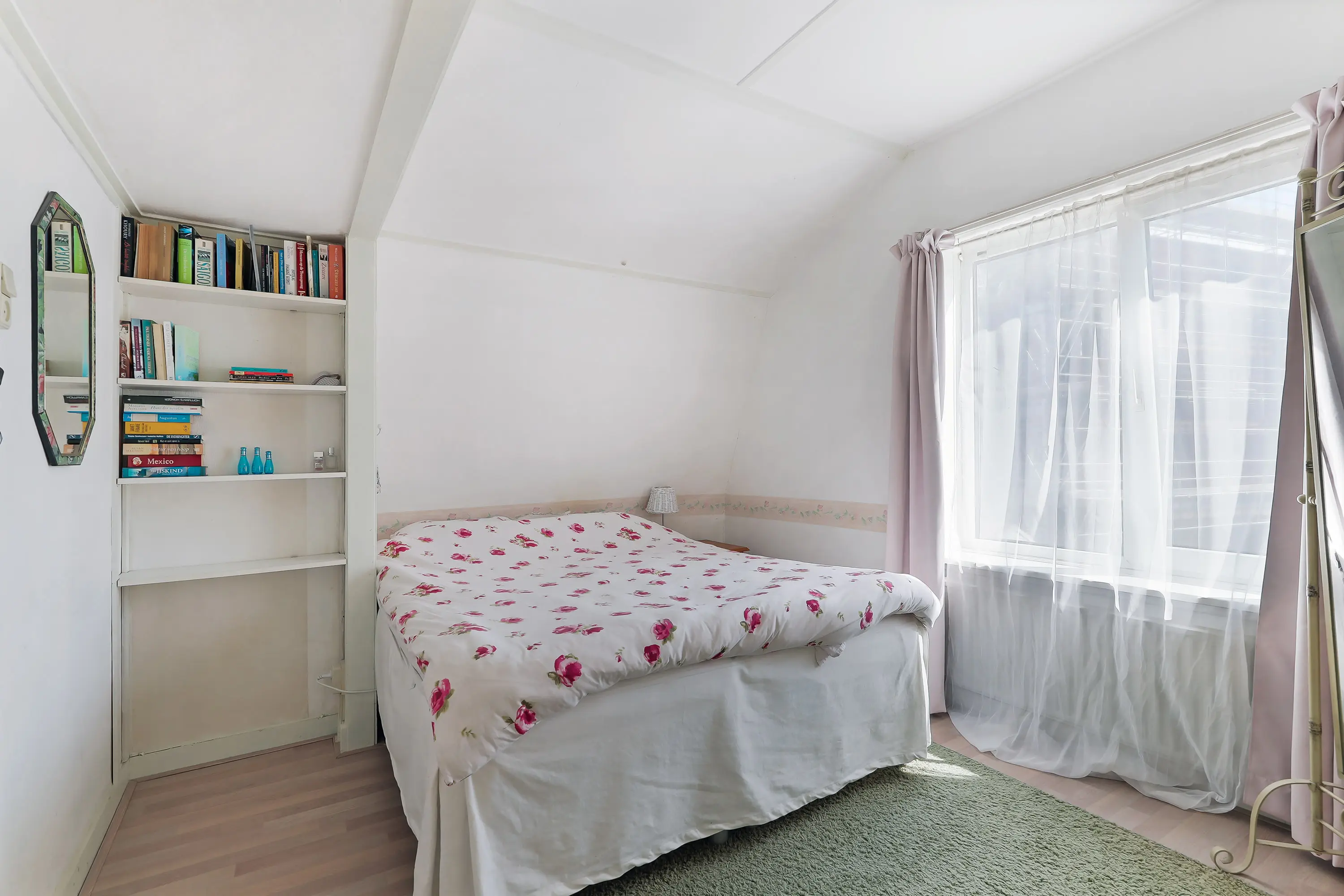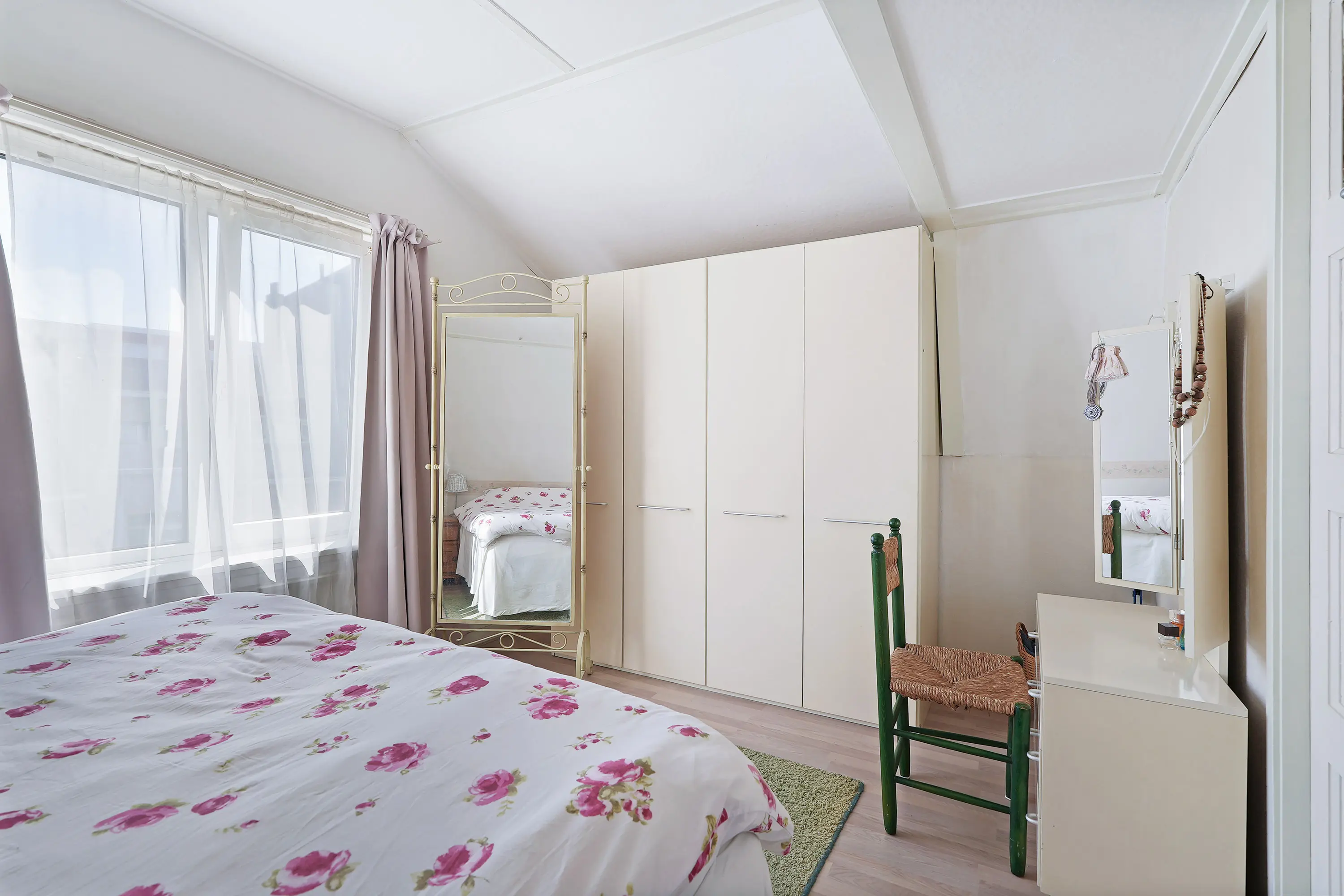 De overloop geeft toegang tot twee ruime slaapkamers, waaronder de ouderslaapkamer aan de tuinzijde. De verzorgde badkamer is eveneens royaal en uitgerust met een douche, wastafel, tweede toilet en een praktische ingebouwde kastenwand onder het raam.