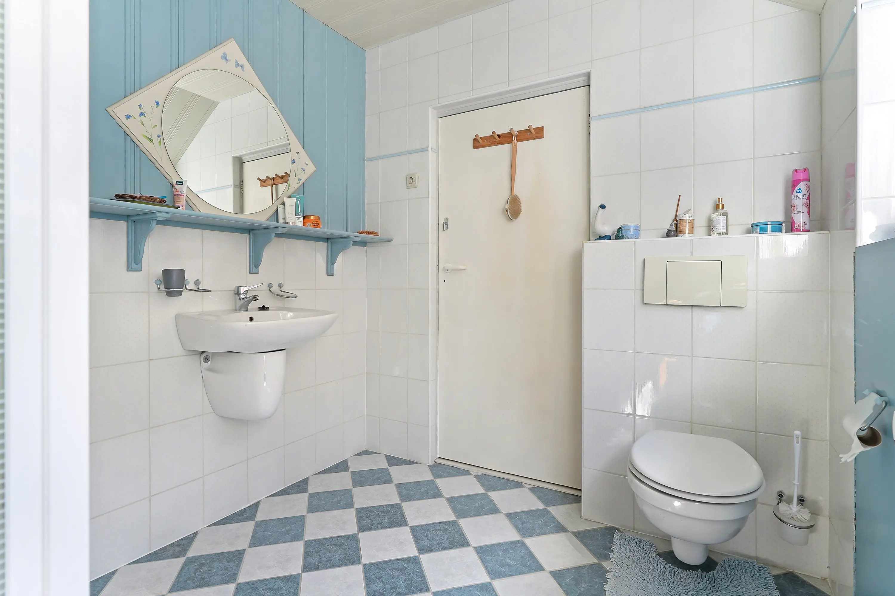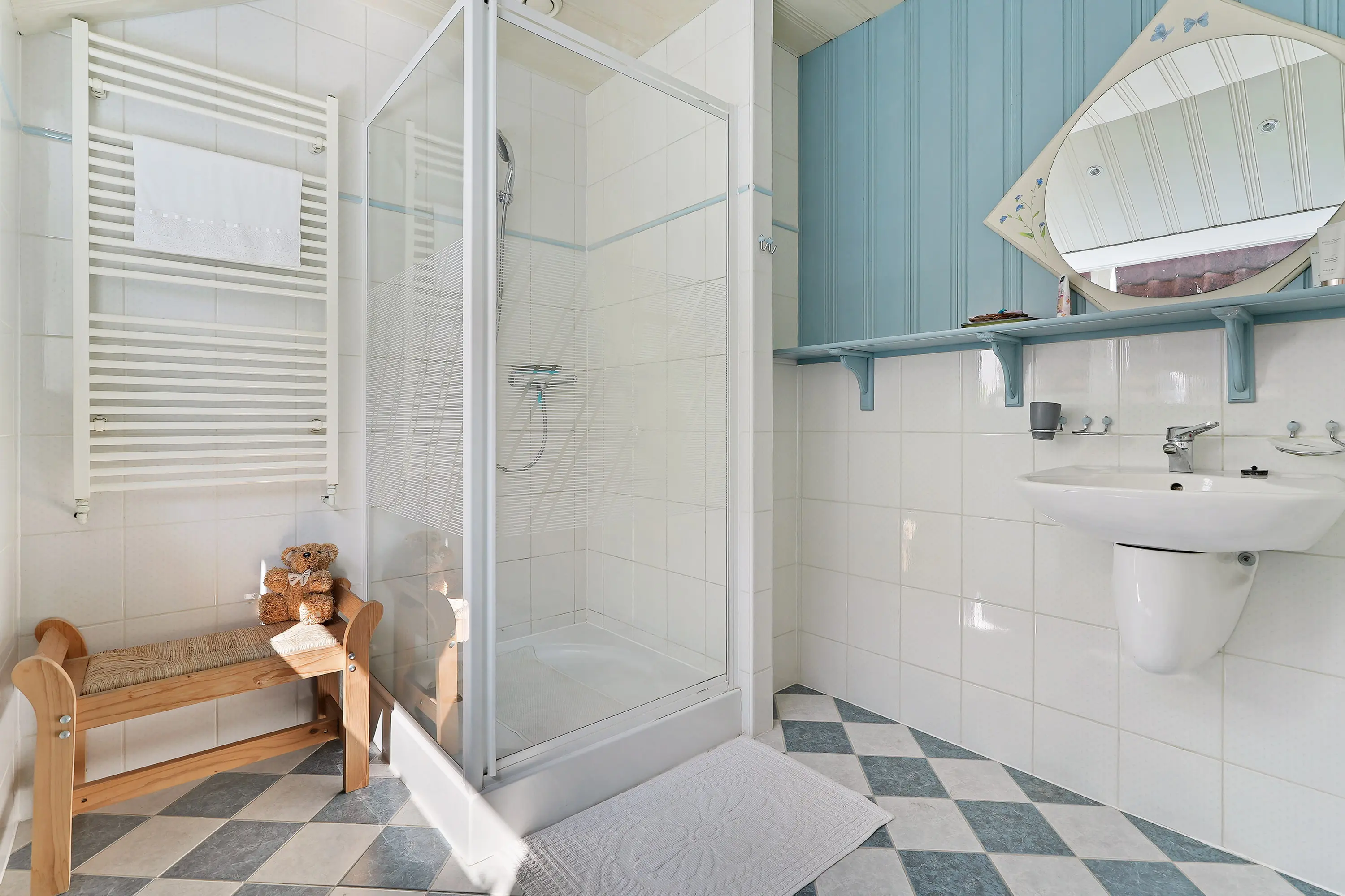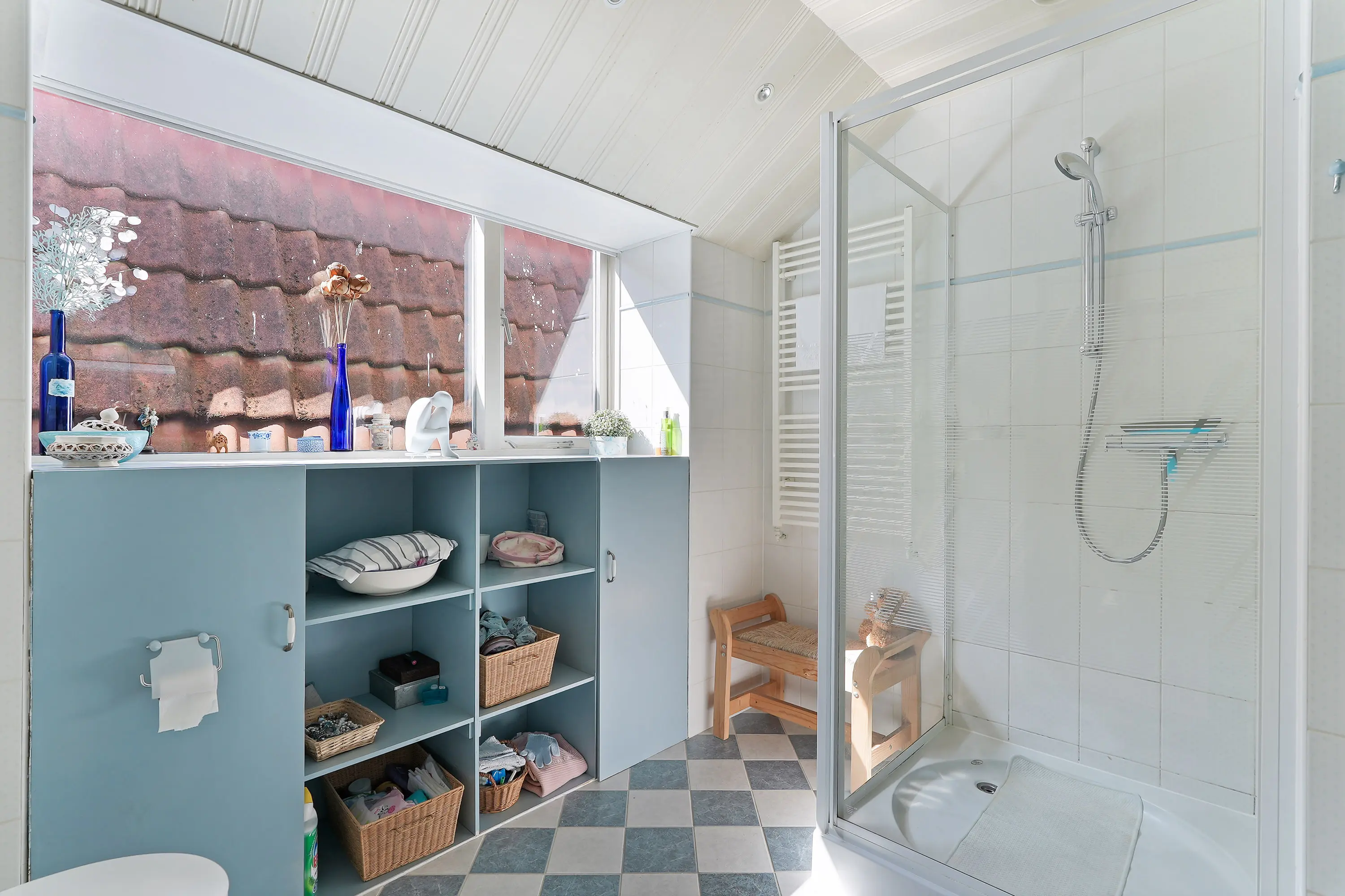 De overloop geeft toegang tot twee ruime slaapkamers, waaronder de ouderslaapkamer aan de tuinzijde. De verzorgde badkamer is eveneens royaal en uitgerust met een douche, wastafel, tweede toilet en een praktische ingebouwde kastenwand onder het raam.