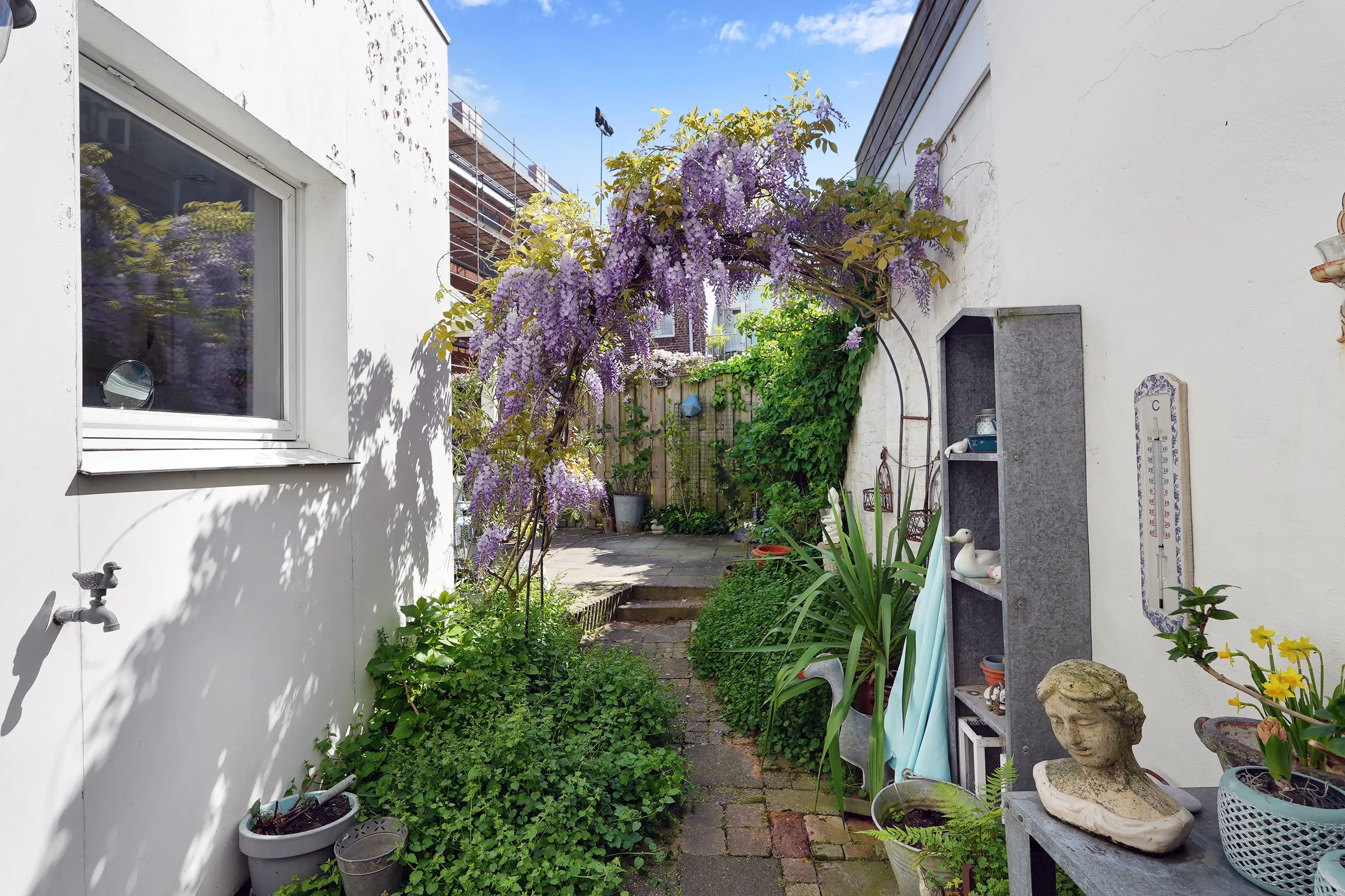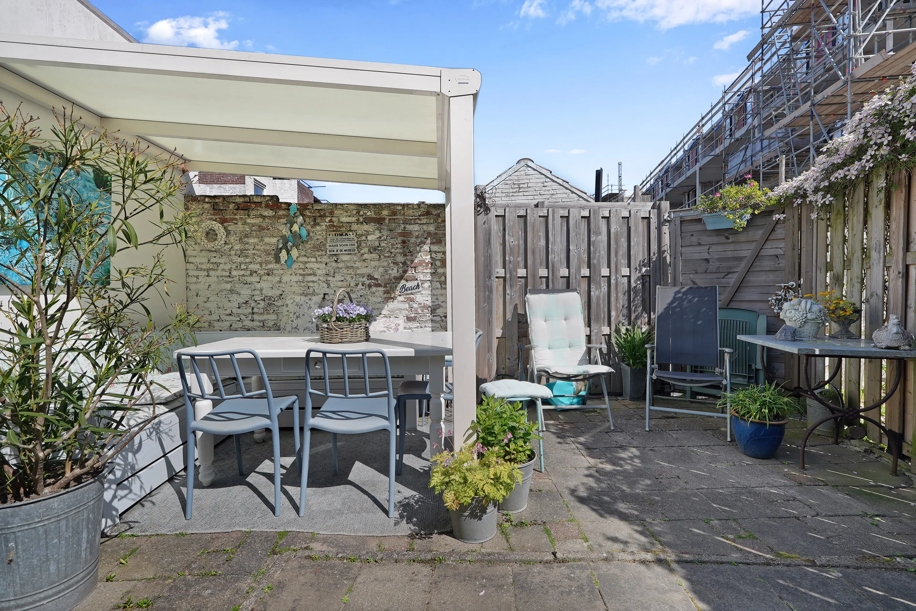 De zonnige stadstuin is netjes aangelegd met sierbestrating — een fijne plek om even tot rust te komen. Achterin de tuin vindt u de vrije achterom.