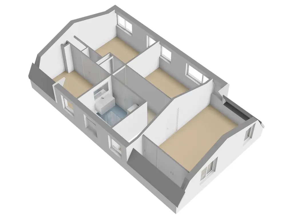 Overloop met luik naar de bergzolder, vier mooie slaapkamers, waarvan drie met vaste kastruimte en vervolgens een complete, volledig betegelde badkamer voorzien van ligbad, douchecabine, wastafelmeubel, toilet, design-radiator en wasmachineaansluiting.