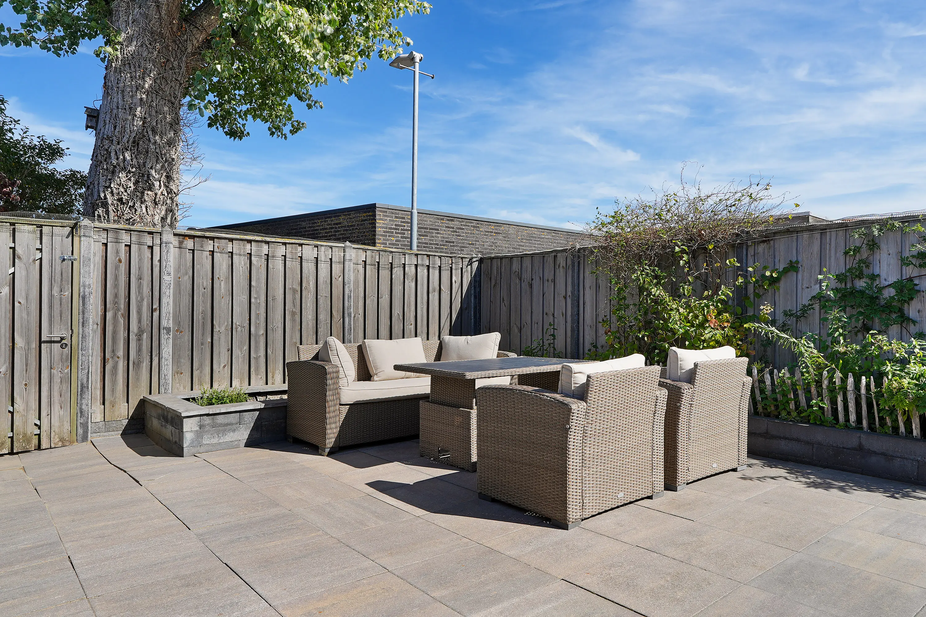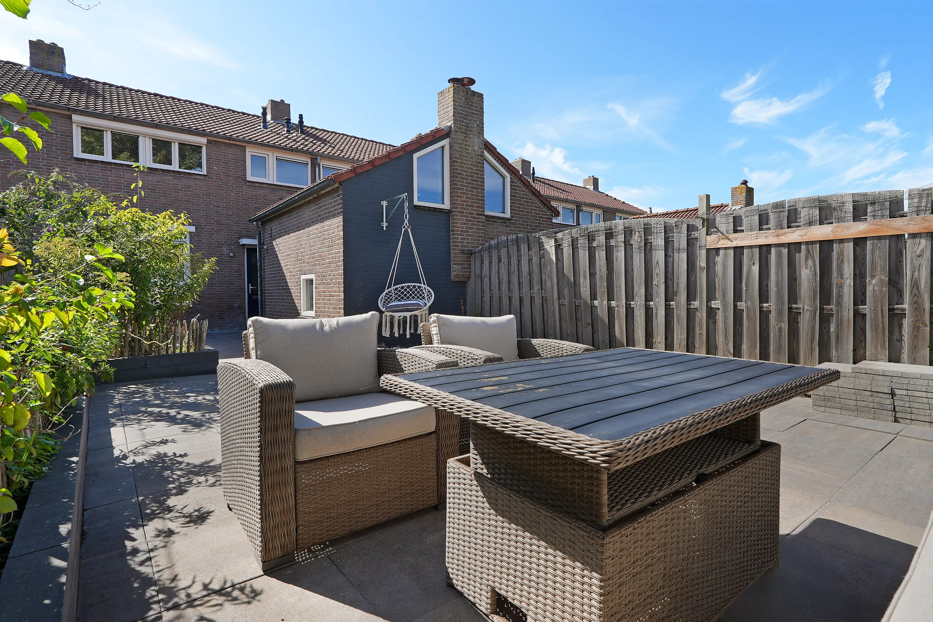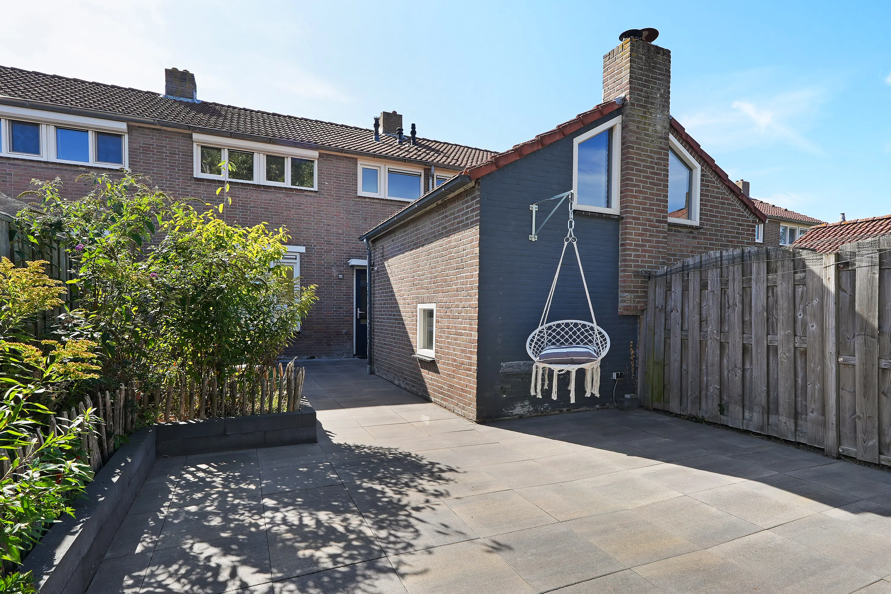 De achtertuin is verrassend ruim van opzet en biedt een heerlijke combinatie van privacy, groen en zon. Dankzij de gunstige ligging is er de hele dag door wel een plekje in de zon te vinden. De tuin is onderhoudsarm ingericht, maar biedt ook voldoende ruimte voor liefhebbers die graag een groen accent of een moestuintje willen toevoegen.