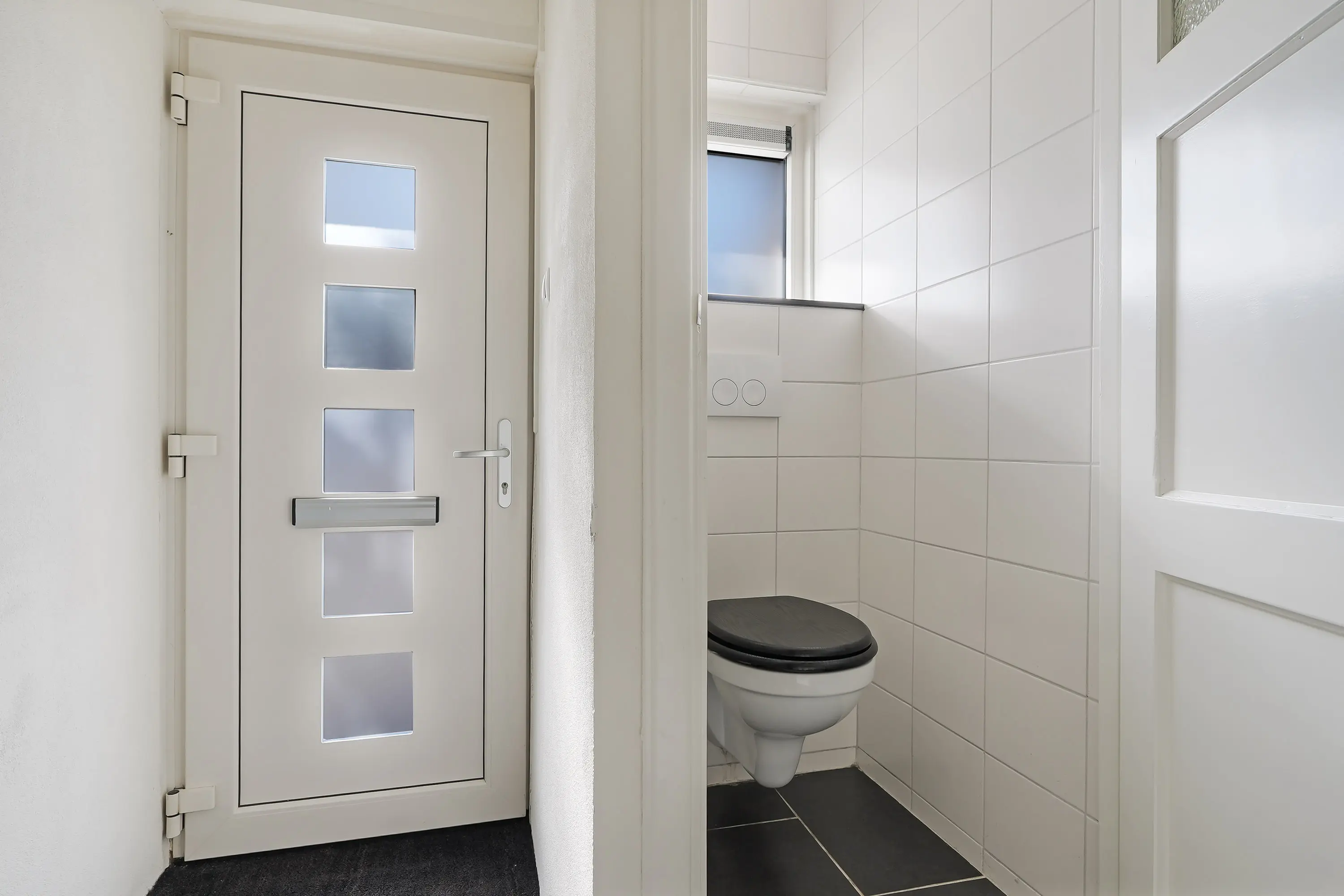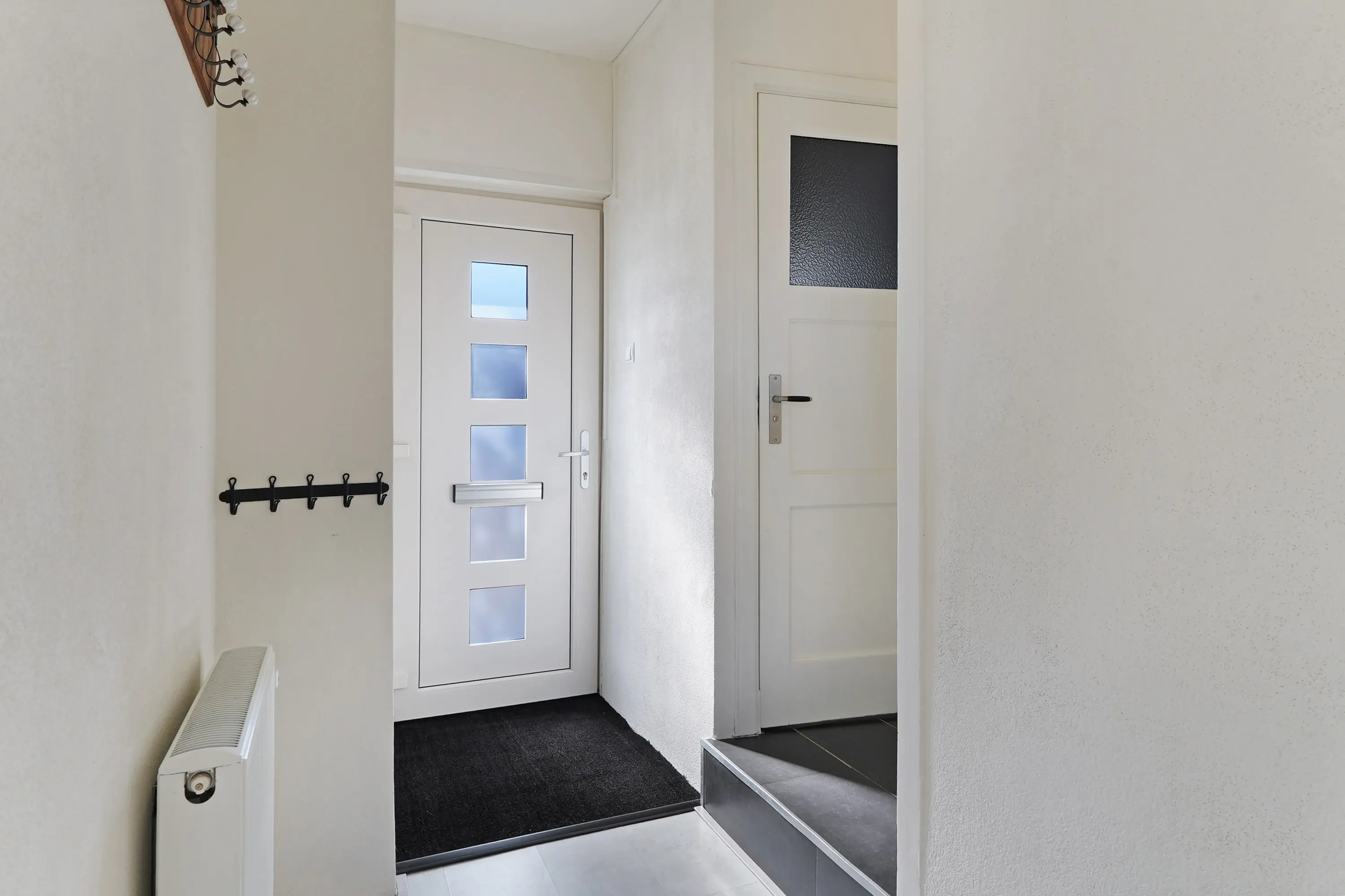 Bij aankomst in de straat bij de woning parkeer je gemakkelijk in één van de parkeervakken voor de woning. De verzorgde voortuin leidt naar de nette entree, waar ruimte is voor jassen en schoenen, de trapopgang en het toilet.