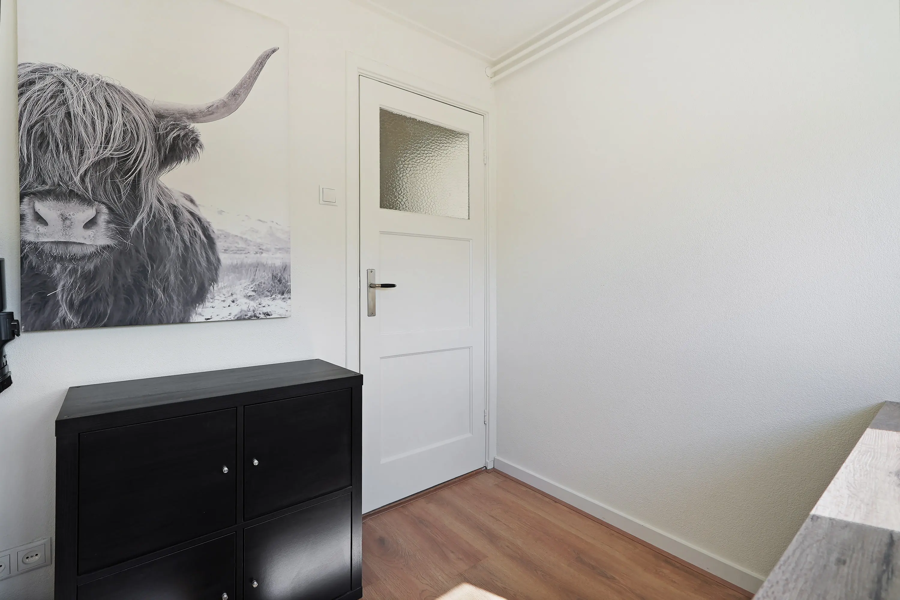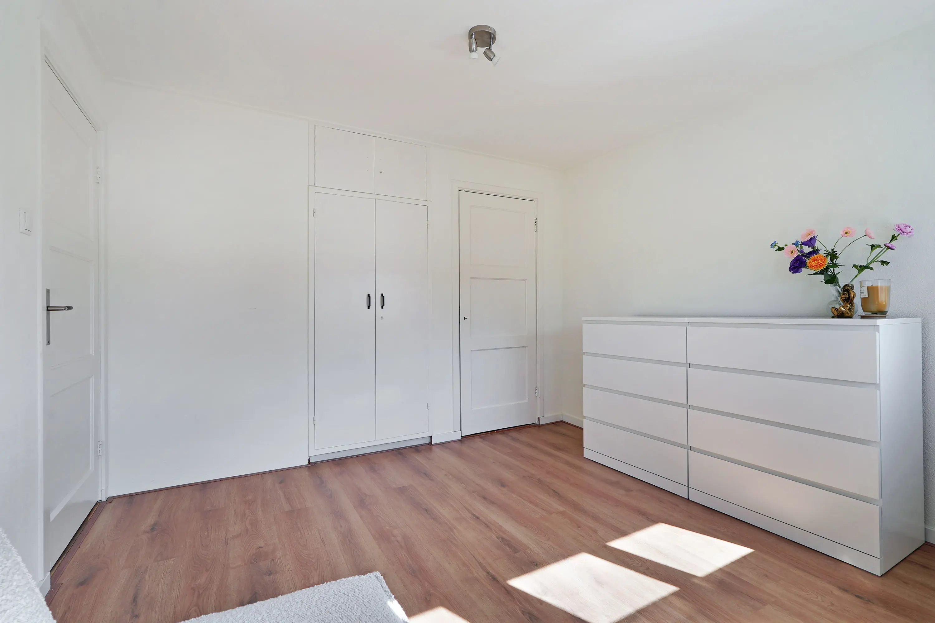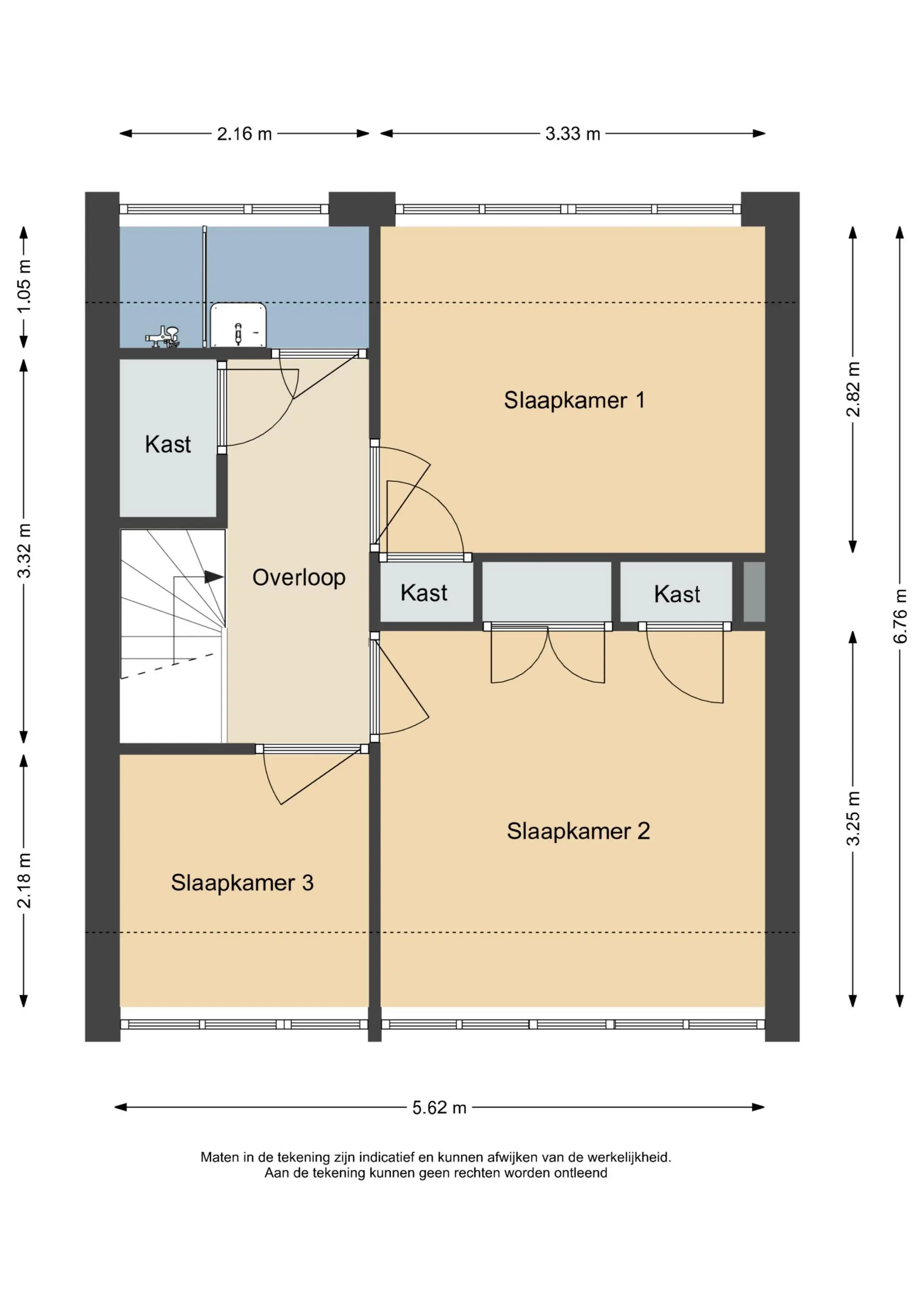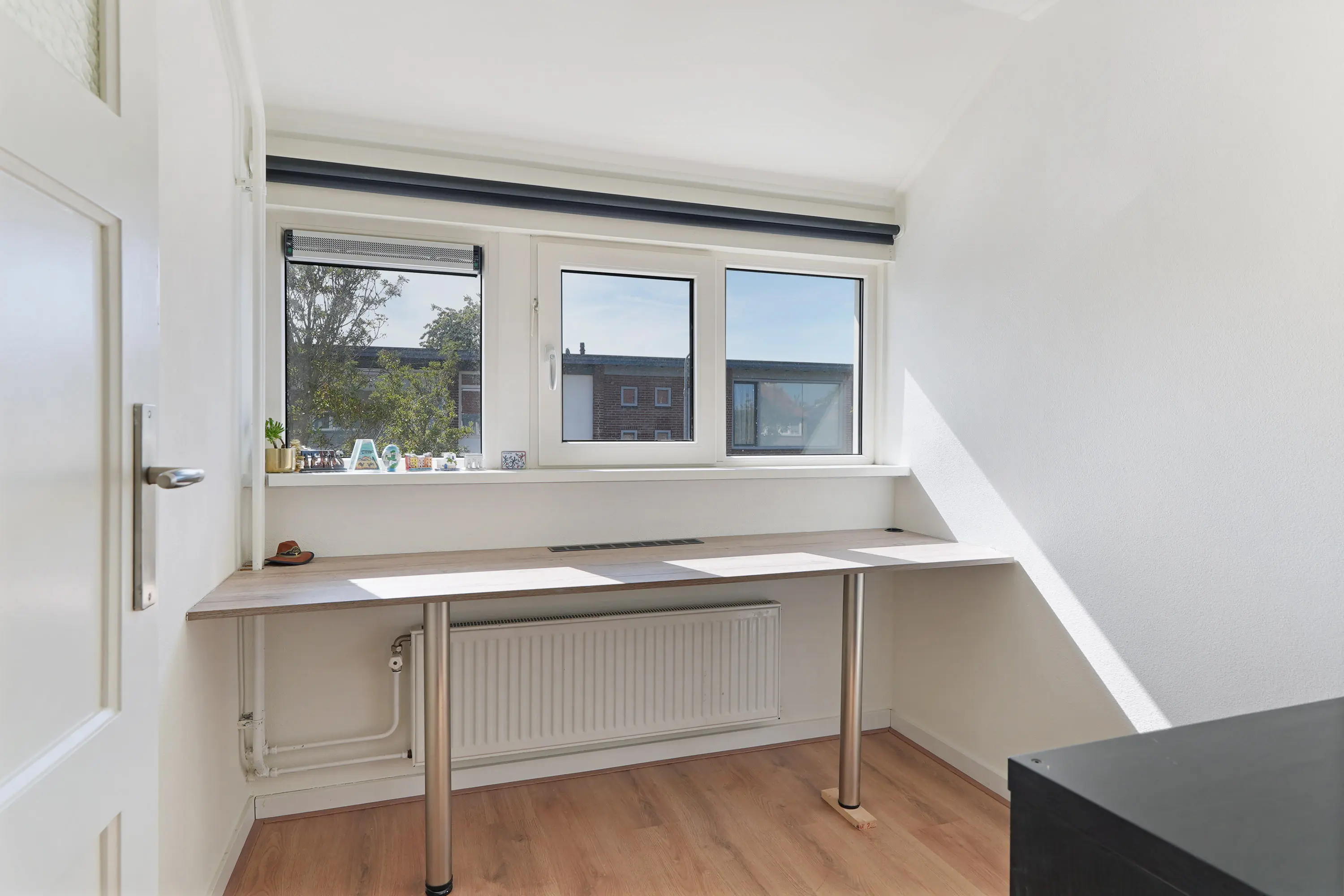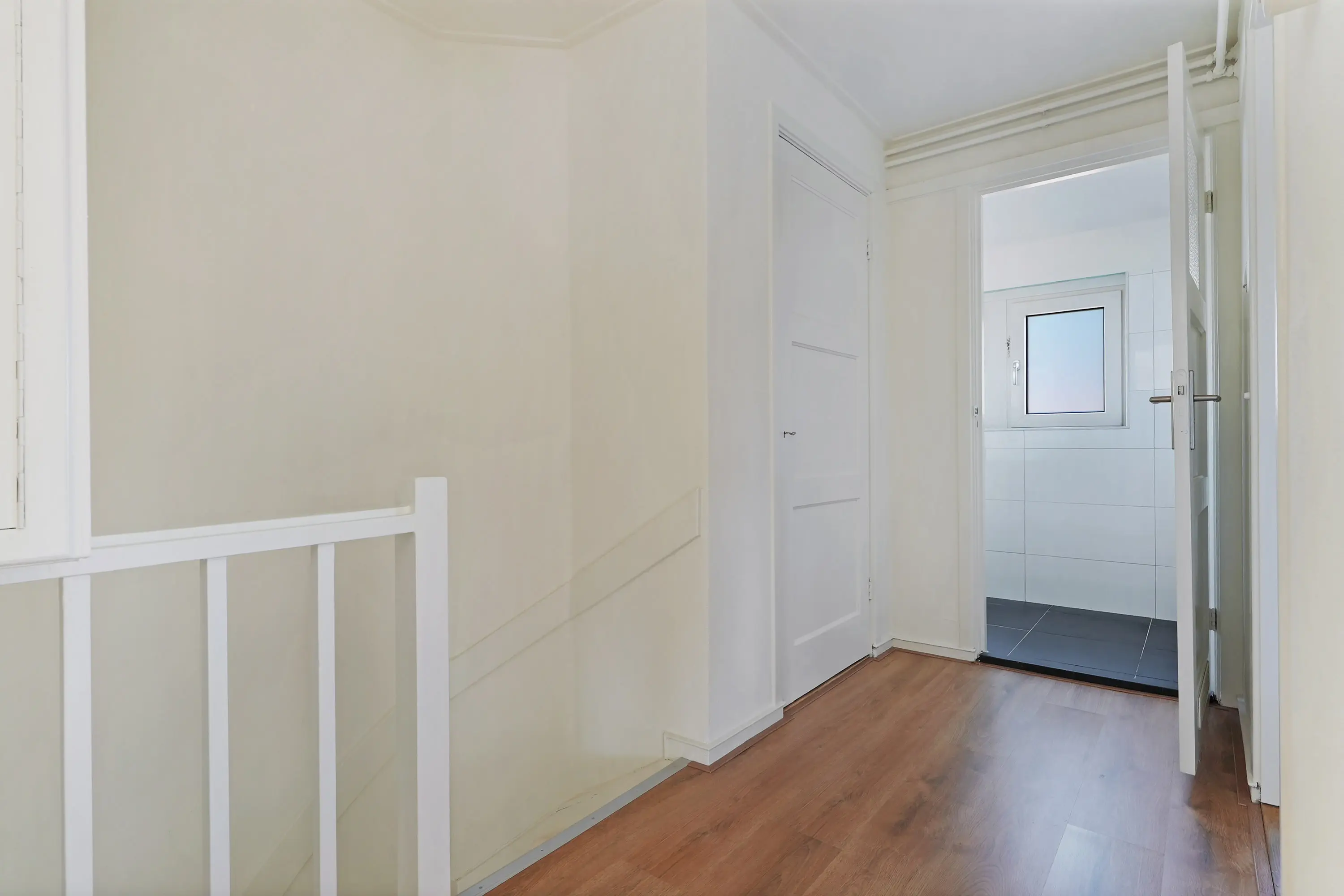 De vaste trap brengt je naar de overloop, van waaruit de drie slaapkamers bereikbaar zijn. De kamers variëren in grootte en bieden voor een klein gezin voldoende leefruimte. Op de hele verdieping ligt een moderne laminaatvloer, wat zorgt voor een frisse en eigentijdse uitstraling. De vaste kasten zorgen voor extra bergruimte.