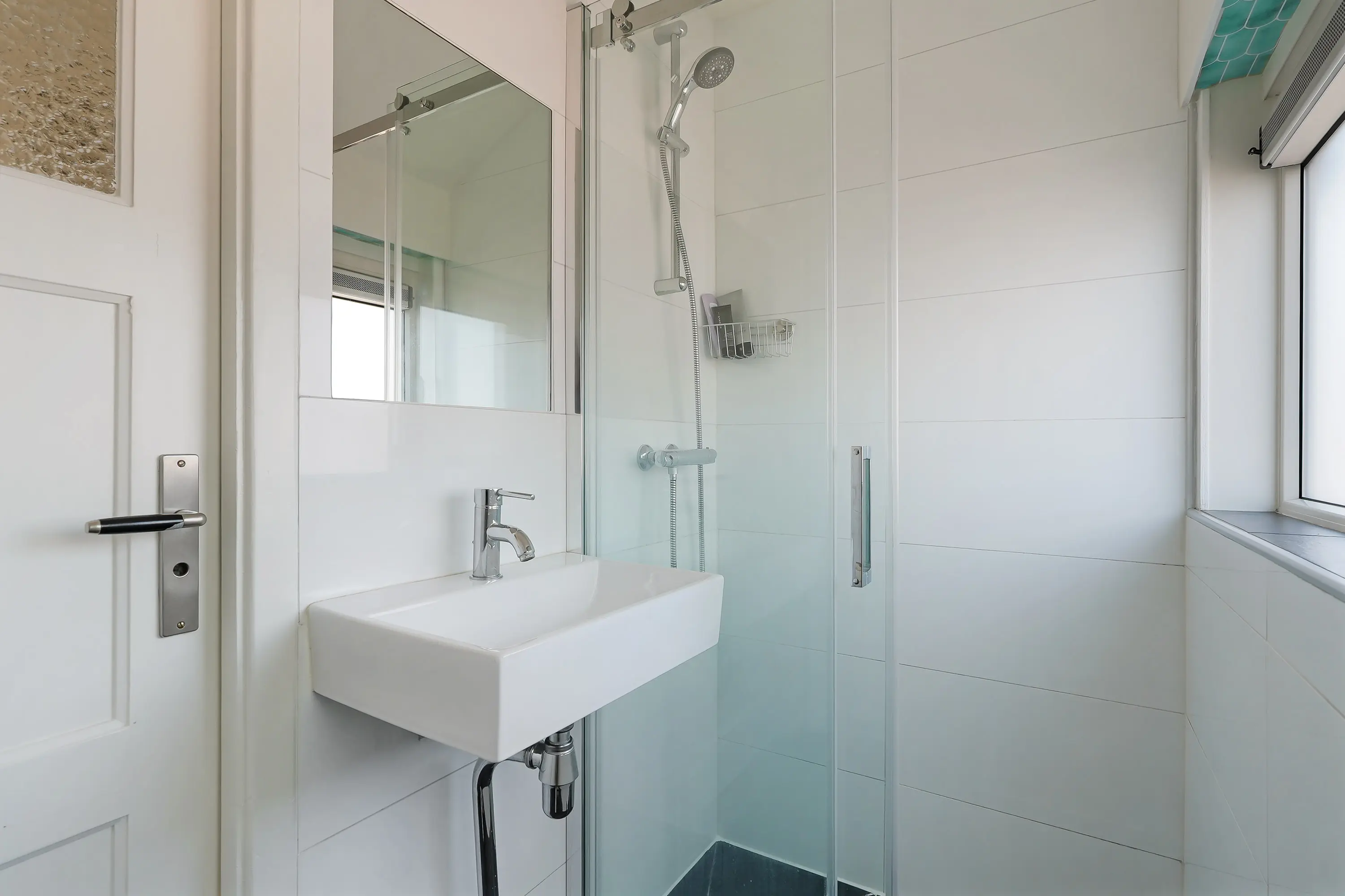De badkamer is netjes afgewerkt, voorzien van een douche en wastafel, en valt op door het natuurlijke licht dat binnenvalt via het grote raam.