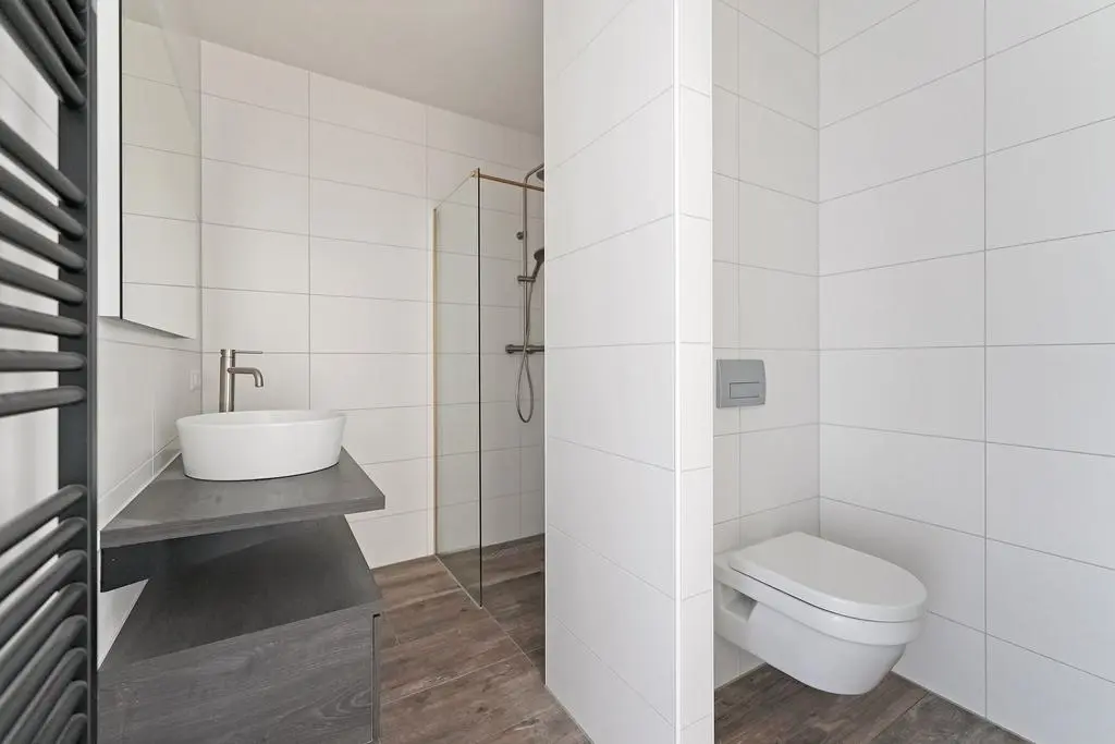 De hal verleent mede toegang tot de master bedroom, de 2e slaapkamer en de badkamer. De badkamer is voorzien van luxe sanitair zoals een fijne inloopdouche, wastafelmeubel en een toilet.