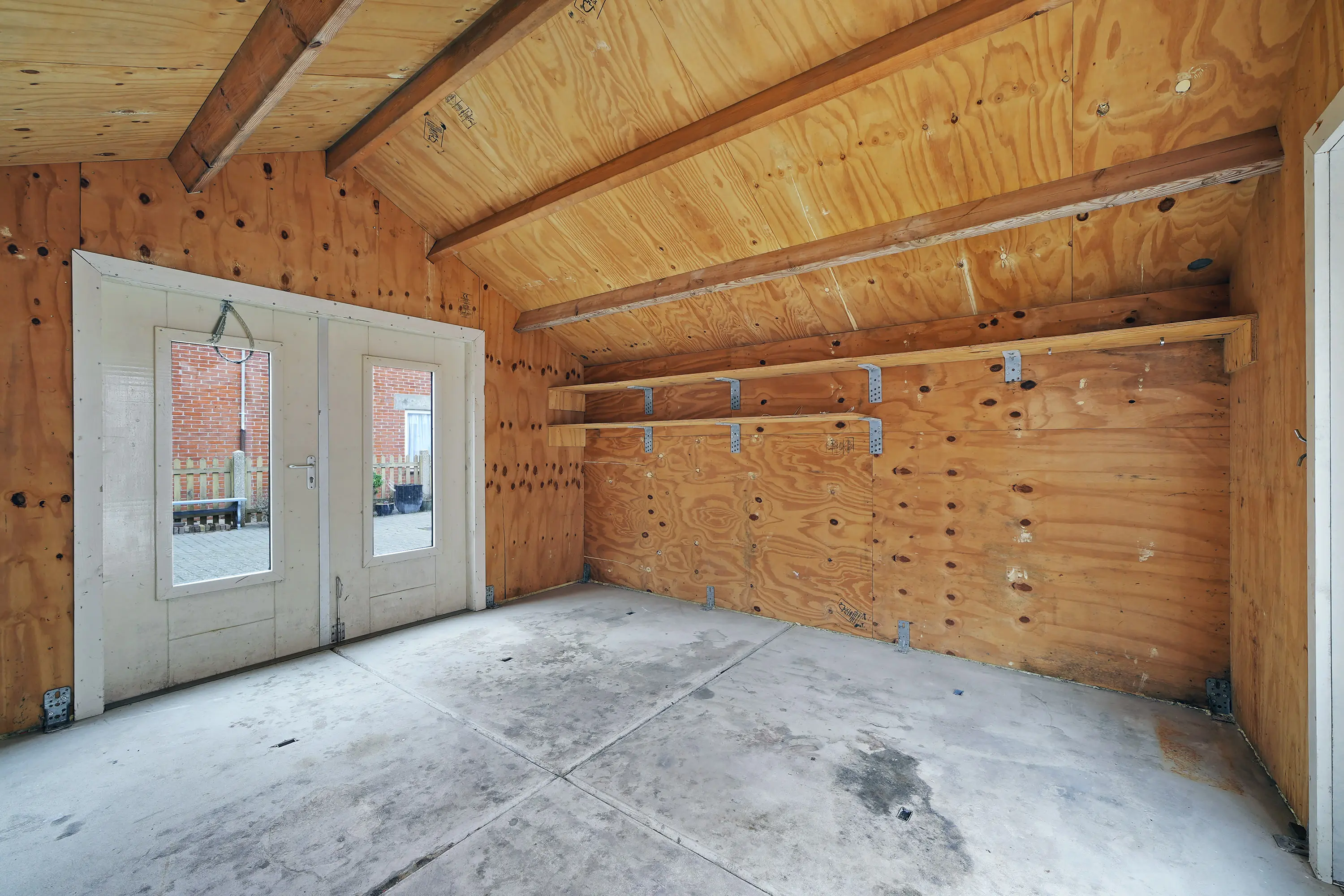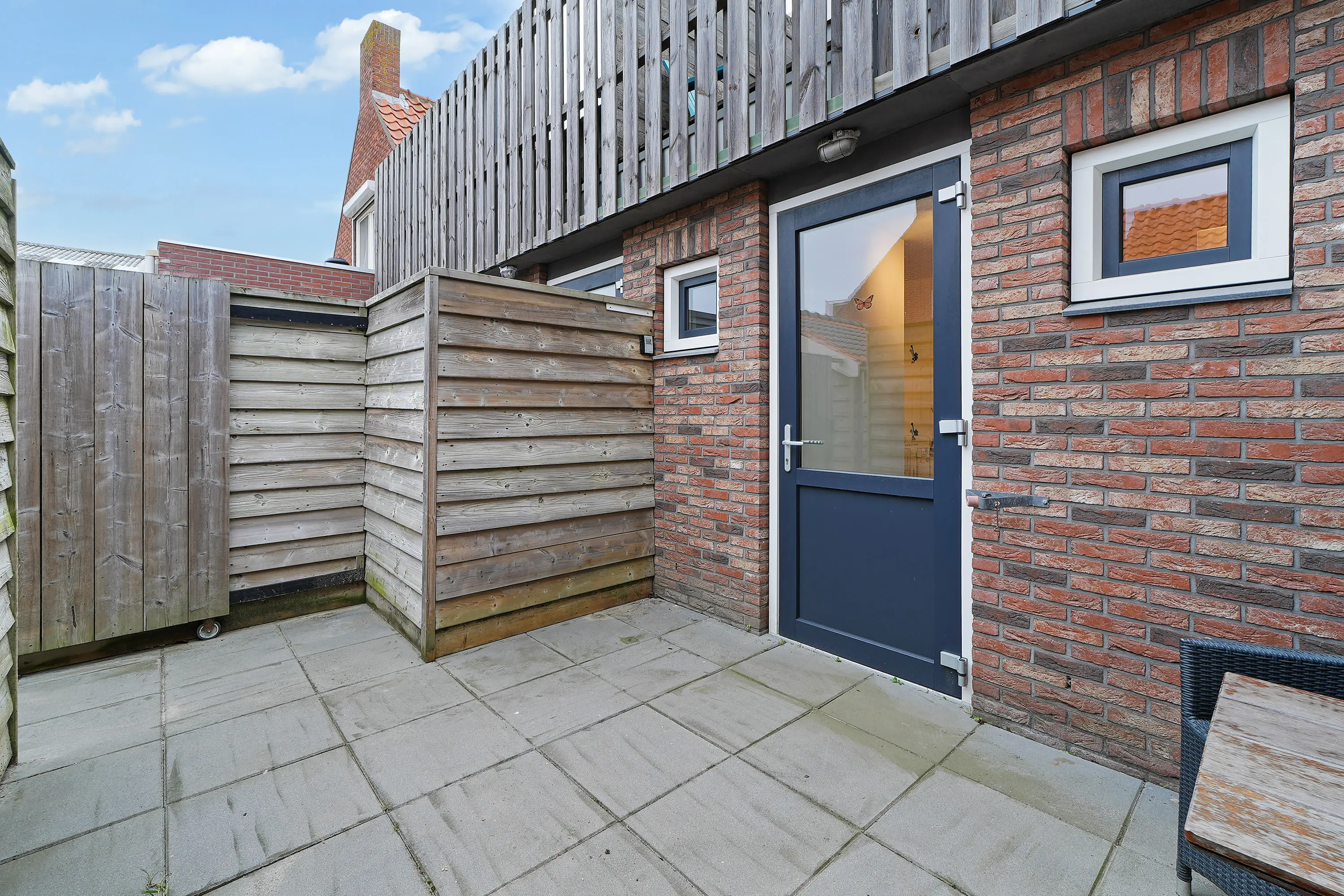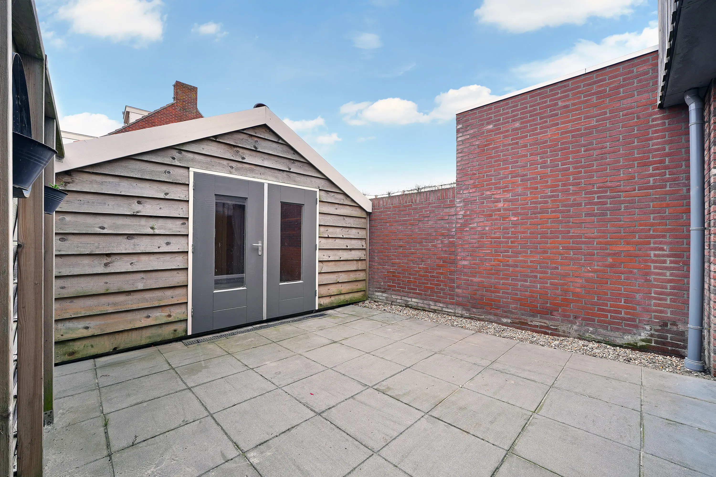 De onderhoudsvrije tuin biedt voldoende privacy en is voorzien van een ruime schuur, ideaal voor het opbergen van spullen of het stallen van fietsen.