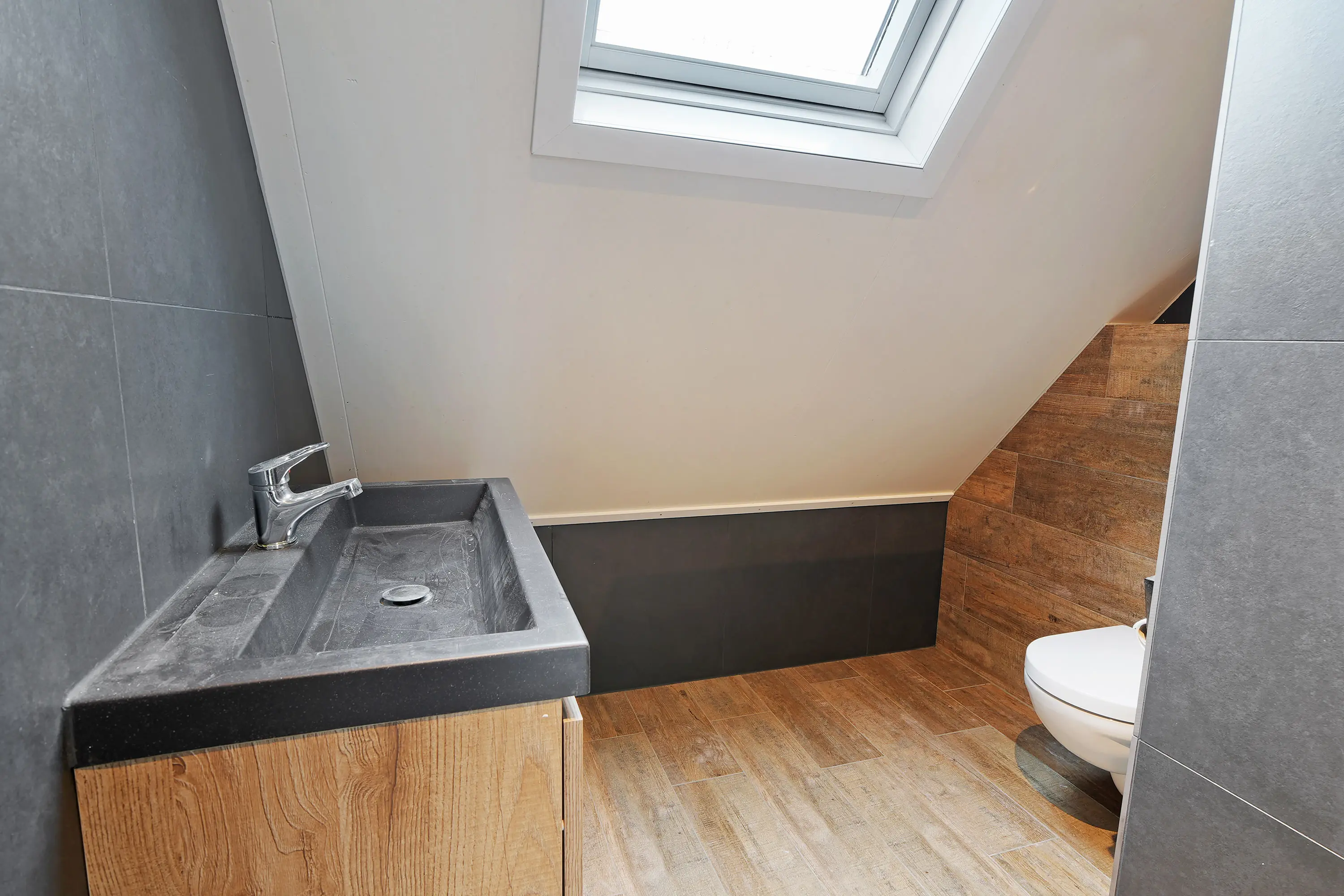 Op de verdieping van dit woongedeelte bevindt zich een ruime slaapkamer, een cv-ruimte/kast en een nette badkamer. Daarnaast beschikt deze verdieping over een royaal dakterras, bereikbaar via een schuifpui, waar u de gehele dag kunt genieten van de zon en privacy.