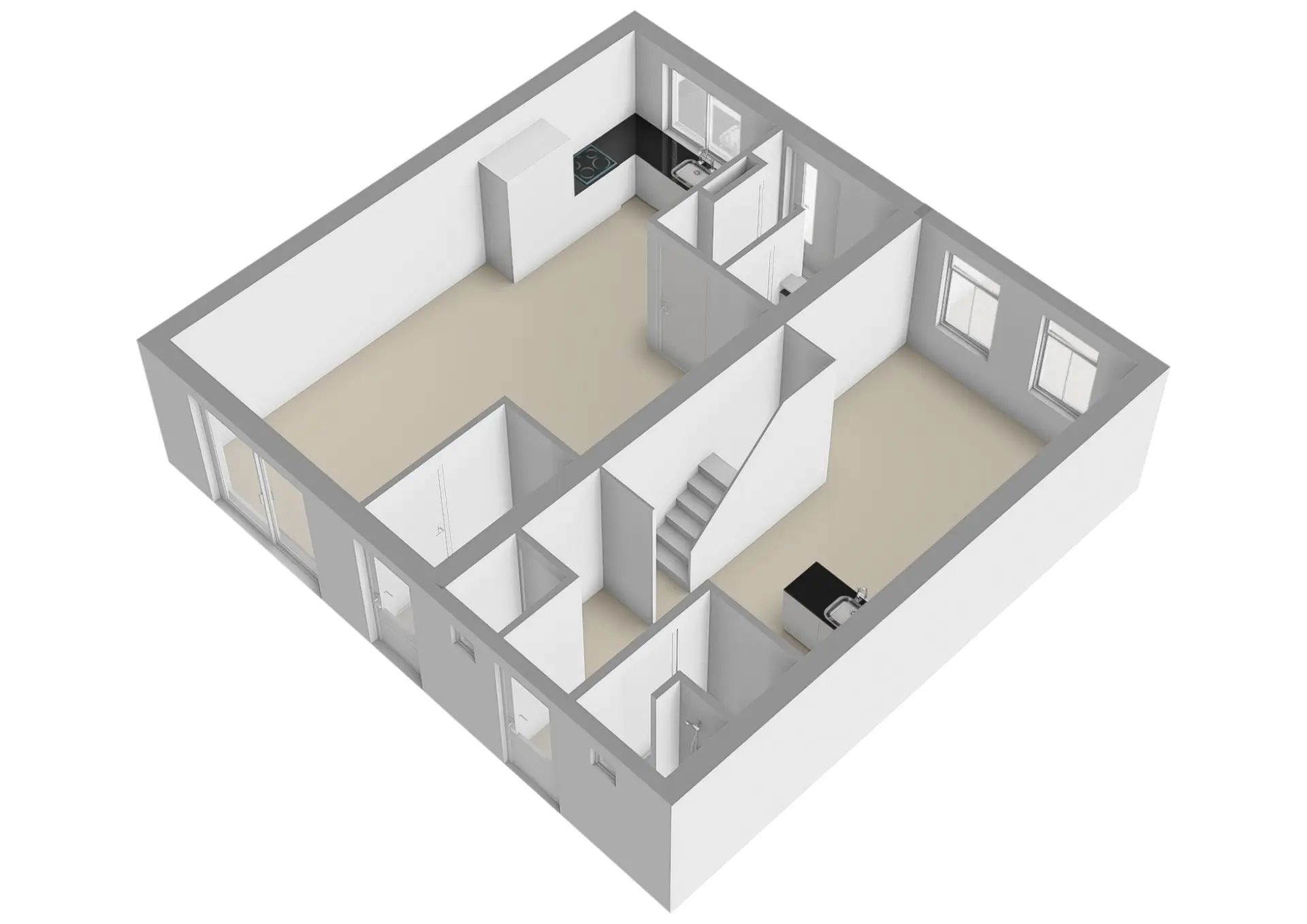 Het grootste woongedeelte is bereikbaar via de voorzijde van de woning. U komt binnen in de hal met meterkast, toiletruimte en trapopgang naar de verdieping. Vanuit de hal bereikt u het ruime en lichte woongedeelte. Aan de voorzijde bevindt zich de moderne hoekkeuken, voorzien van diverse inbouwapparatuur. De woonkamer beschikt over een schuifpui die zorgt voor veel lichtinval en een prettige verbinding met buiten. Aan de achterzijde vindt u een praktische bijkeuken met aansluitingen voor wasmachine en droger. Vanuit hier heeft u direct toegang tot de tuin.