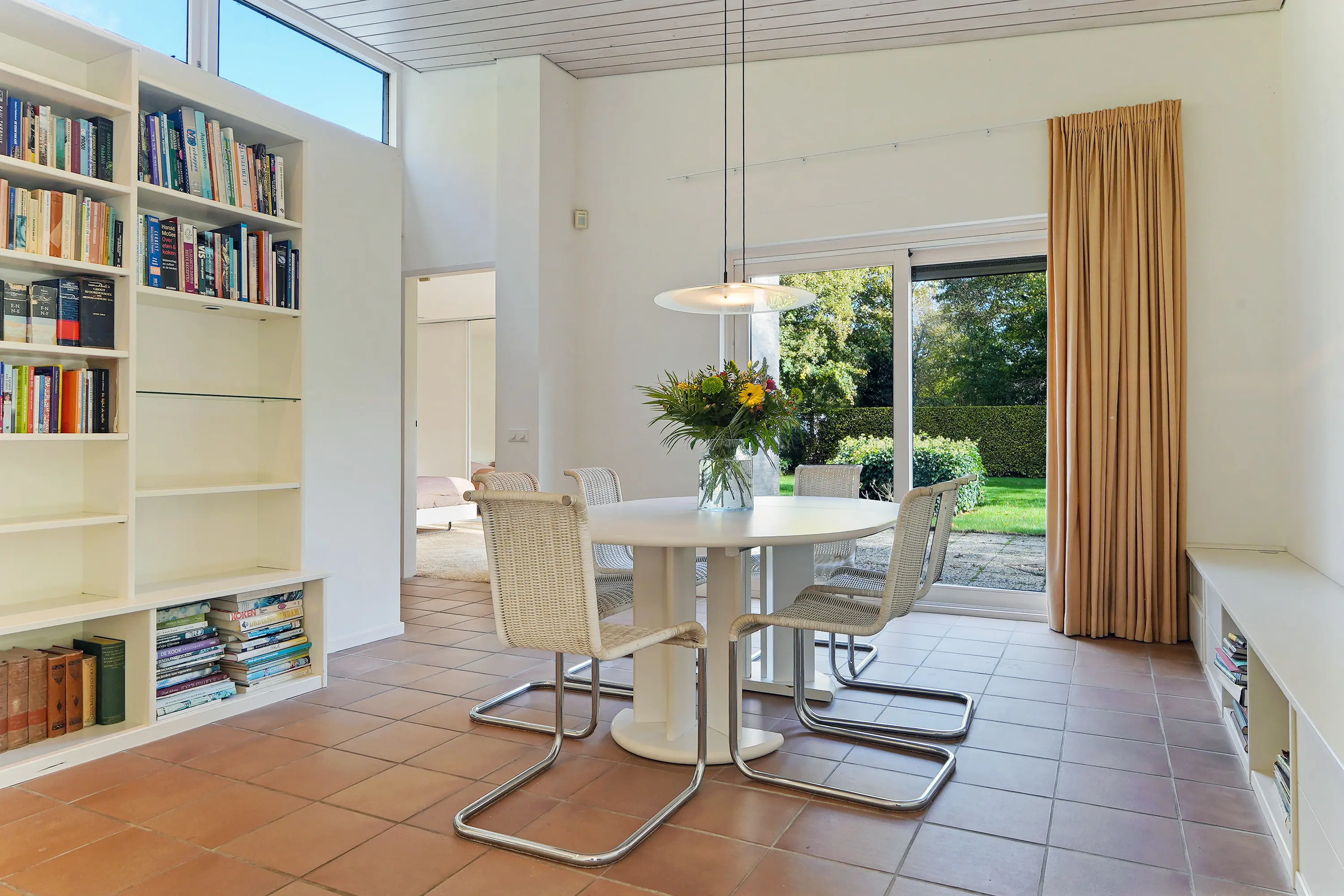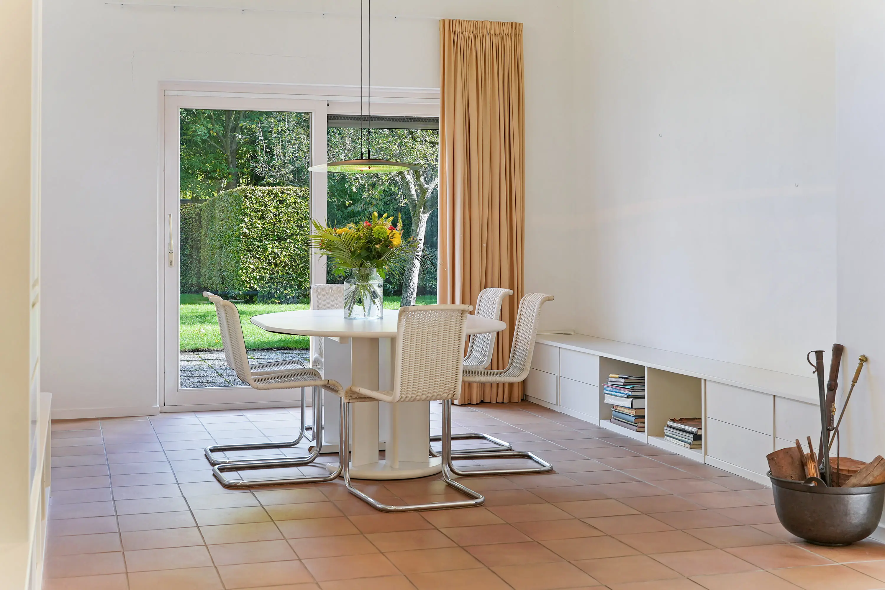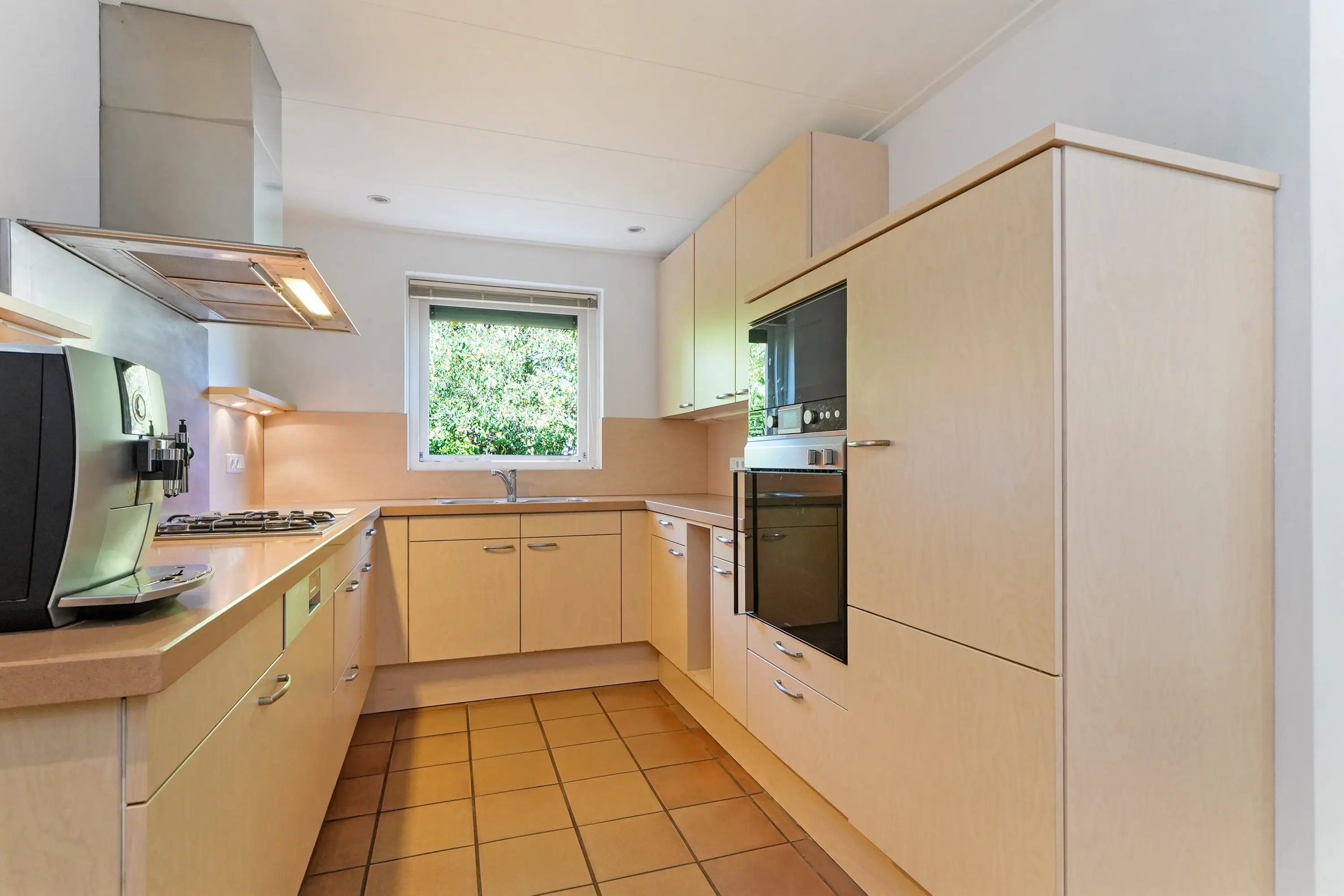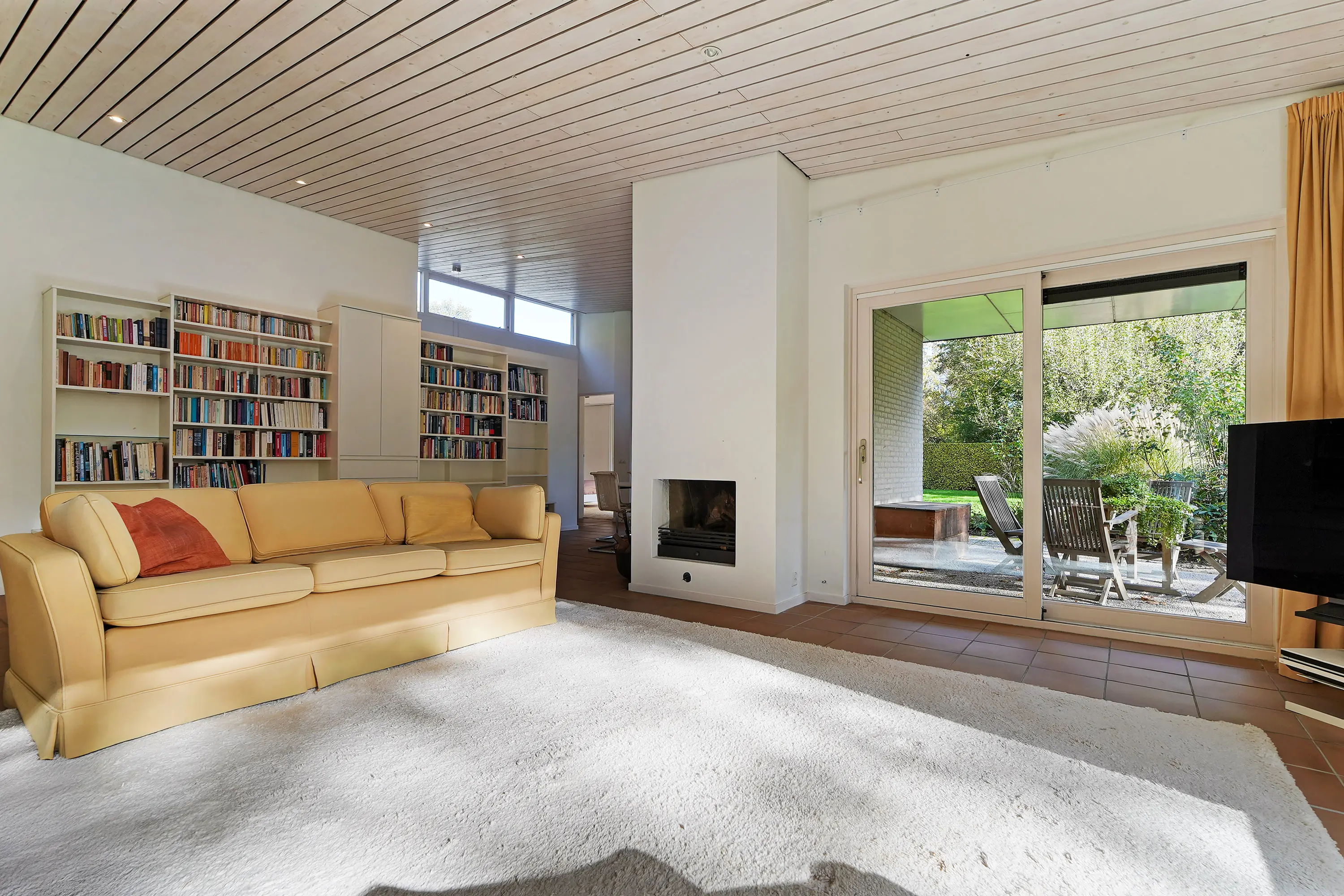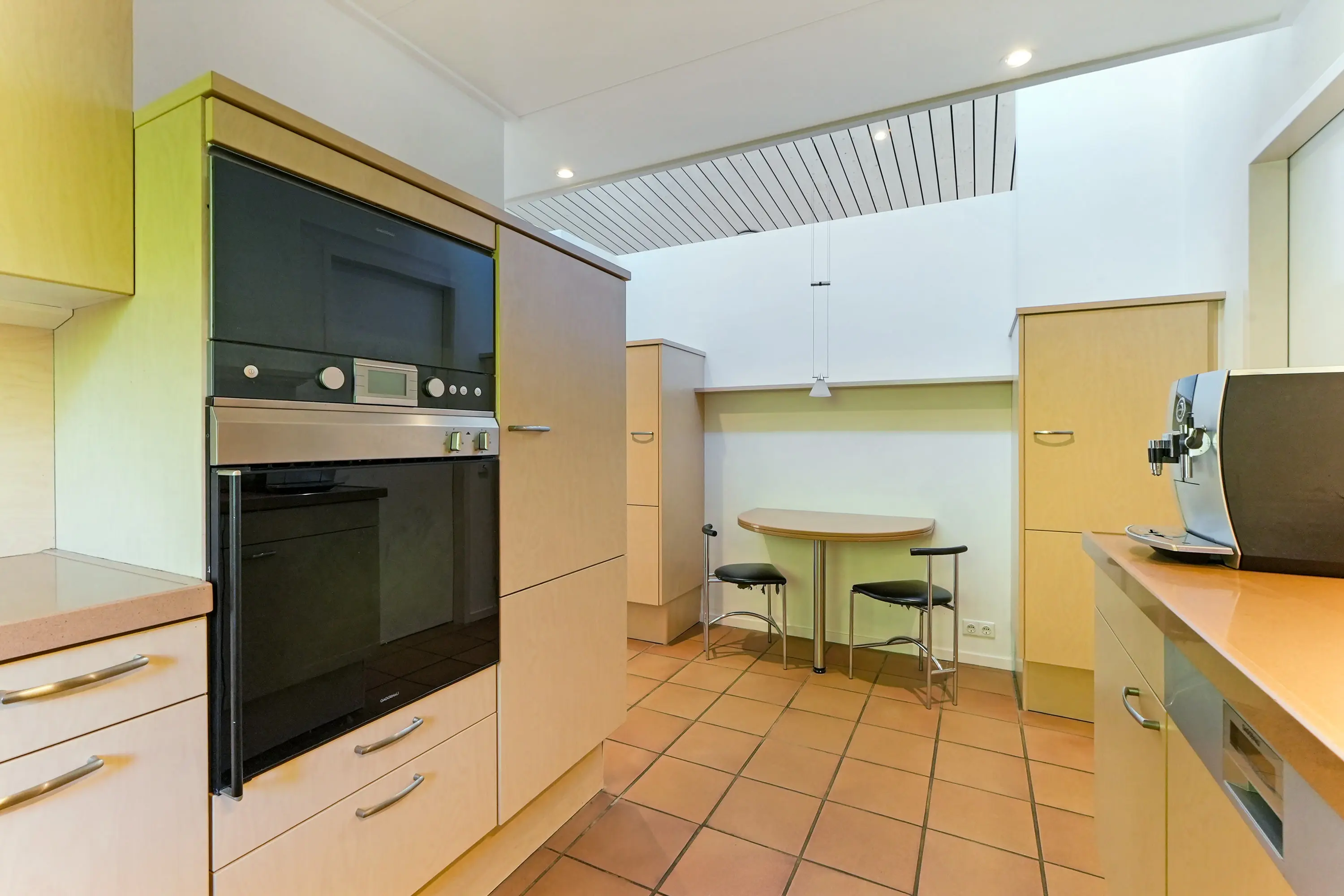 De woonkamer vormt het hart van de woning: een open, luchtige ruimte met hoge plafonds, een speelse indeling en grote raampartijen tot in de nok. De schuifpui geeft toegang tot het terras, waardoor binnen en buiten naadloos in elkaar overgaan. De halfopen keuken in U-opstelling is degelijk uitgevoerd en voorzien van inbouwapparatuur van onder meer Gaggenau.
