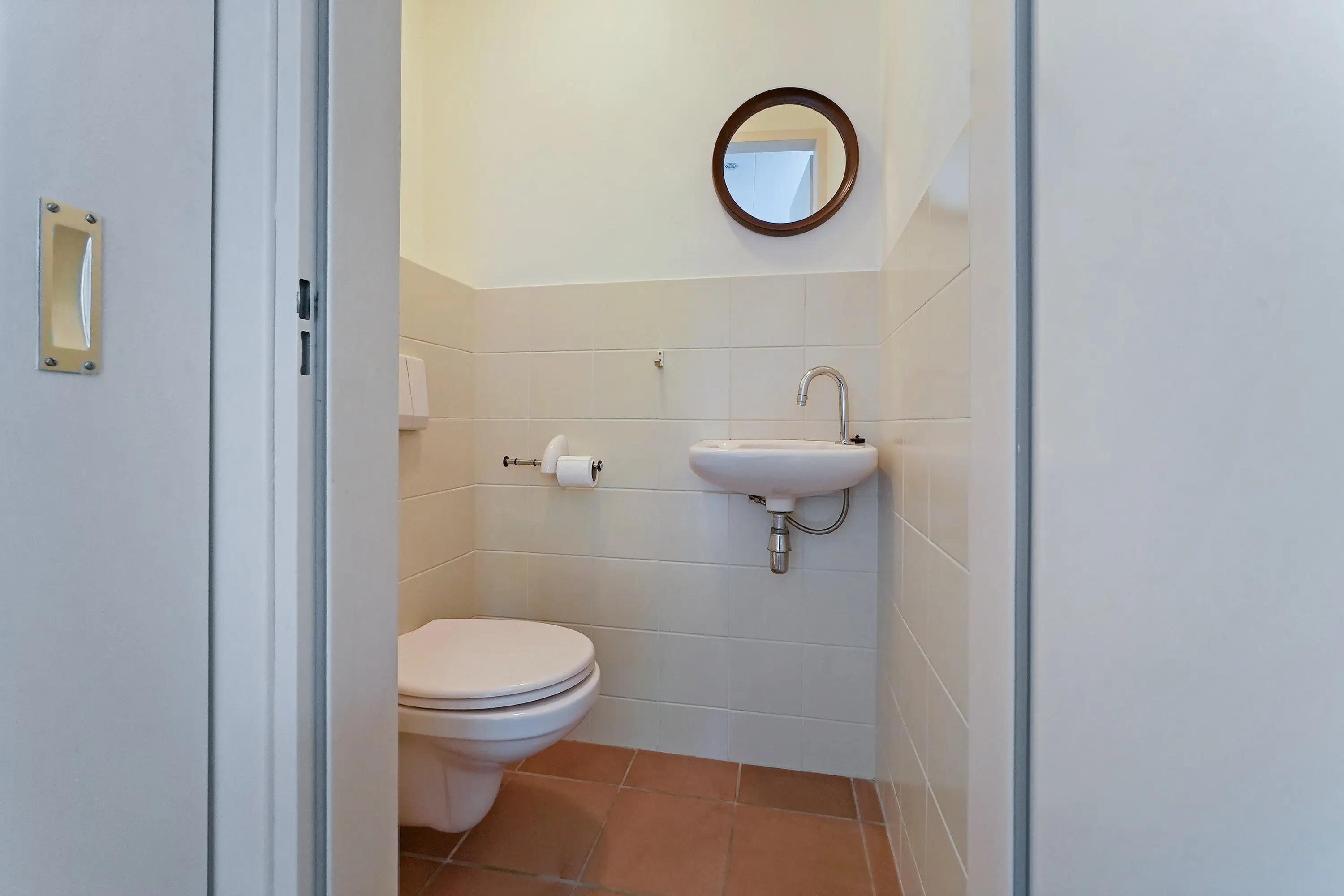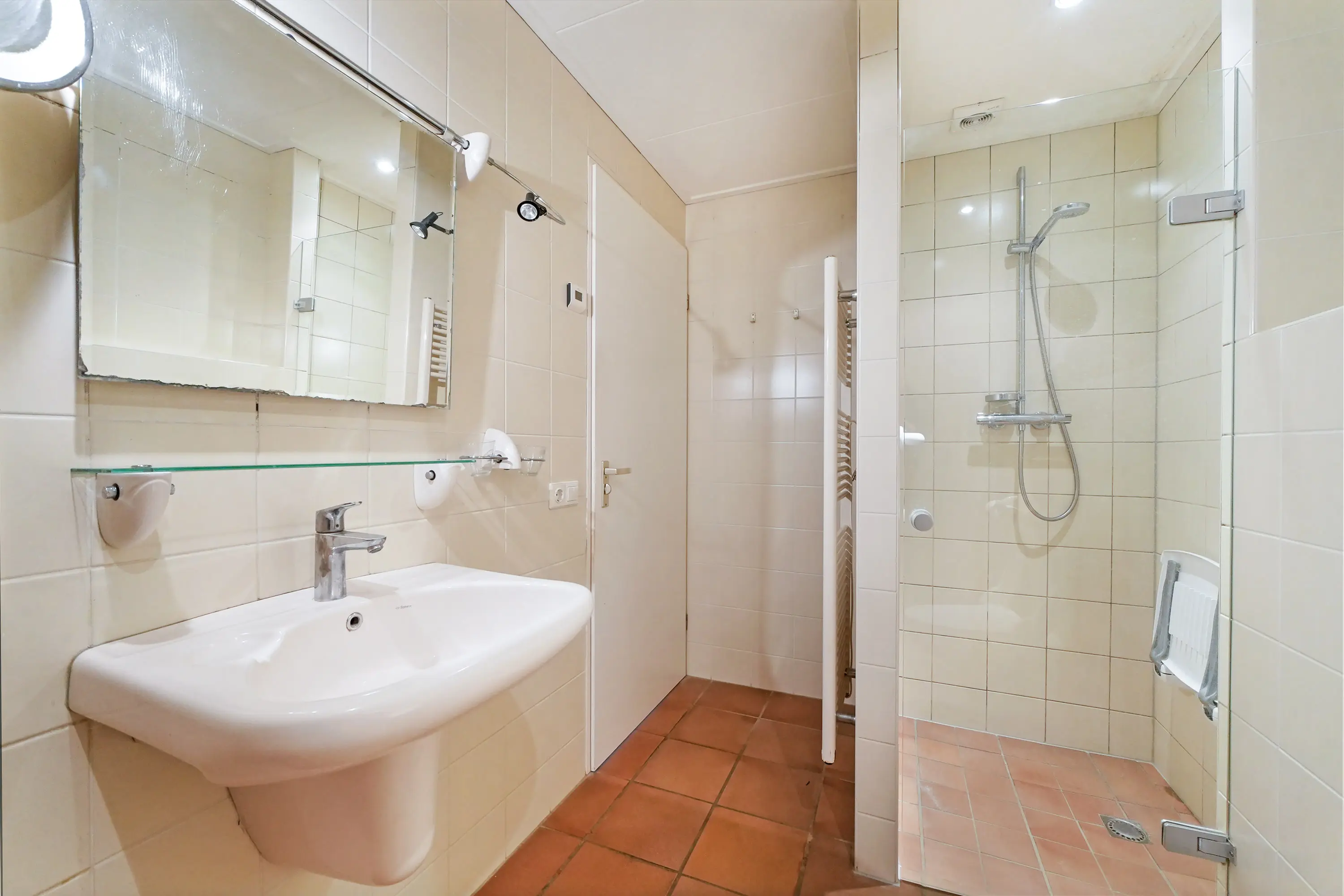 De entree van de woning bevindt zich in een ruime, lichte hal met lichtkoepel. Hier vindt u de meterkast (9 groepen), garderobe en het toilet met fontein. Aan de rechterzijde van de hal liggen twee ruime slaapkamers, met daartussen een nette badkamer voorzien van douche en wastafel. Beide slaapkamers zijn uitgerust met vloerverwarming die oorspronkelijk per kamer regelbaar was.