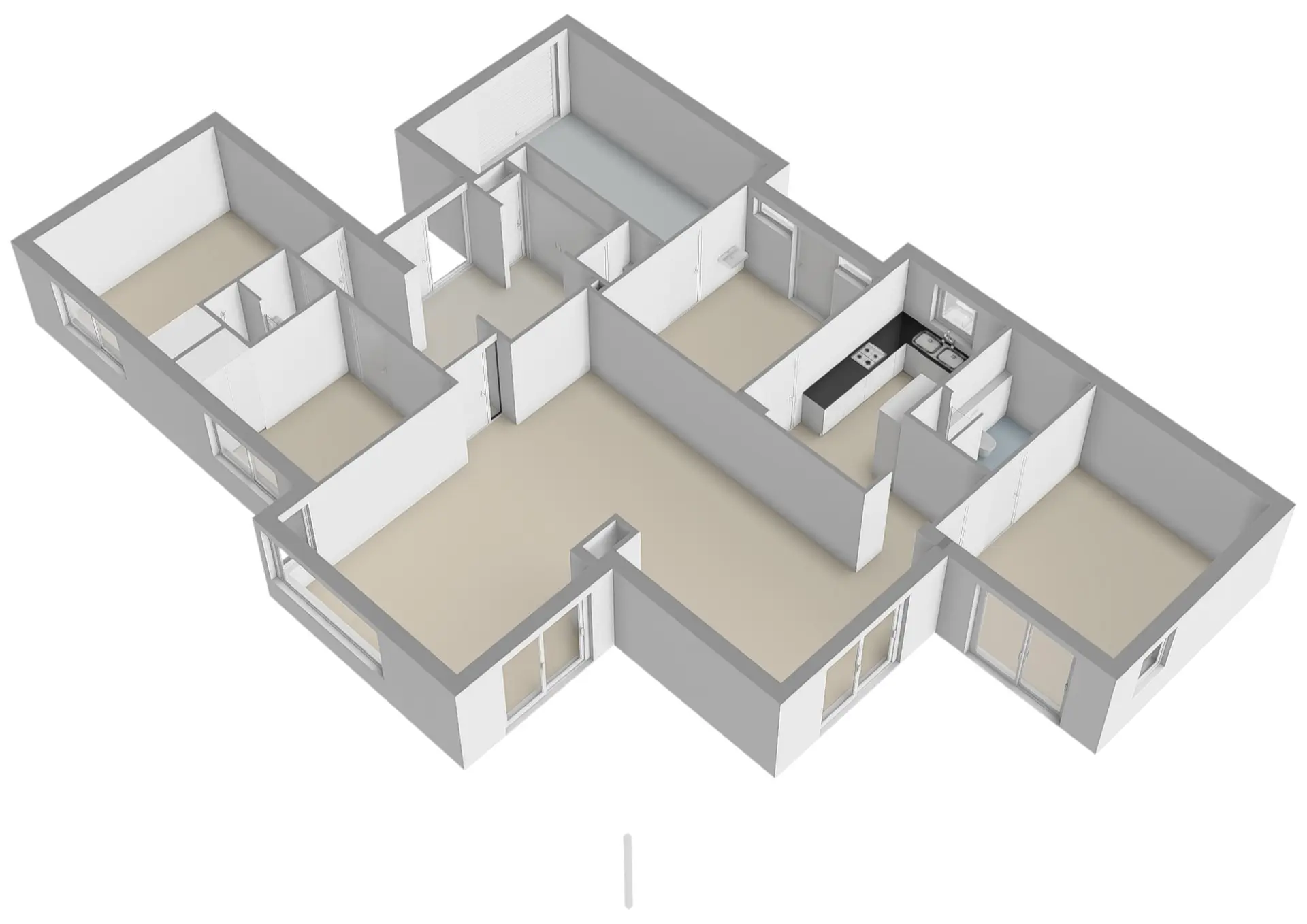 De bijkeuken grenst aan de keuken en biedt ruimte voor wasapparatuur, opbergkasten, de cv-installatie en de vloerverwarmingsverdeler. Vanuit hier bereikt u zowel de tuin als de inpandige garage.